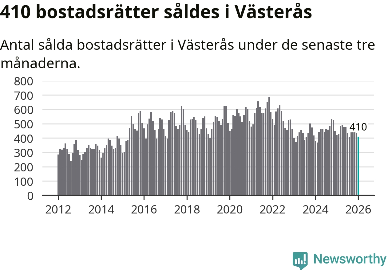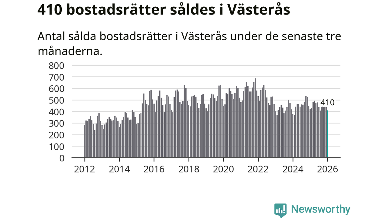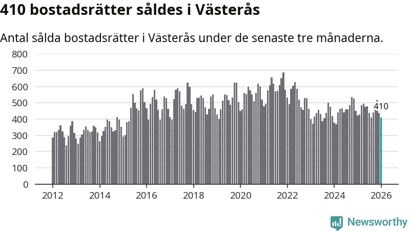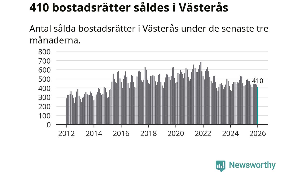Sammanlagt såldes 410 bostadsrätter i Västerås kommun mellan november och januari till ett genomsnittligt pris på 1,8 miljoner kronor. I fjol gjordes 423 affärer vid den här tiden på året.