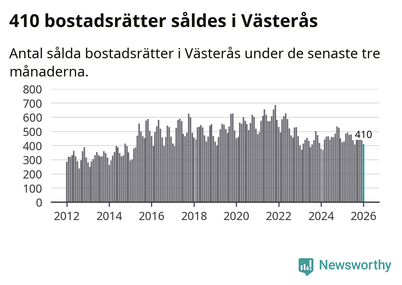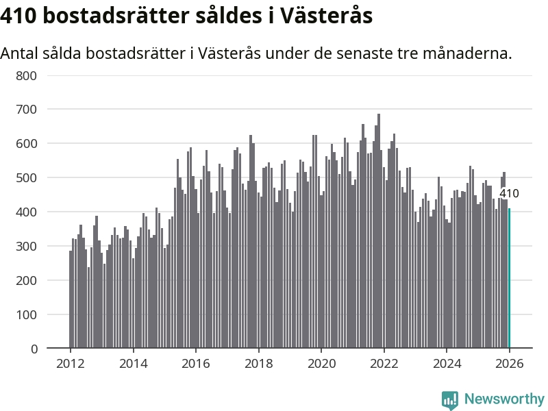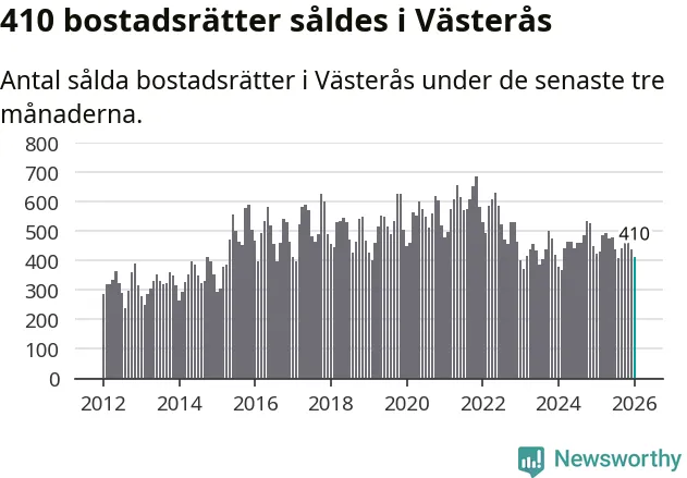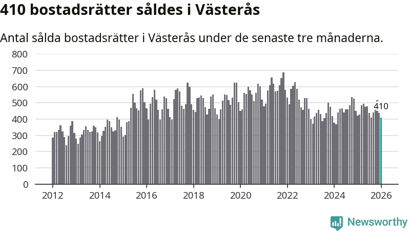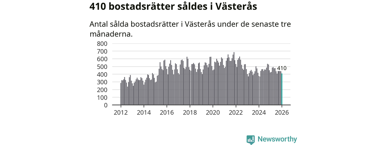 Sammanlagt såldes 410 bostadsrätter i Västerås kommun mellan november och januari till ett genomsnittligt pris på 1,8 miljoner kronor. I fjol gjordes 423 affärer vid den här tiden på året.