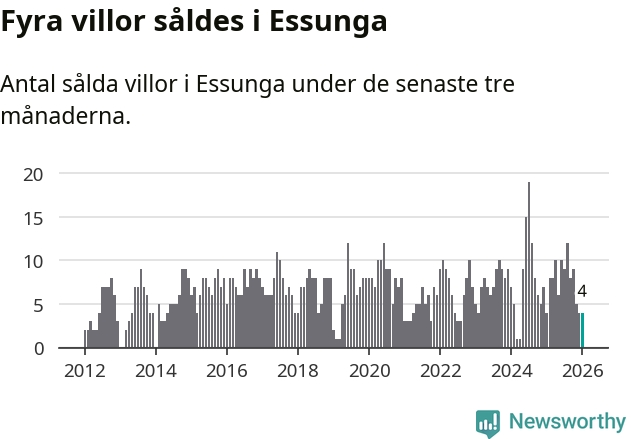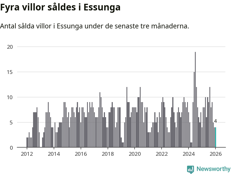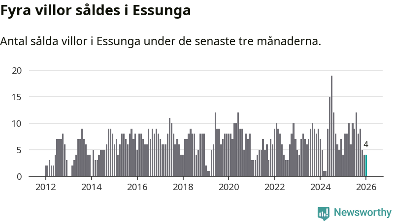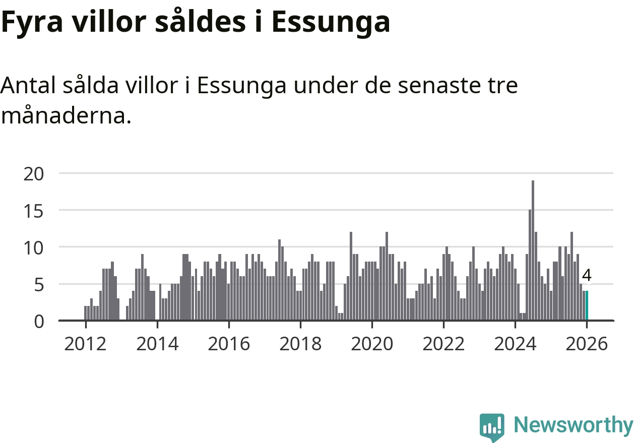 Mellan november och januari gjordes sammanlagt fyra affärer med villor i Essunga kommun. Det är lika många affärer som vid motsvarande tid i fjol.