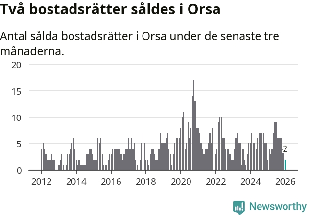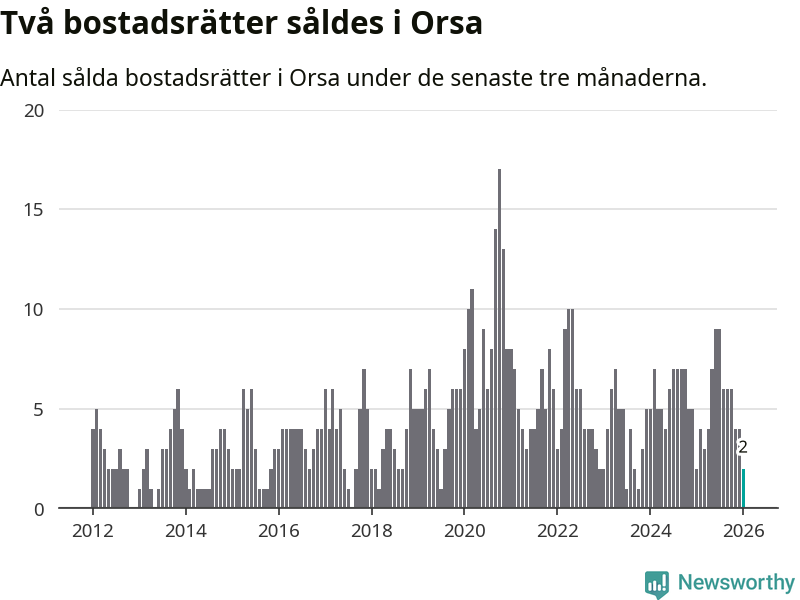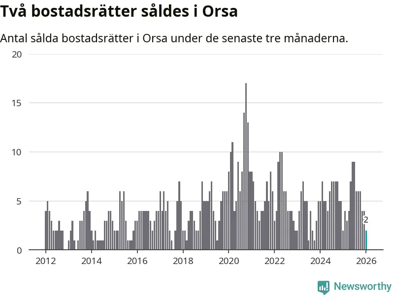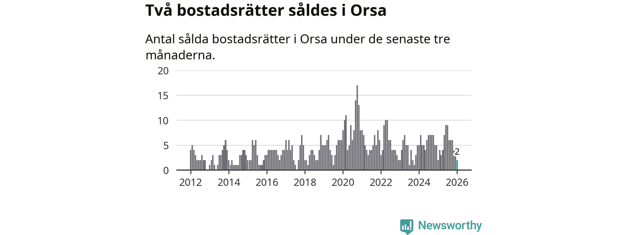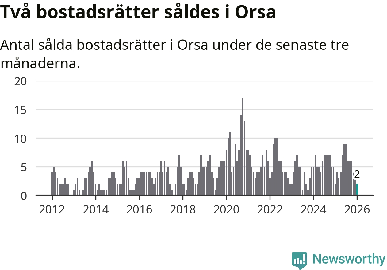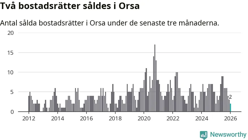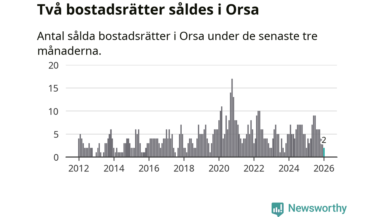 Mellan november och januari gjordes sammanlagt två affärer med bostadsrätter i Orsa kommun. Det är lika många affärer som vid motsvarande tid i fjol.