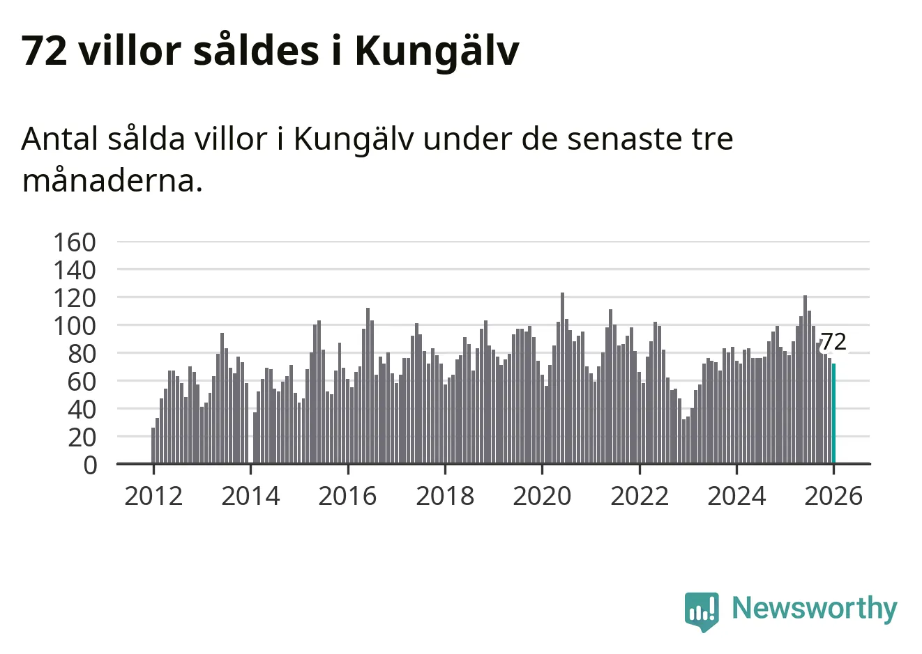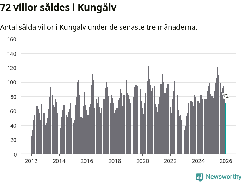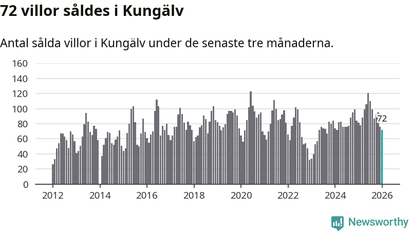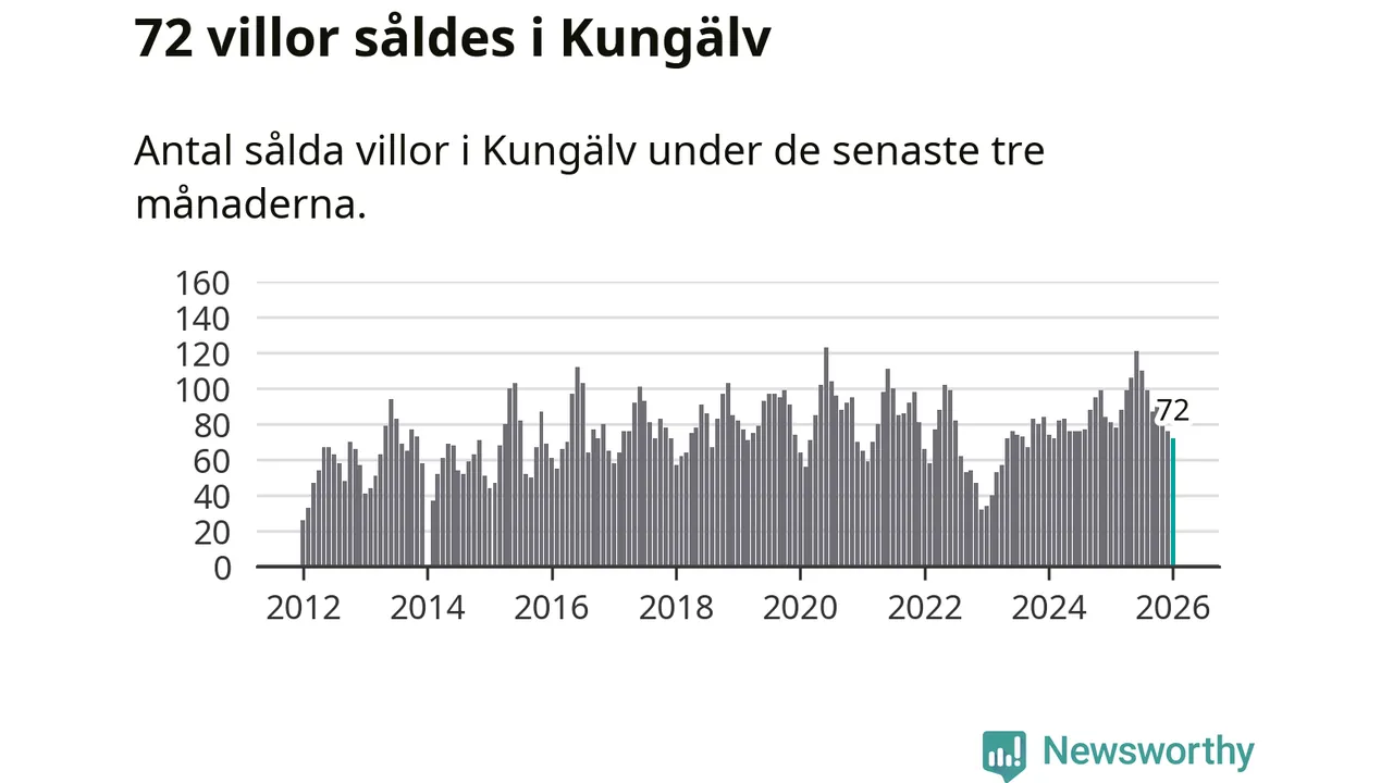 Sammanlagt såldes 72 villor i Kungälvs kommun mellan november och januari till ett genomsnittligt pris på 5,4 miljoner kronor. I fjol gjordes 81 affärer vid den här tiden på året.