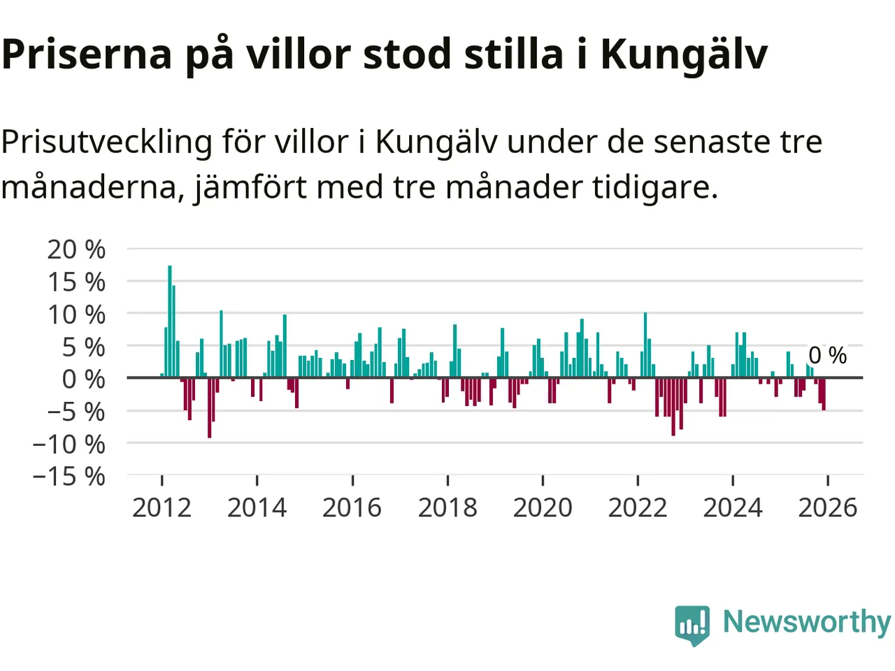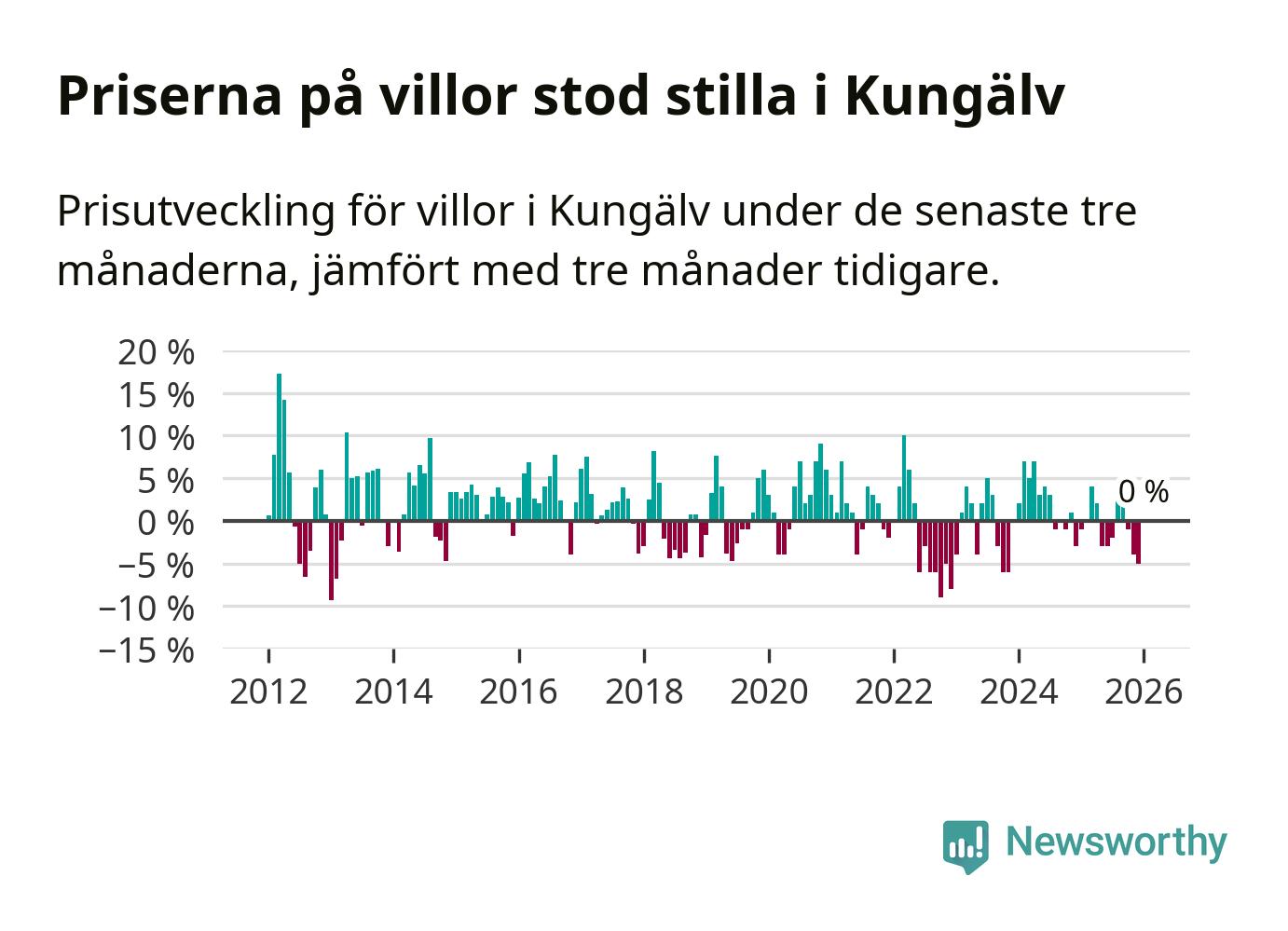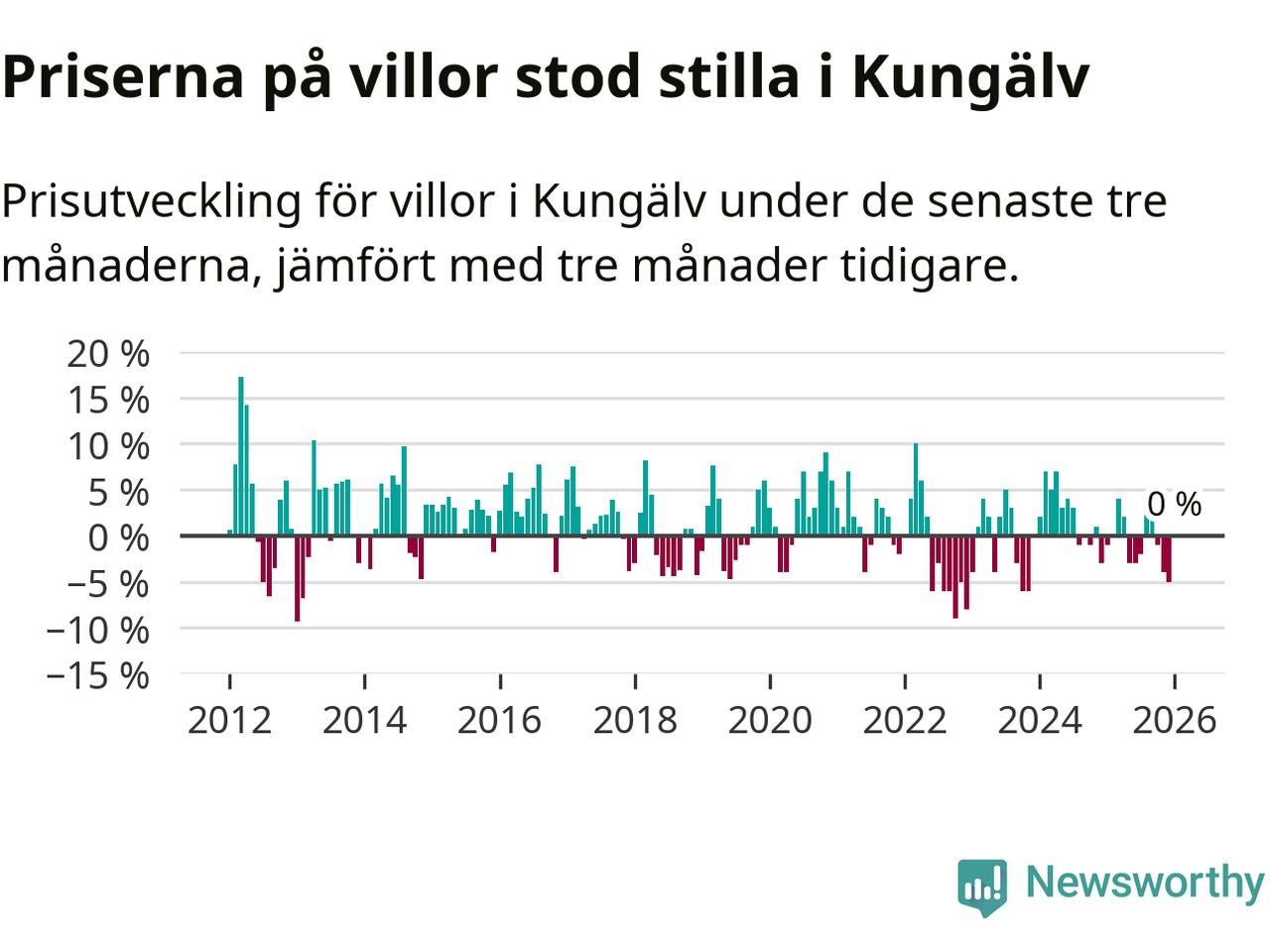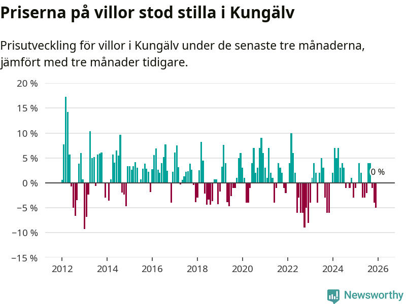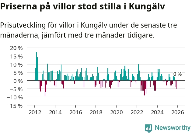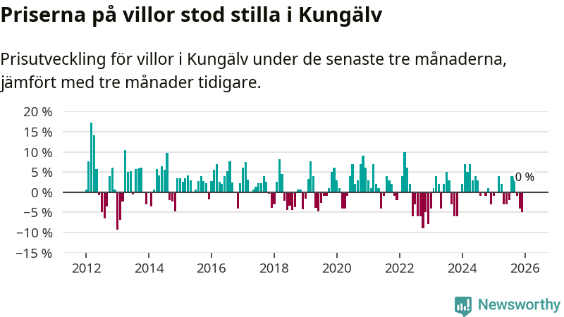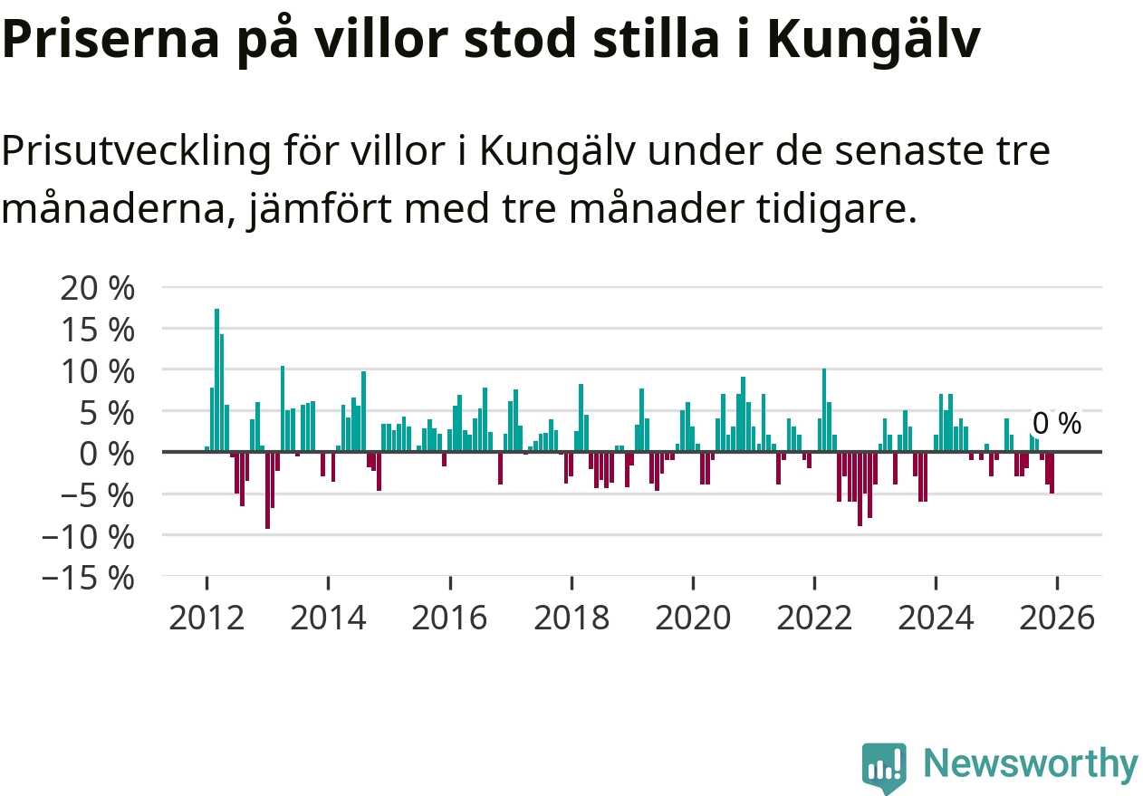 Villapriserna står i stort sett stilla i Kungälvs kommun. Medelpriset på de på försäljningarna under de senaste tre månaderna låg på samma nivå som för tre månader sedan.