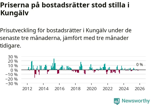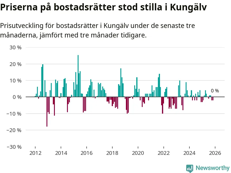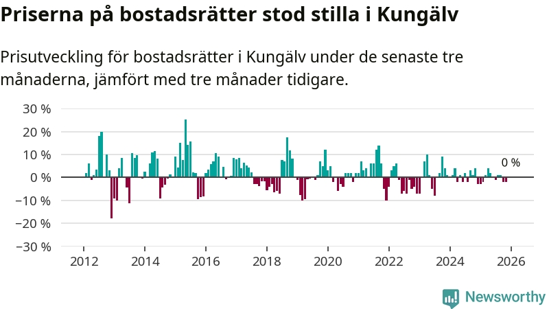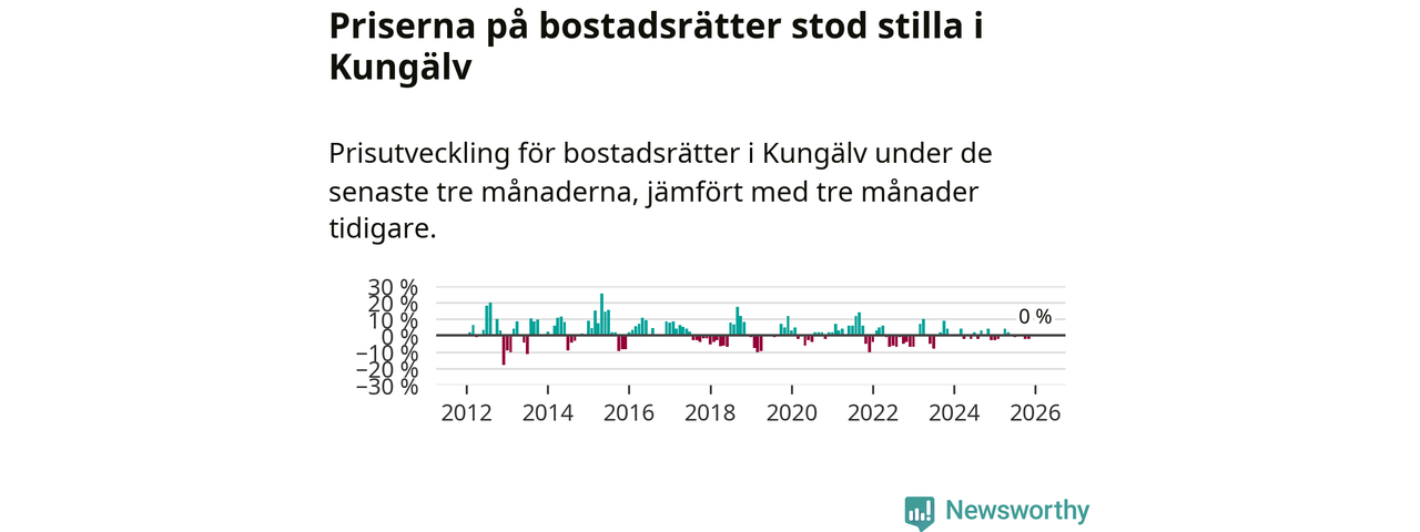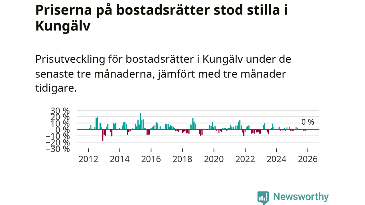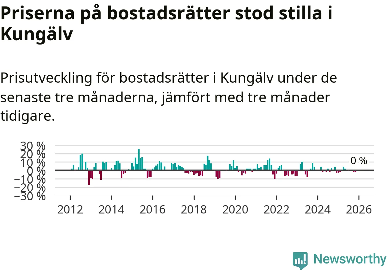 Priserna på bostadsrätter står i stort sett stilla i Kungälvs kommun. Medelpriset på de på försäljningarna under de senaste tre månaderna låg på samma nivå som för tre månader sedan.
