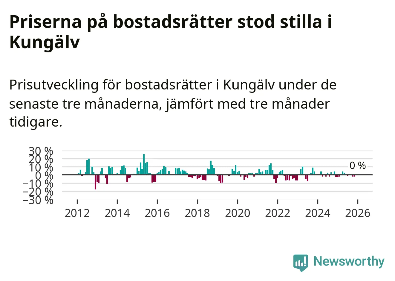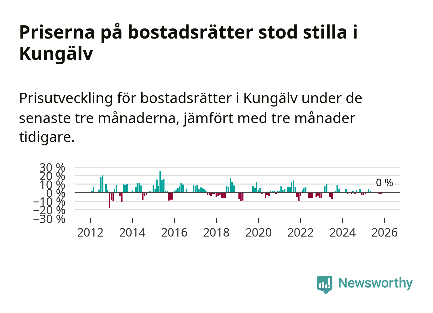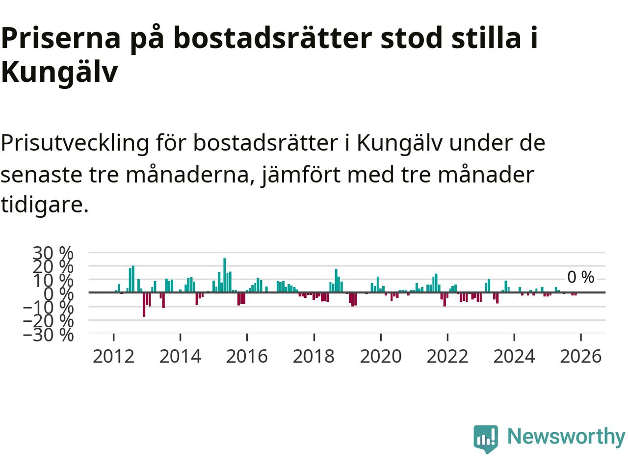 Priserna på bostadsrätter står i stort sett stilla i Kungälvs kommun. Medelpriset på de på försäljningarna under de senaste tre månaderna låg på samma nivå som för tre månader sedan.