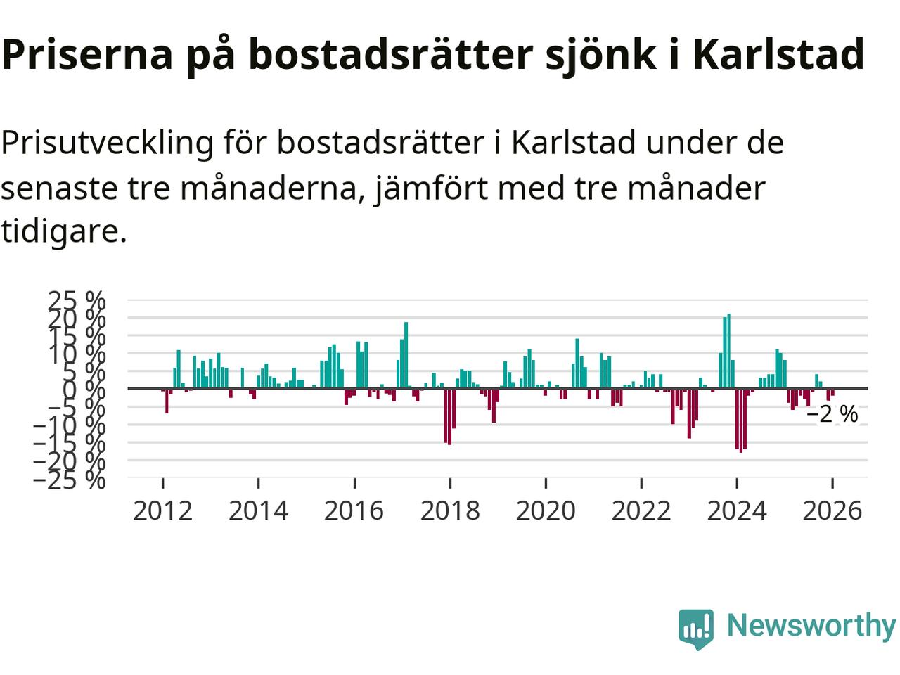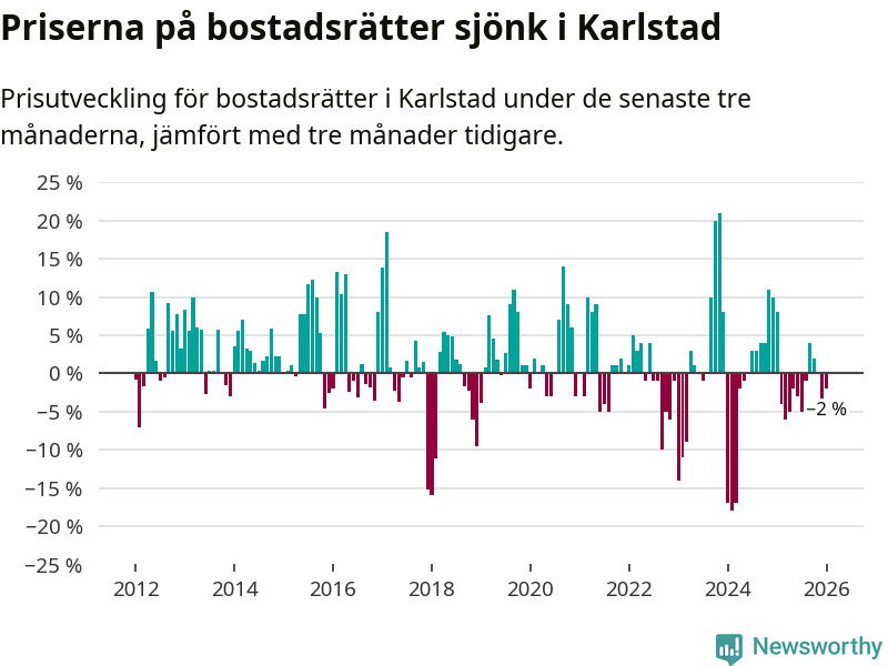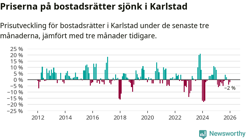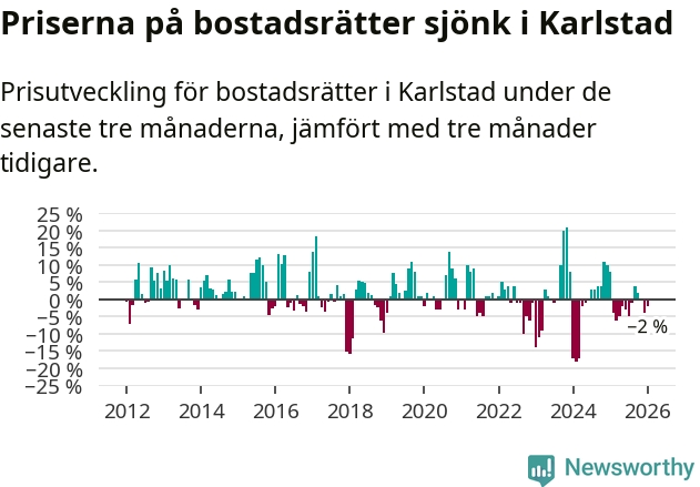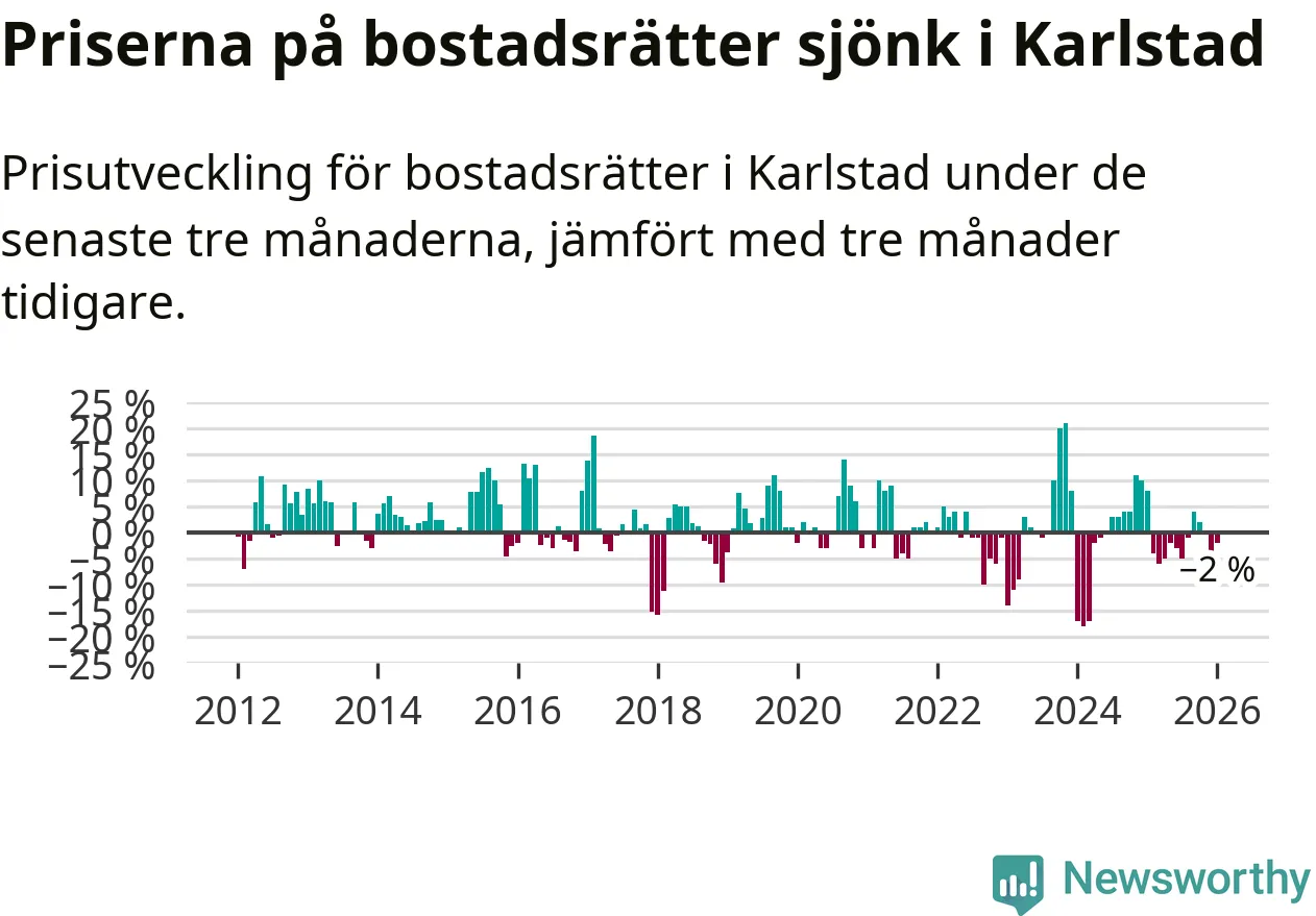 Priserna på bostadsrätter har gått ner i Karlstads kommun. Medelpriset på försäljningarna under de senaste tre månaderna visar på en nedgång med 2 procent.