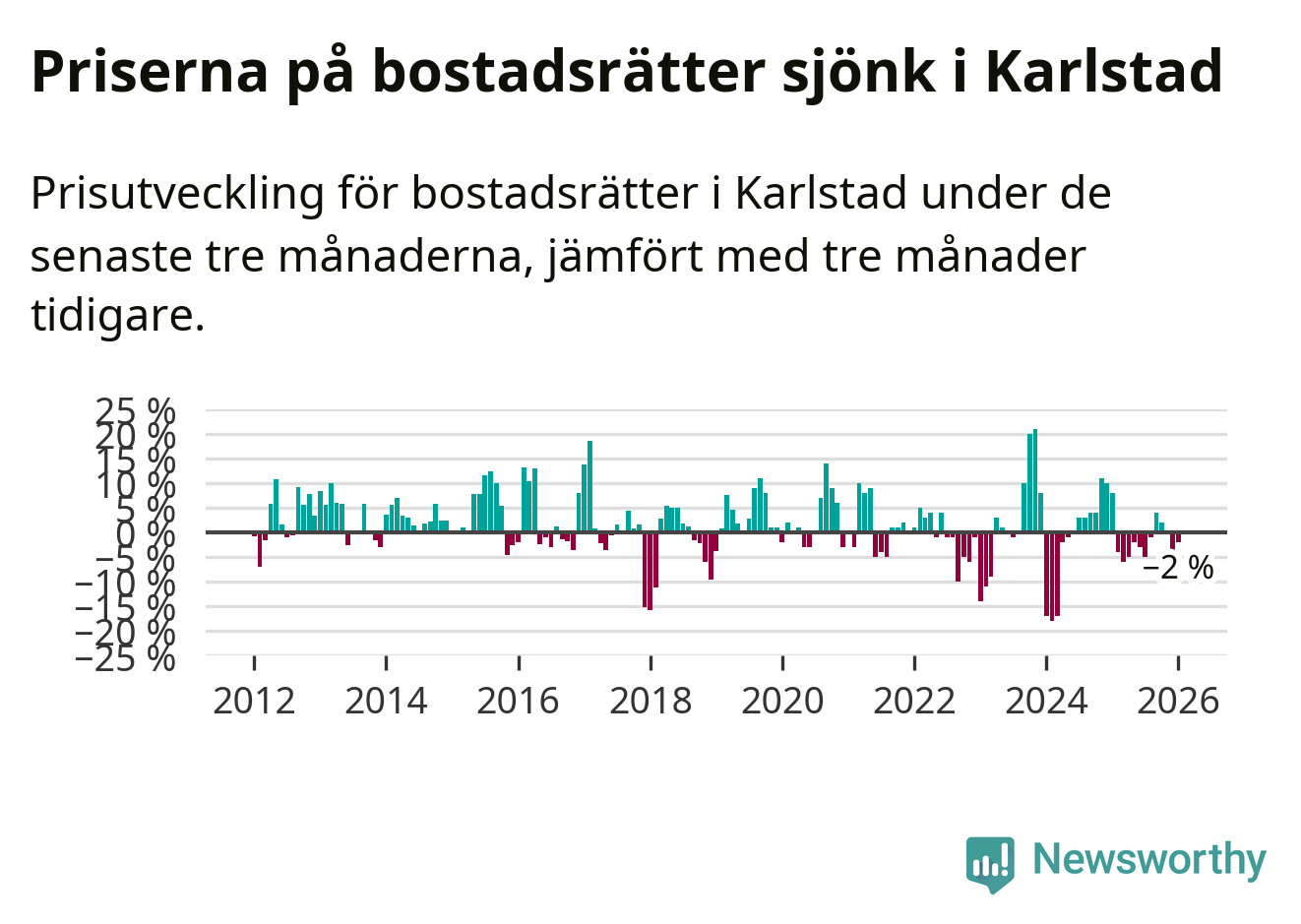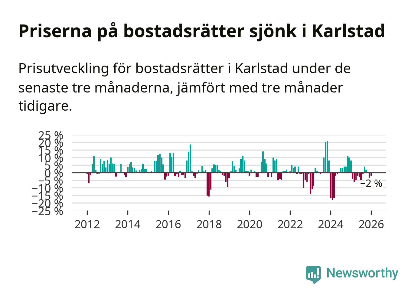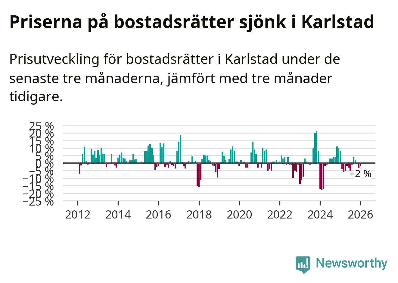 Priserna på bostadsrätter har gått ner i Karlstads kommun. Medelpriset på försäljningarna under de senaste tre månaderna visar på en nedgång med 2 procent.