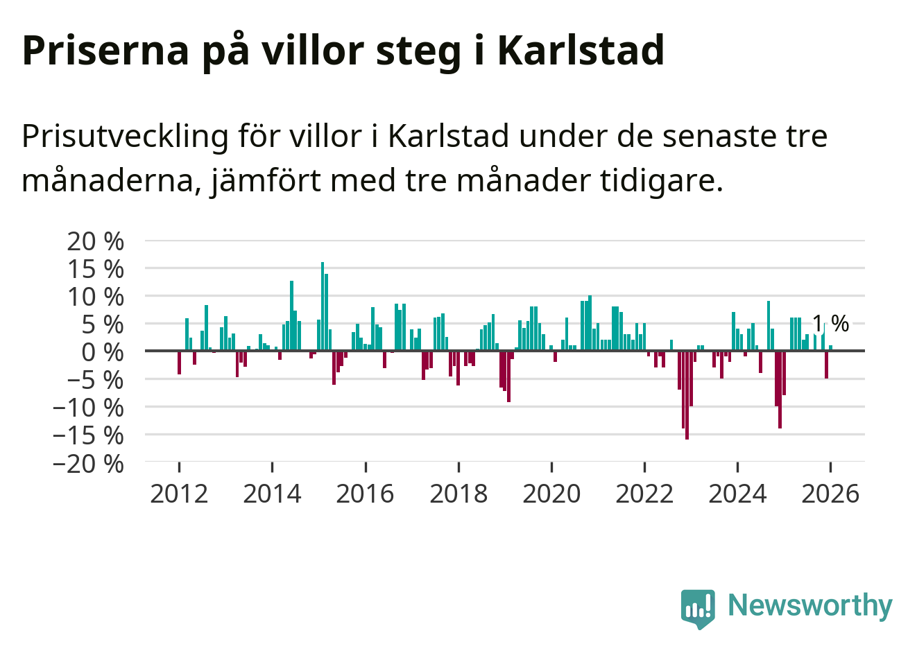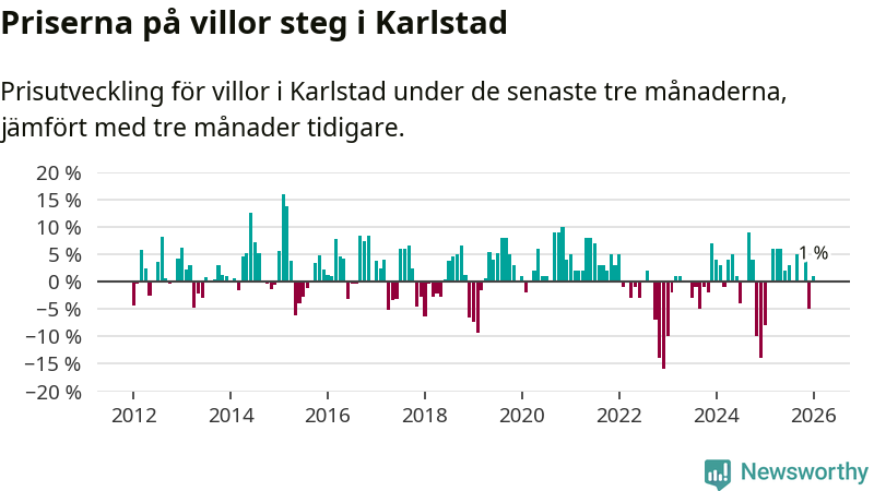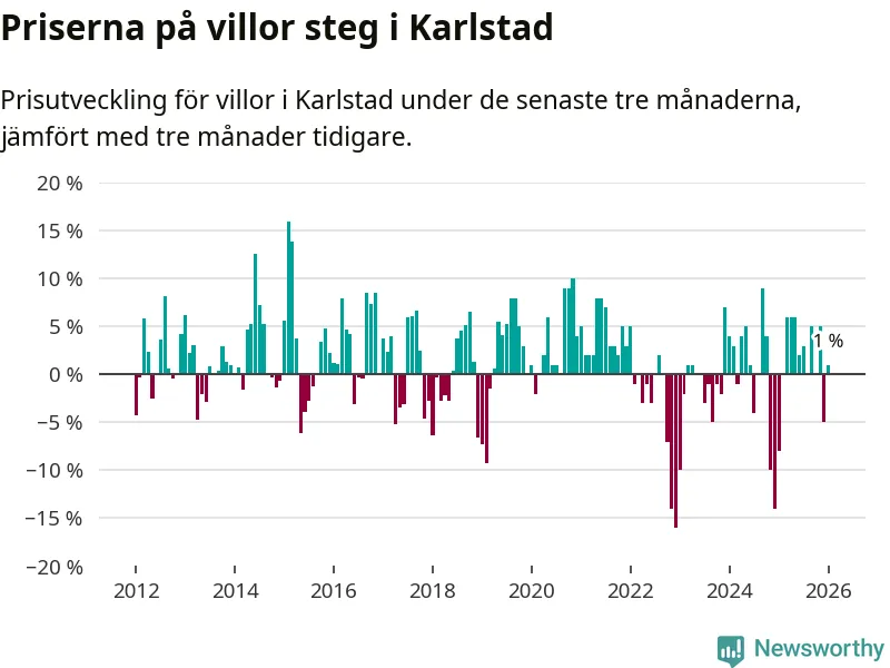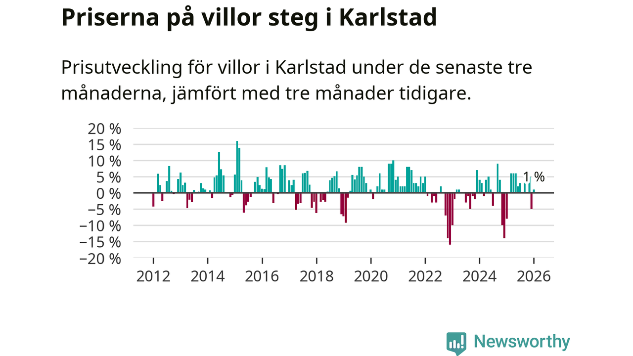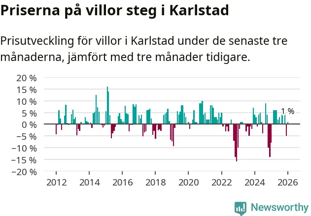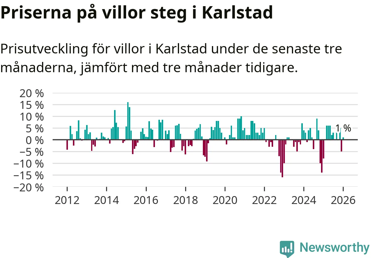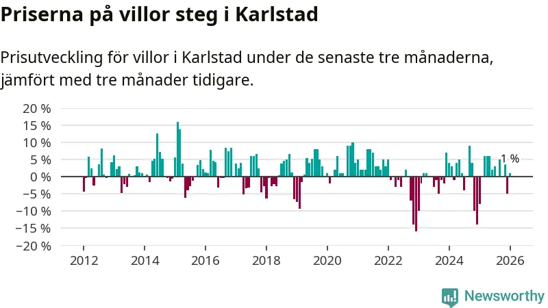 Villapriserna har gått upp i Karlstads kommun. Medelpriset på försäljningarna under de senaste tre månaderna visar på en uppgång med 1 procent.