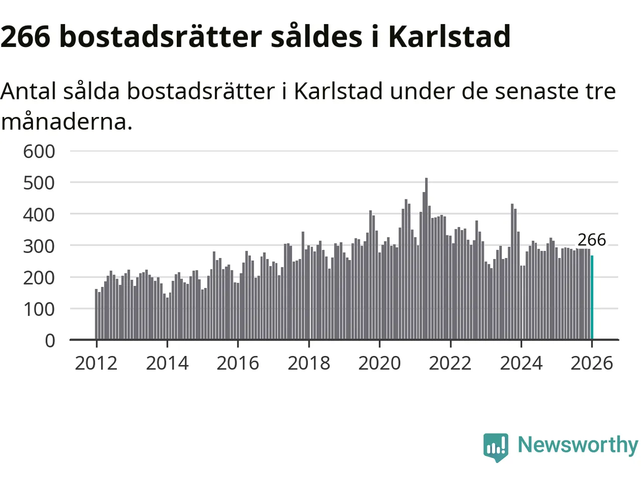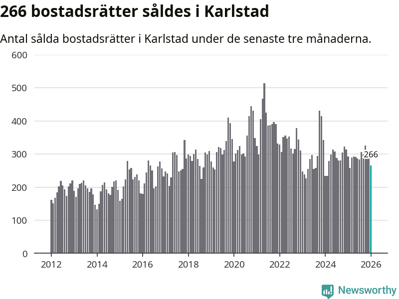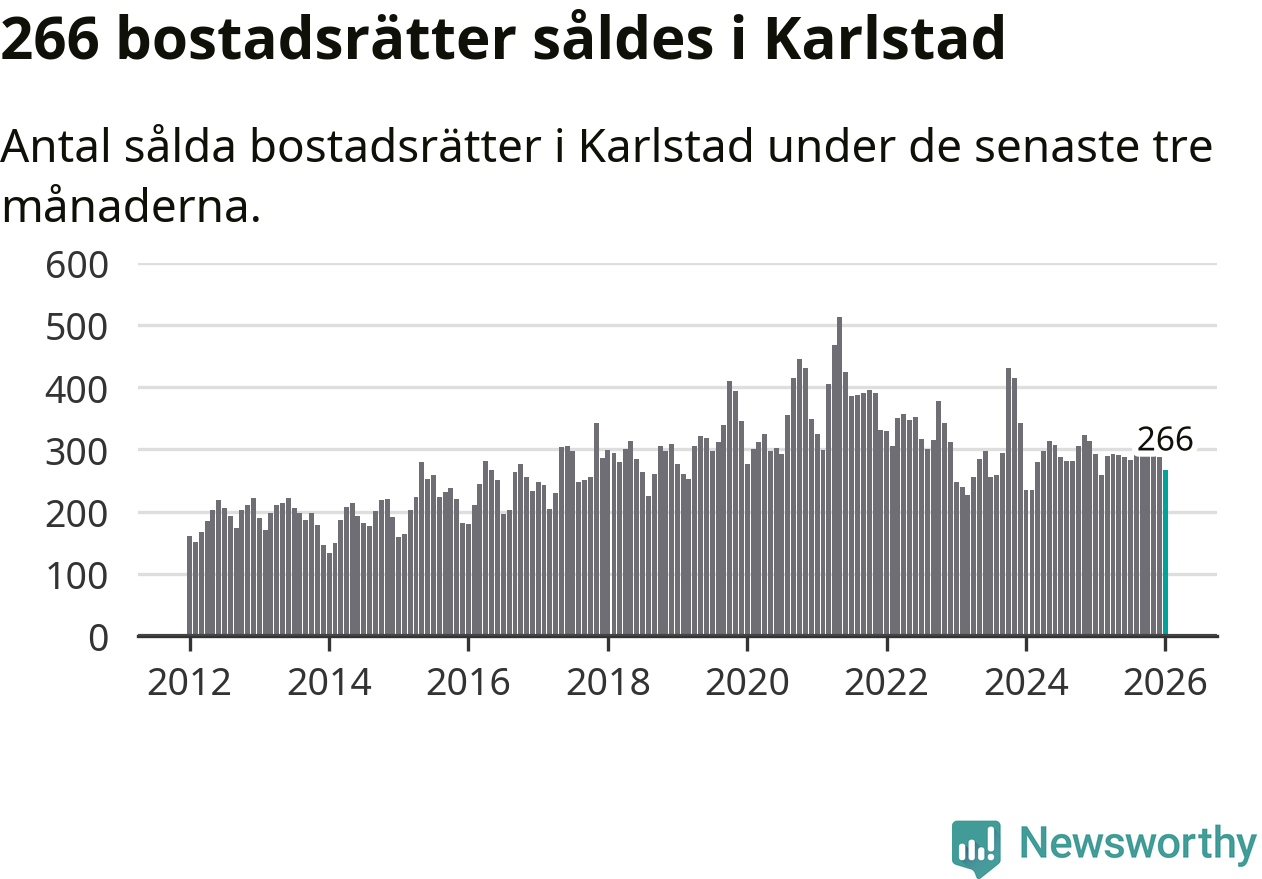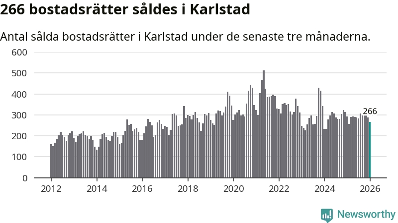 Sammanlagt såldes 266 bostadsrätter i Karlstads kommun mellan november och januari till ett genomsnittligt pris på 1,9 miljoner kronor. I fjol gjordes 292 affärer vid den här tiden på året.