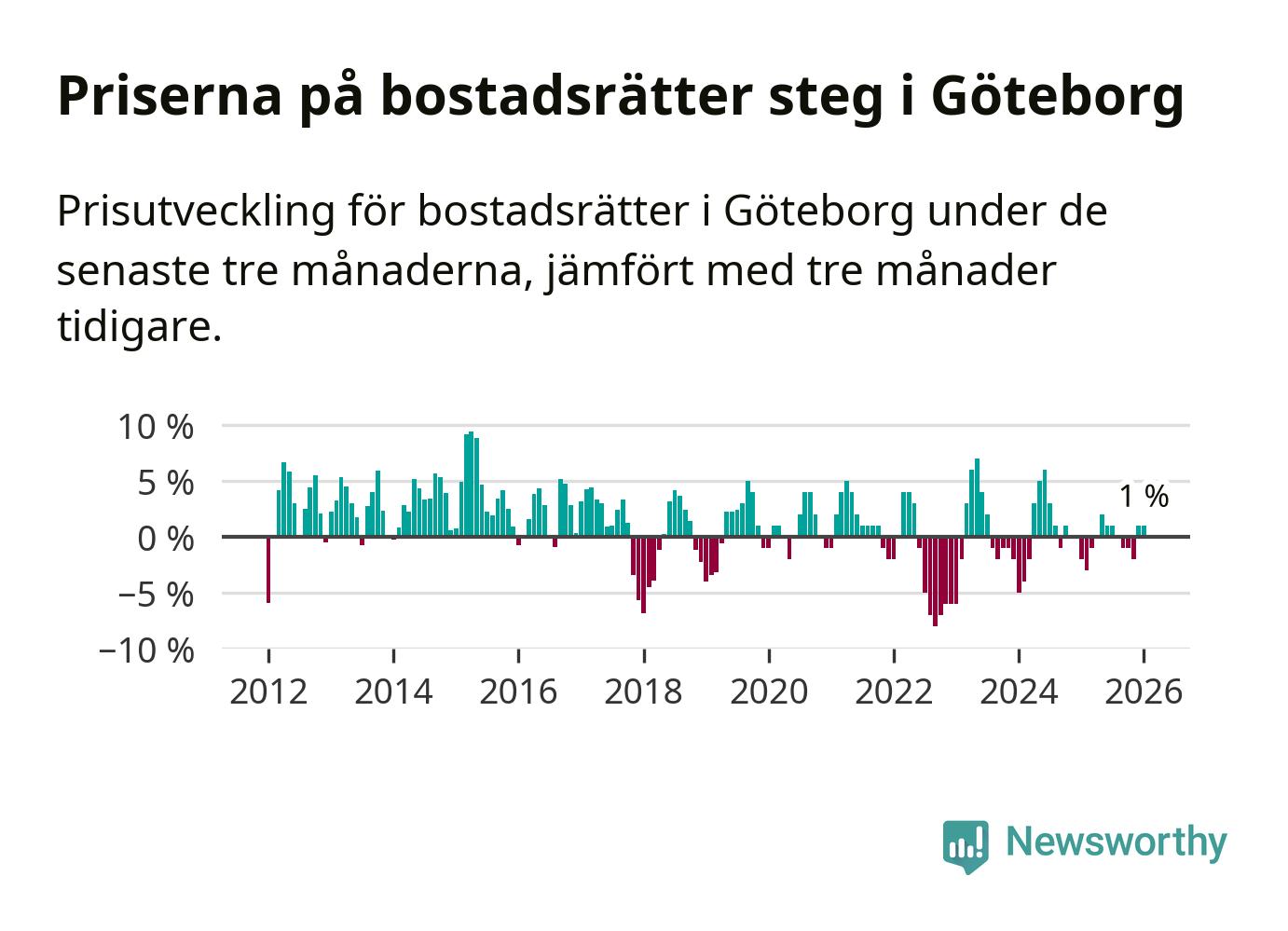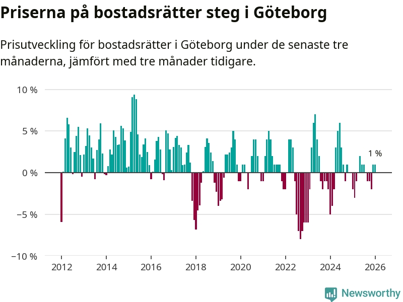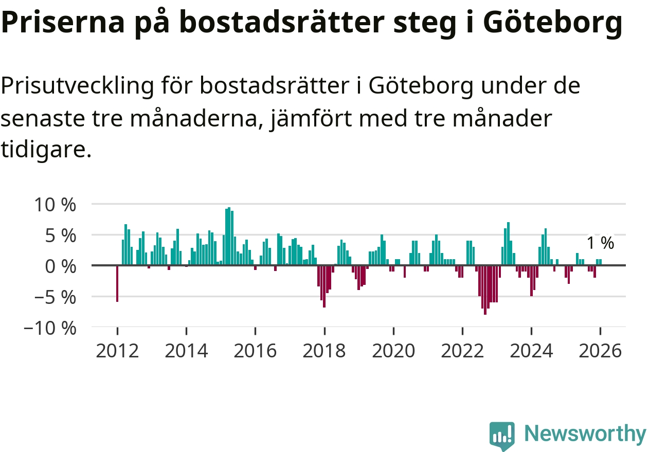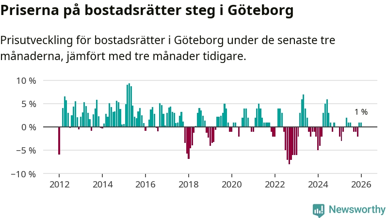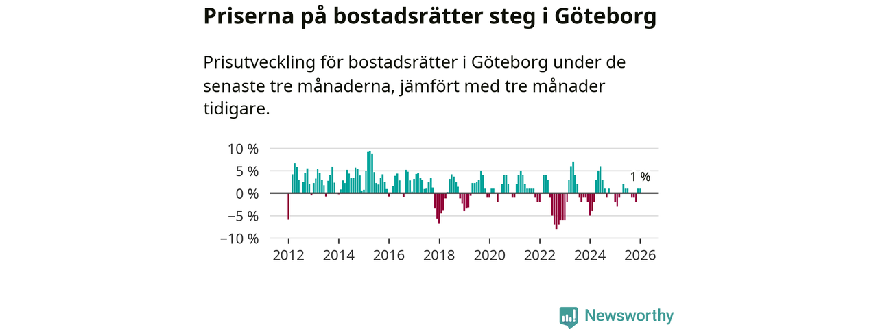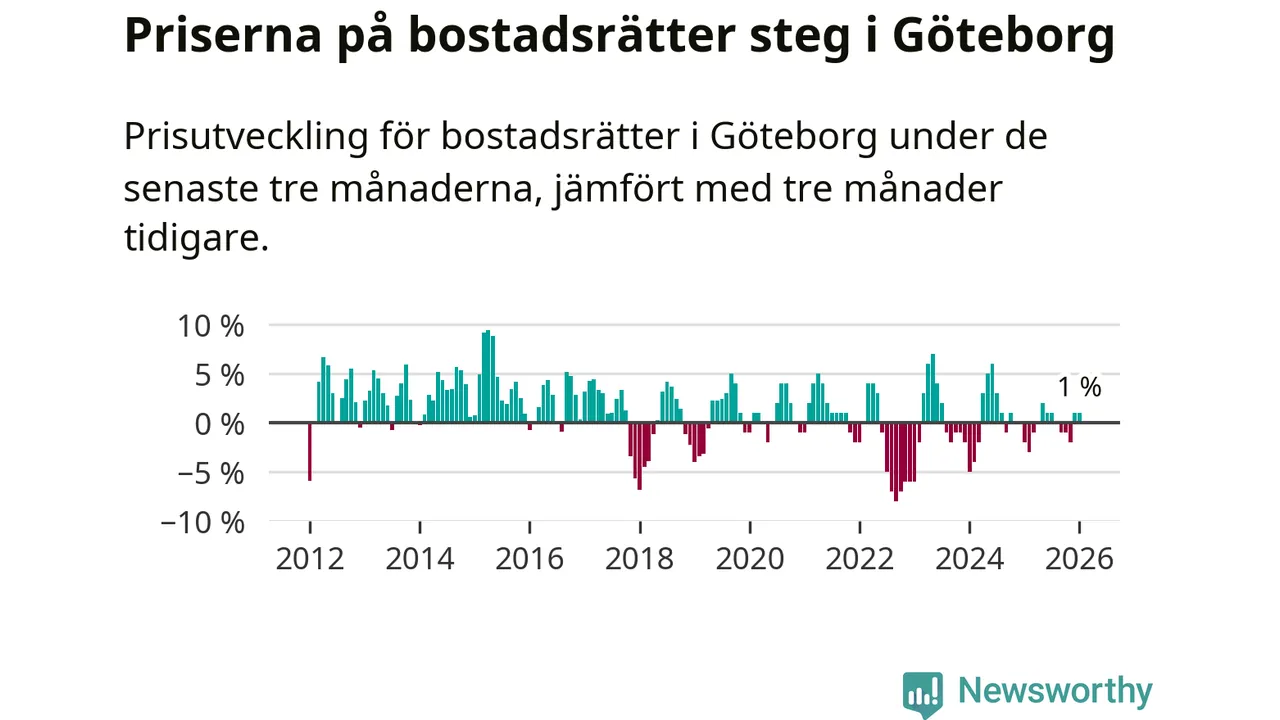 Priserna på bostadsrätter har gått upp i Göteborgs kommun. Medelpriset på försäljningarna under de senaste tre månaderna visar på en uppgång med 1 procent.