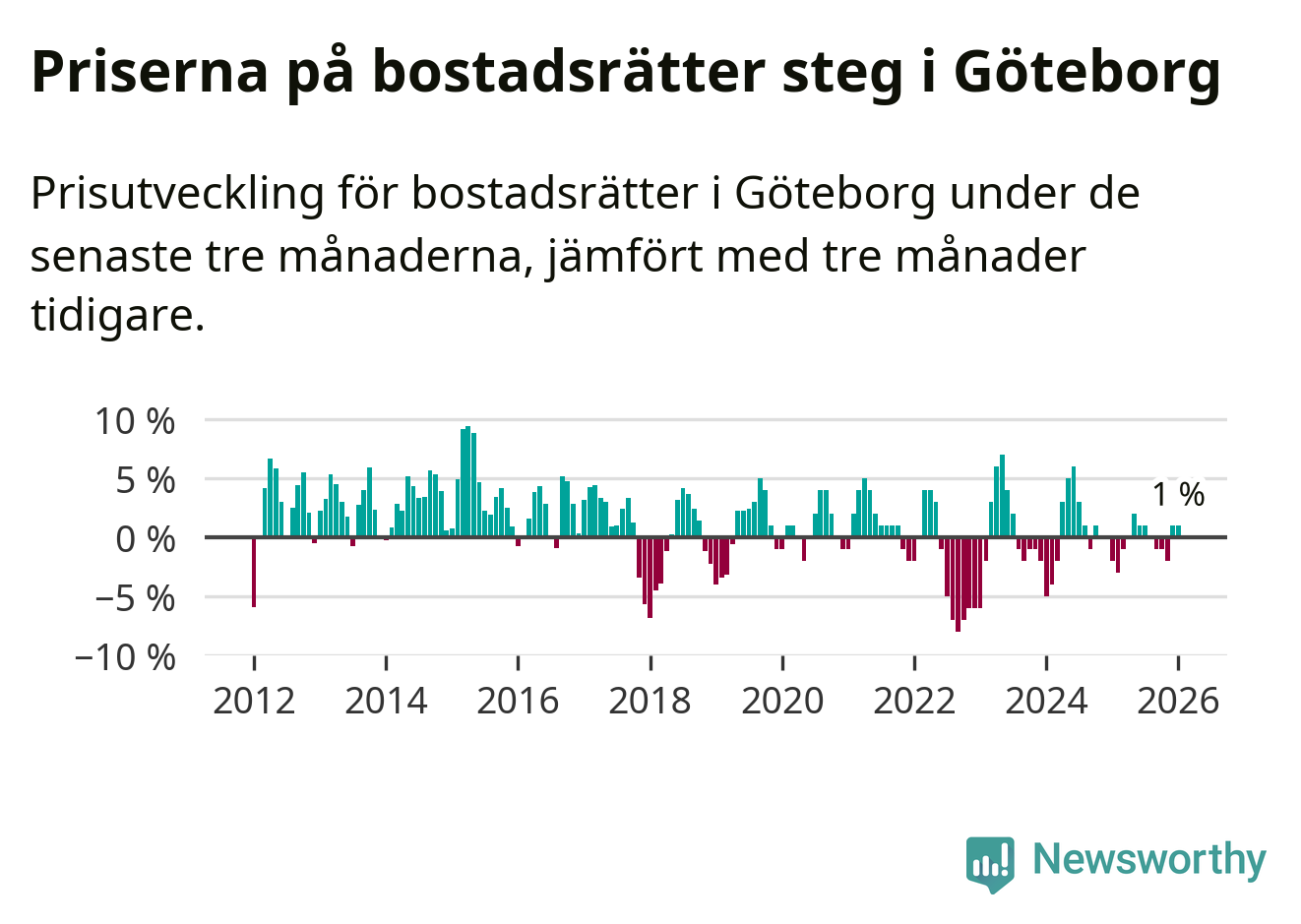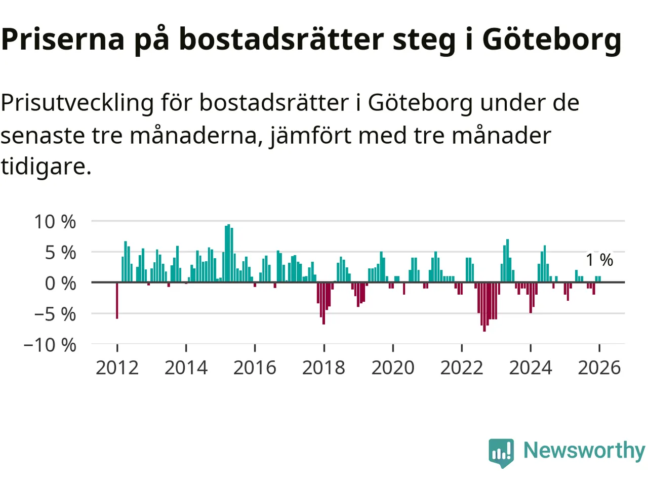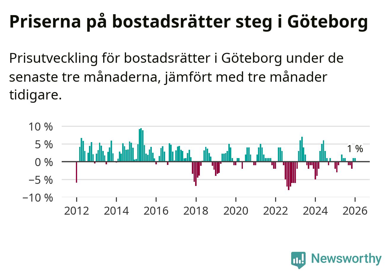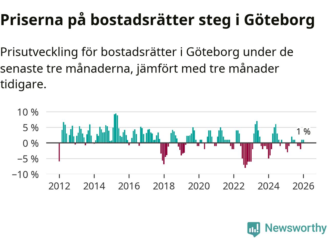 Priserna på bostadsrätter har gått upp i Göteborgs kommun. Medelpriset på försäljningarna under de senaste tre månaderna visar på en uppgång med 1 procent.