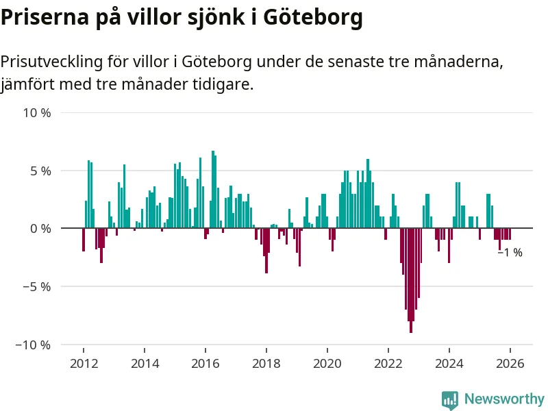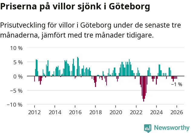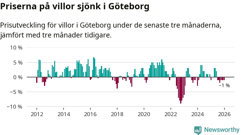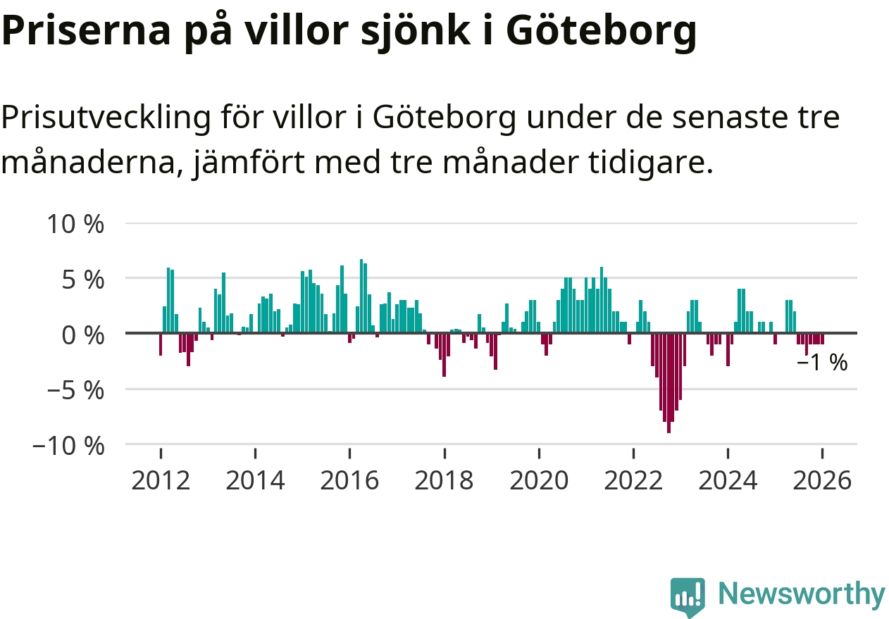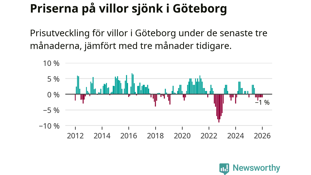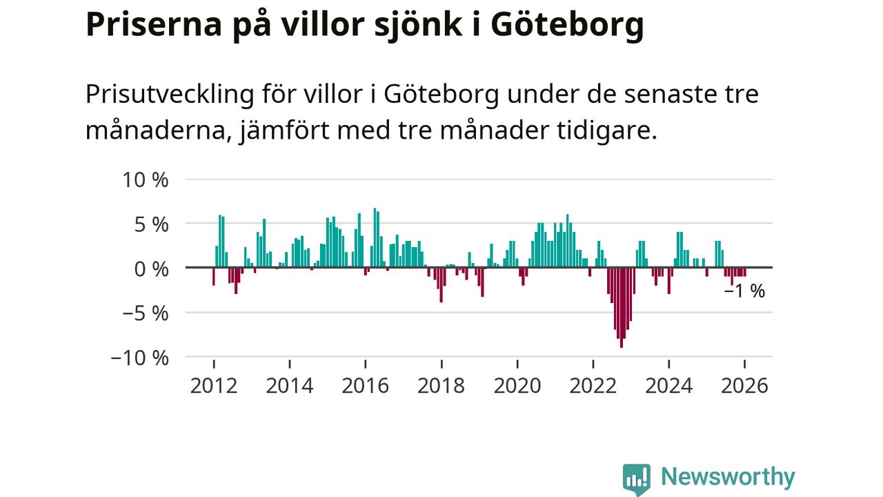 Villapriserna har gått ner i Göteborgs kommun. Medelpriset på försäljningarna under de senaste tre månaderna visar på en nedgång med 1 procent.