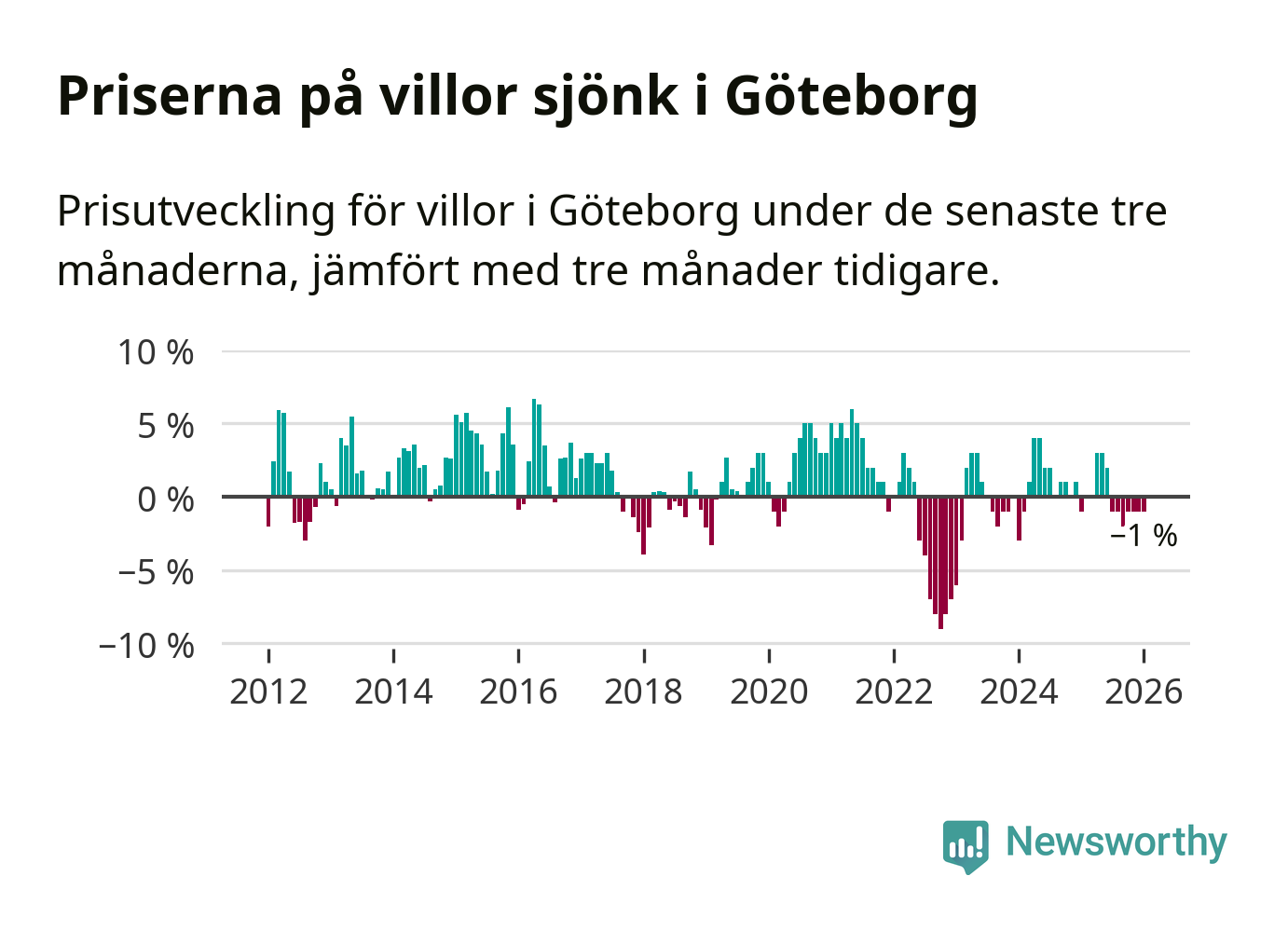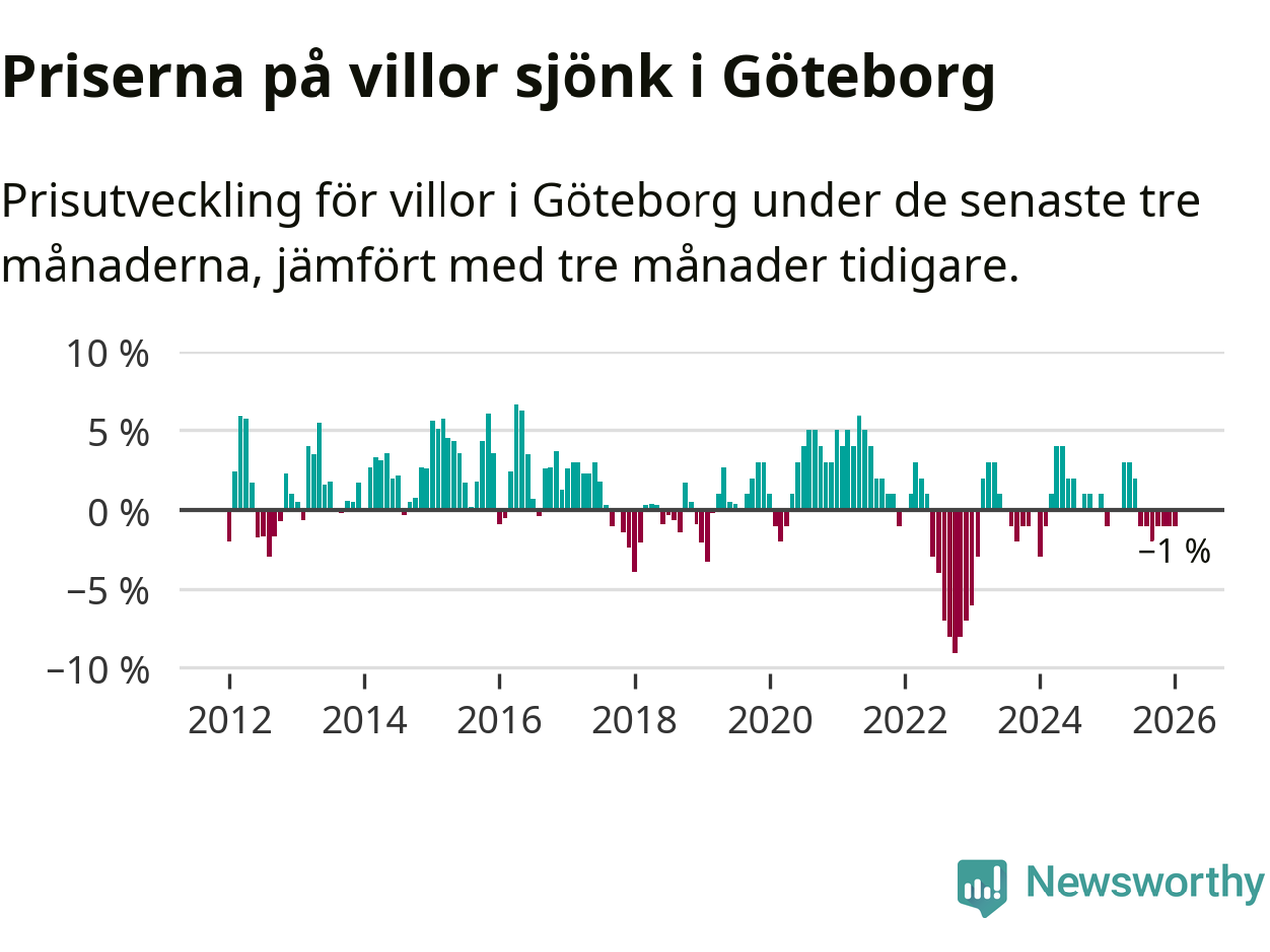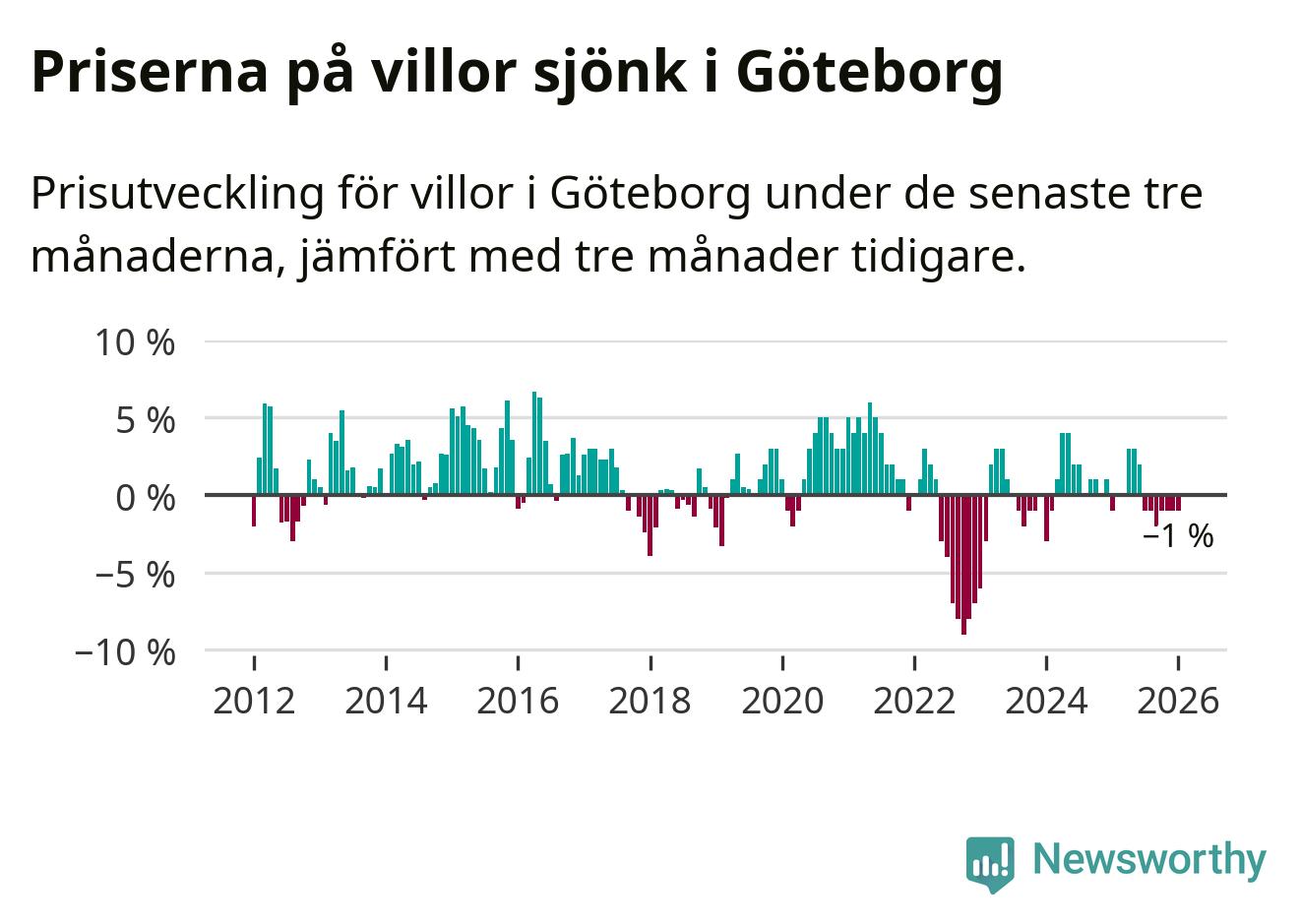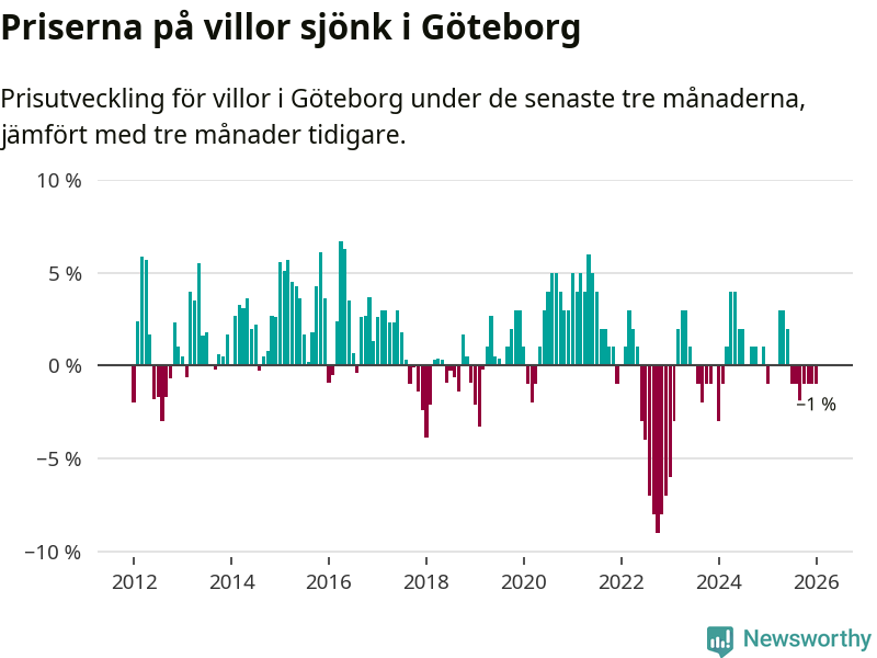 Villapriserna har gått ner i Göteborgs kommun. Medelpriset på försäljningarna under de senaste tre månaderna visar på en nedgång med 1 procent.