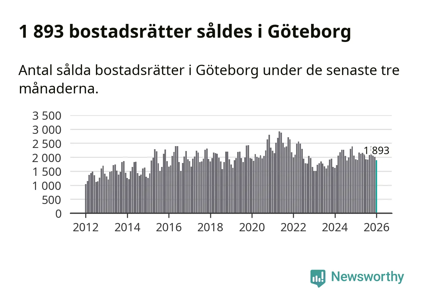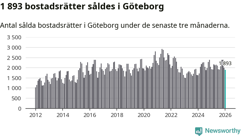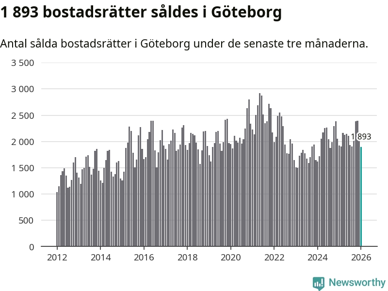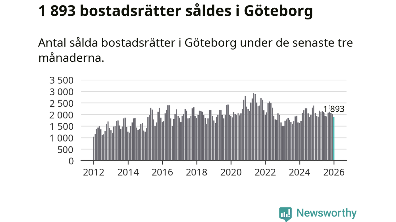 Sammanlagt såldes 1 893 bostadsrätter i Göteborgs kommun mellan november och januari till ett genomsnittligt pris på 3,3 miljoner kronor. I fjol gjordes 1 926 affärer vid den här tiden på året.