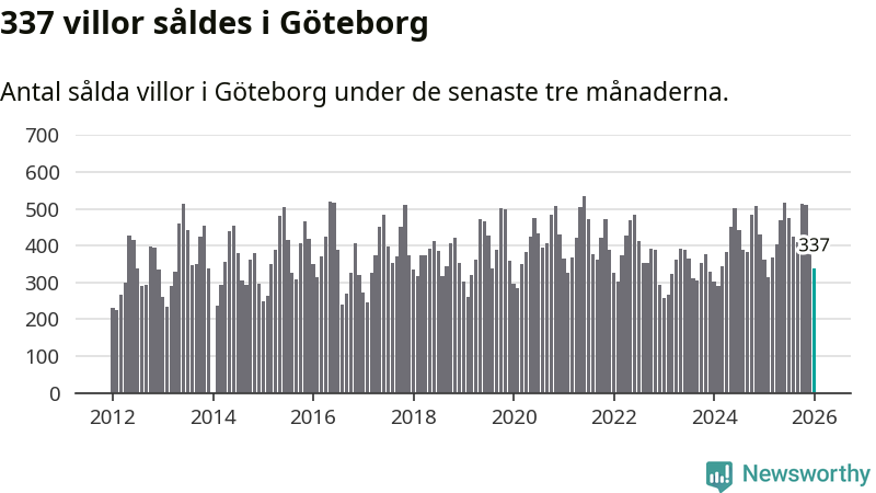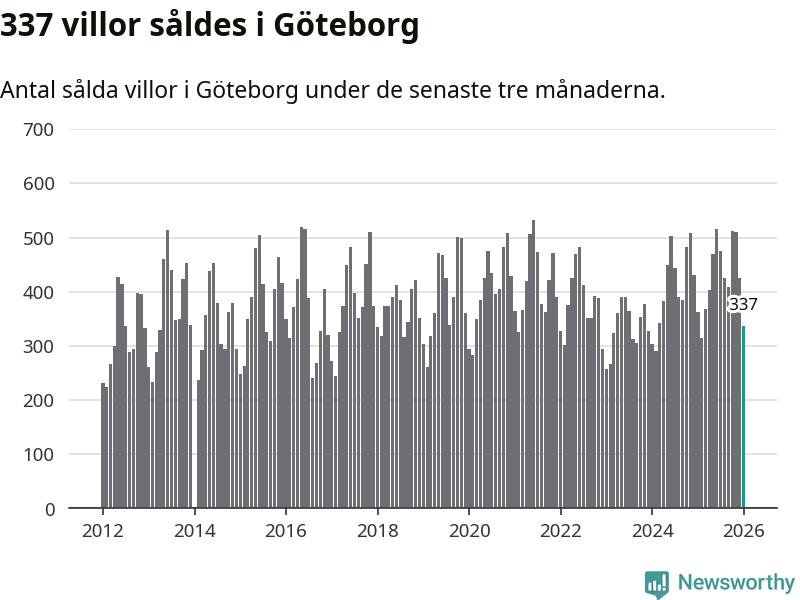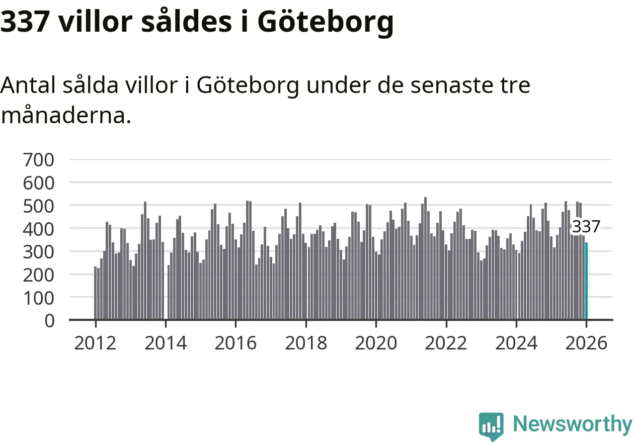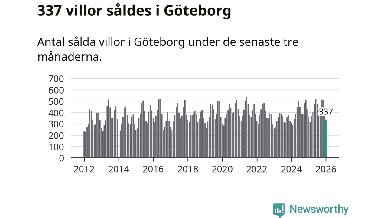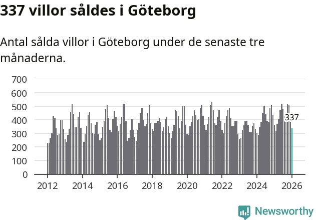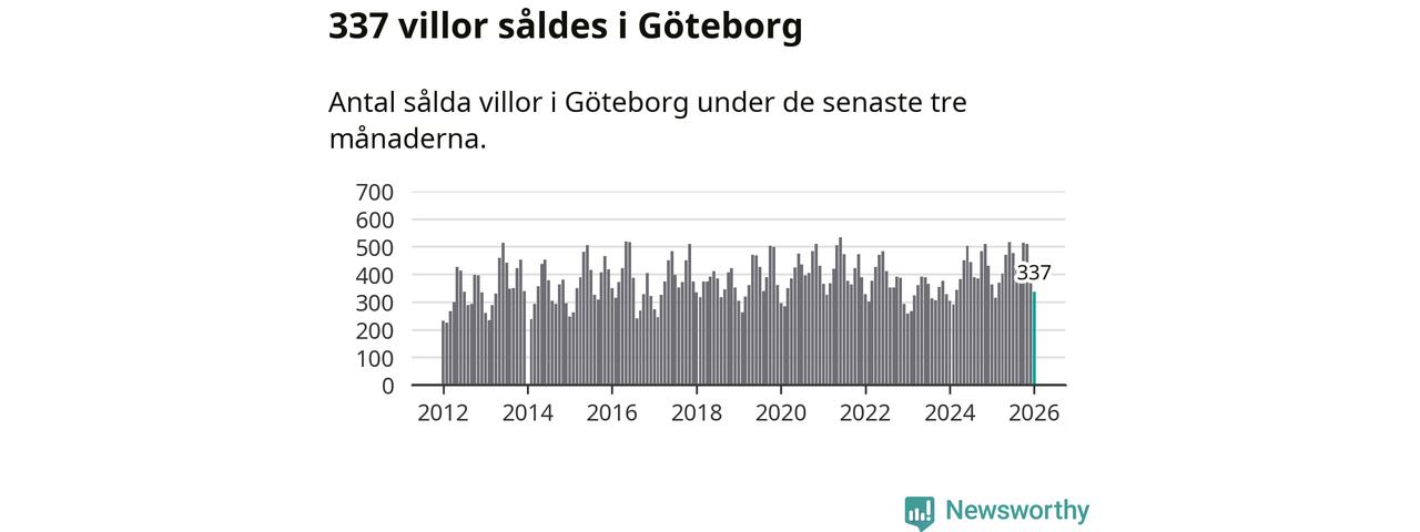 Sammanlagt såldes 337 villor i Göteborgs kommun mellan november och januari till ett genomsnittligt pris på 6,8 miljoner kronor. I fjol gjordes 362 affärer vid den här tiden på året.