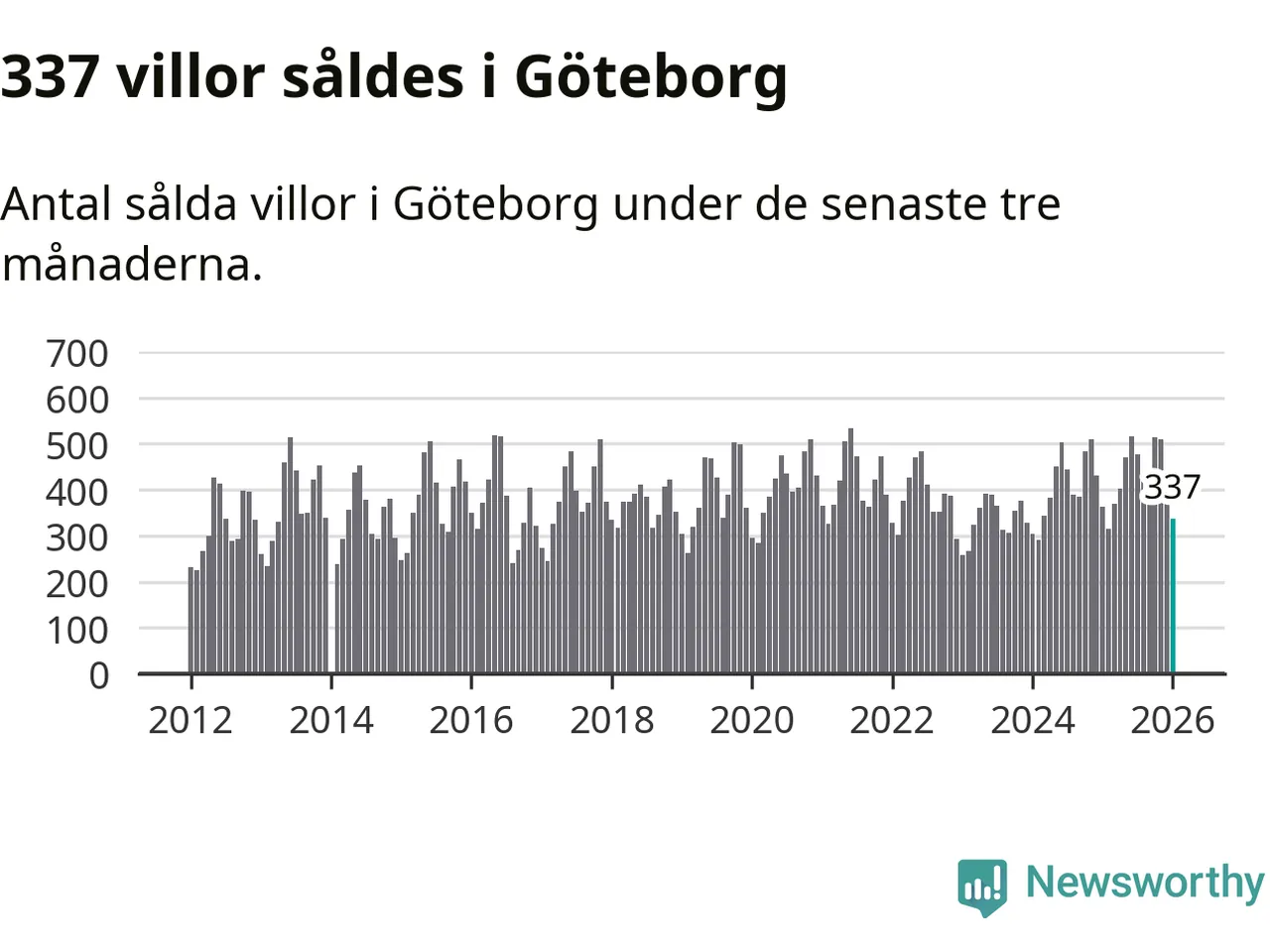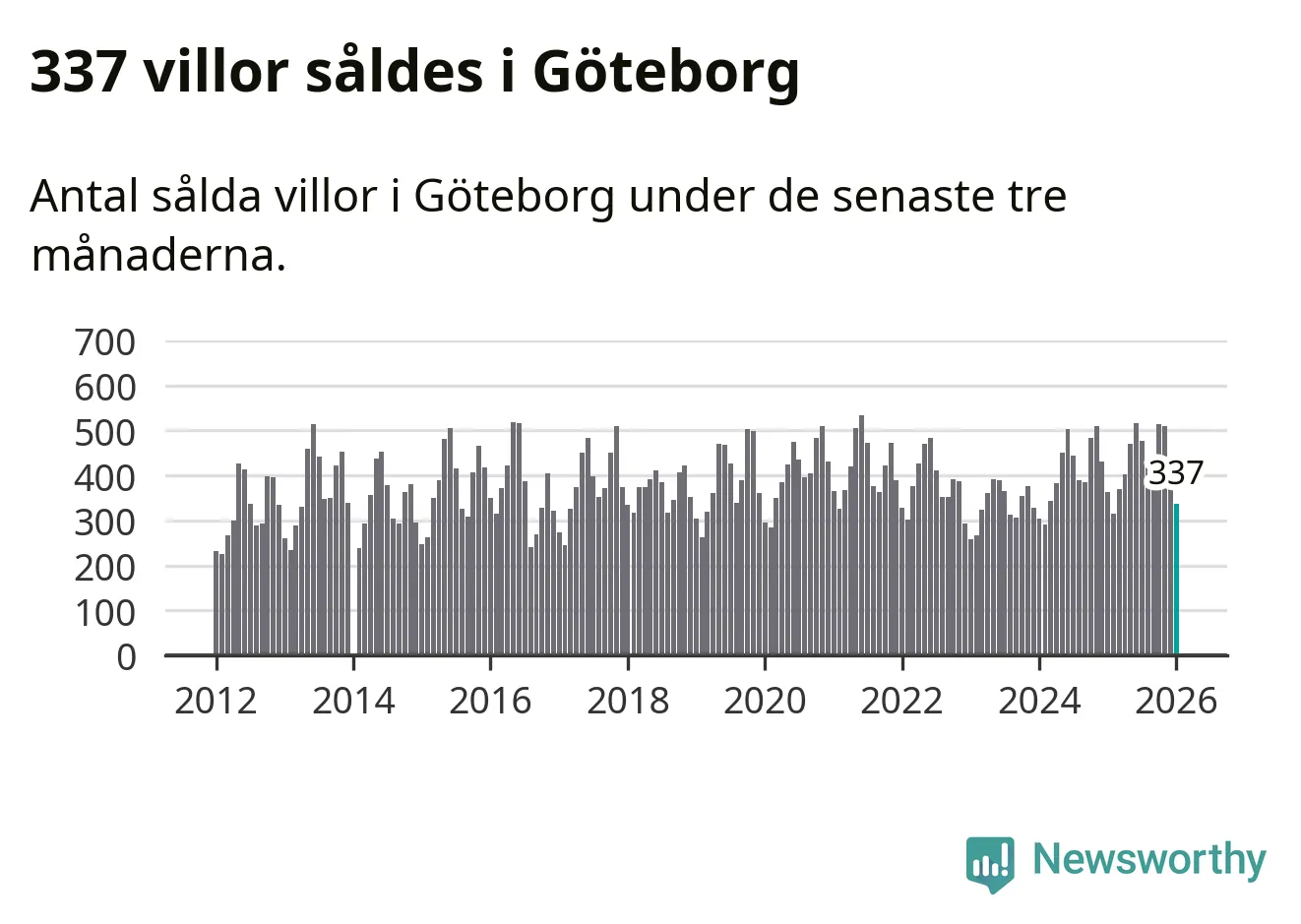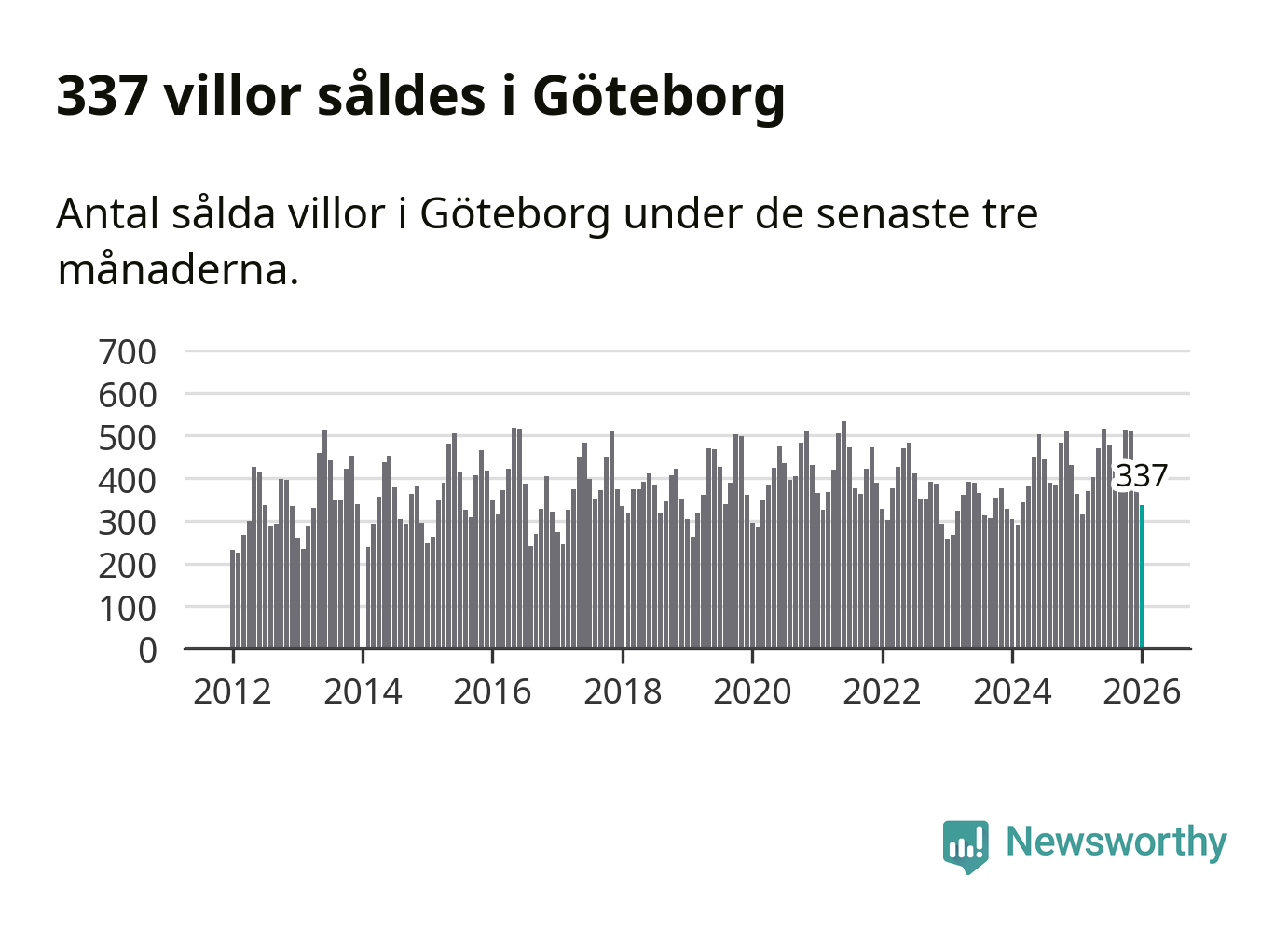 Sammanlagt såldes 337 villor i Göteborgs kommun mellan november och januari till ett genomsnittligt pris på 6,8 miljoner kronor. I fjol gjordes 362 affärer vid den här tiden på året.