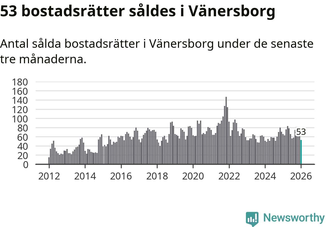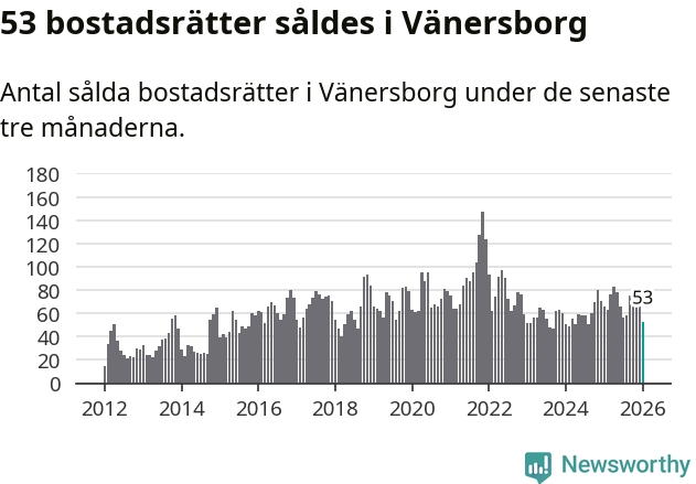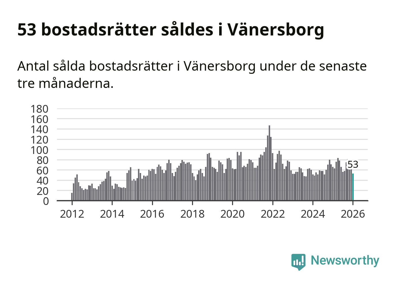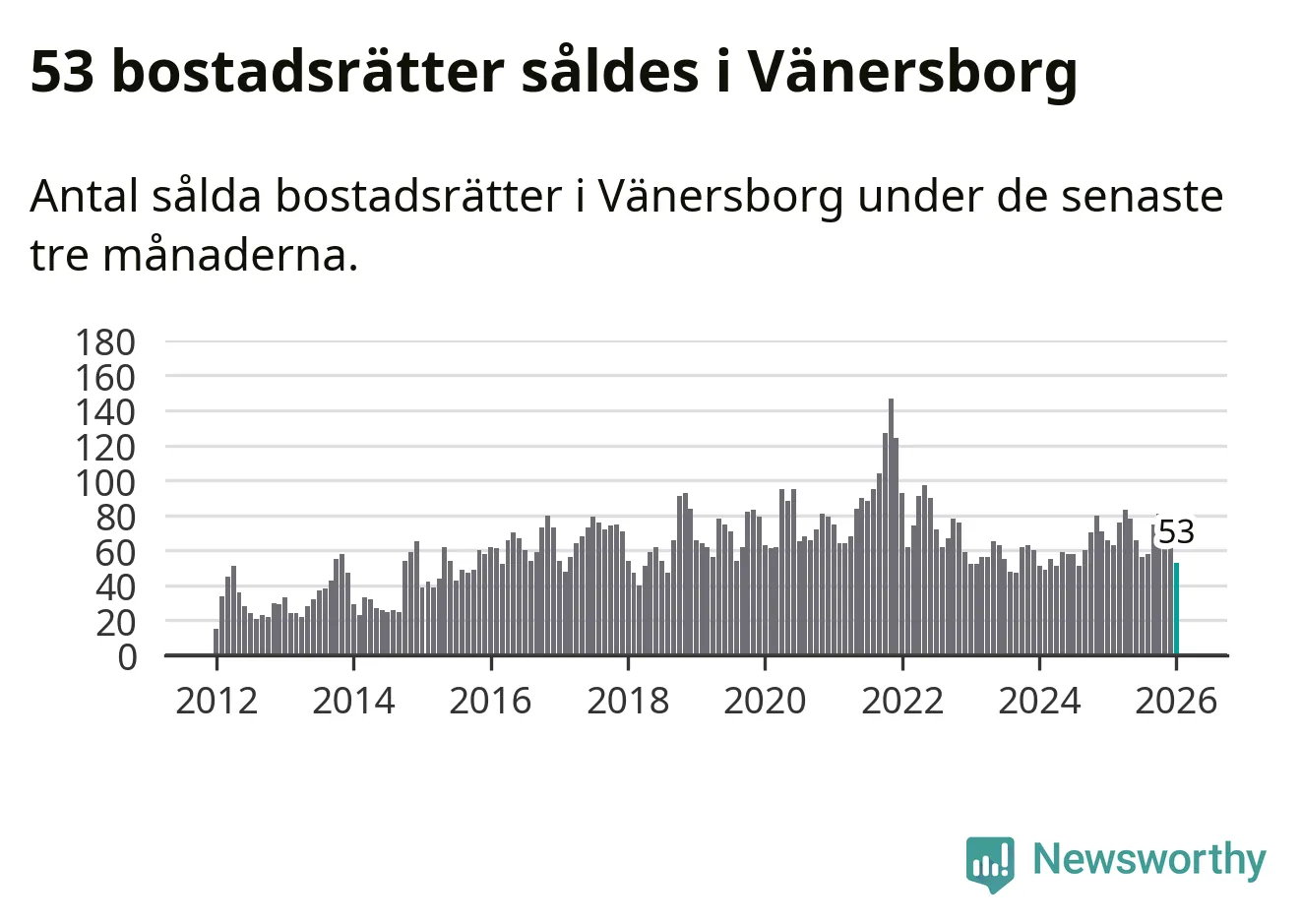 Sammanlagt såldes 53 bostadsrätter i Vänersborgs kommun mellan november och januari till ett genomsnittligt pris på 1,2 miljoner kronor. I fjol gjordes 66 affärer vid den här tiden på året.