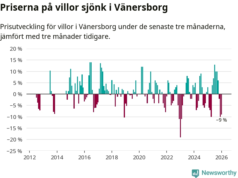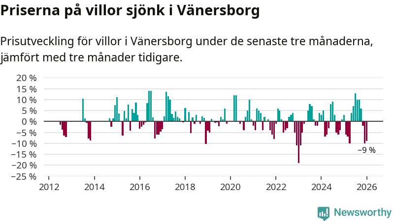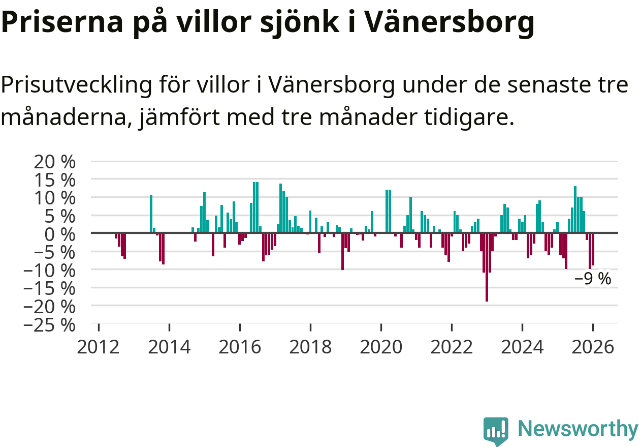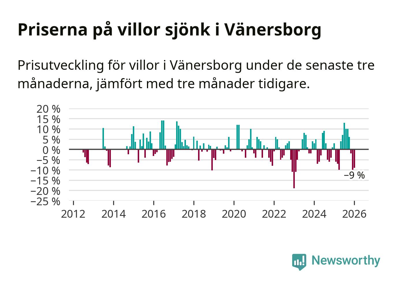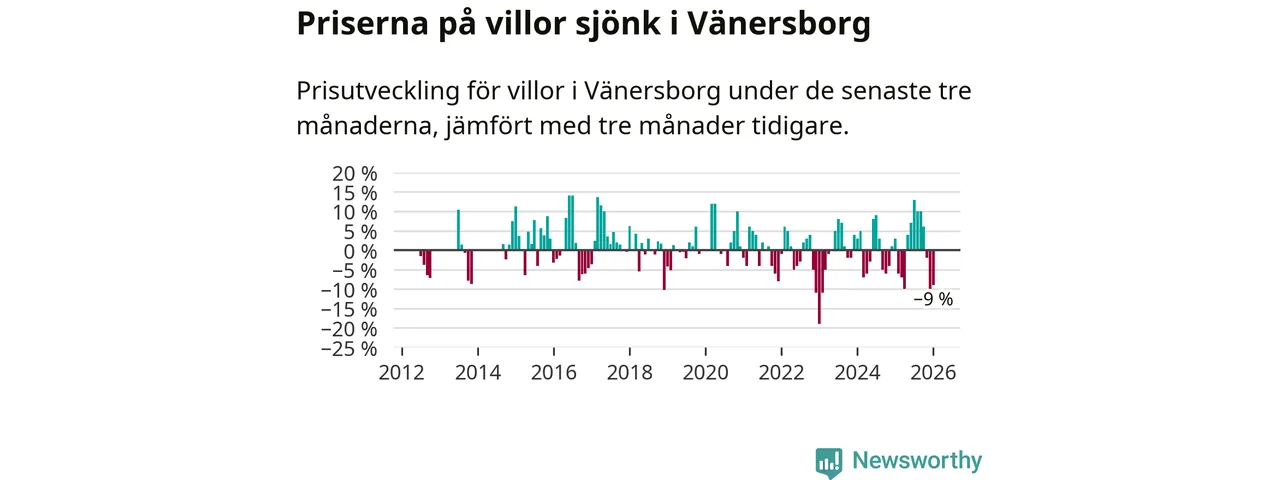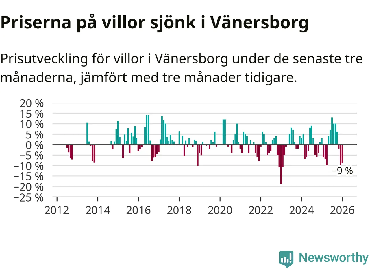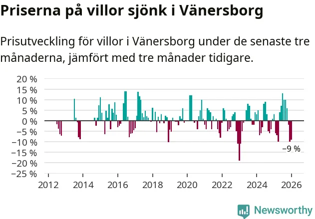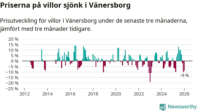 Villapriserna sjönk mellan november och januari med 9 procent i Vänersborgs kommun. Det är en betydande nedgång jämfört med det gångna året då priserna i snitt stått stilla.