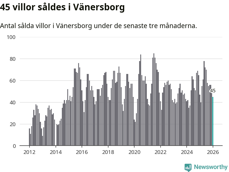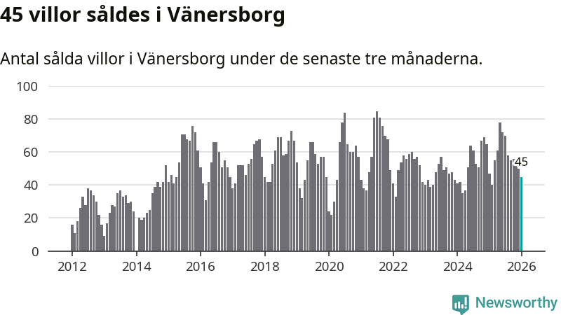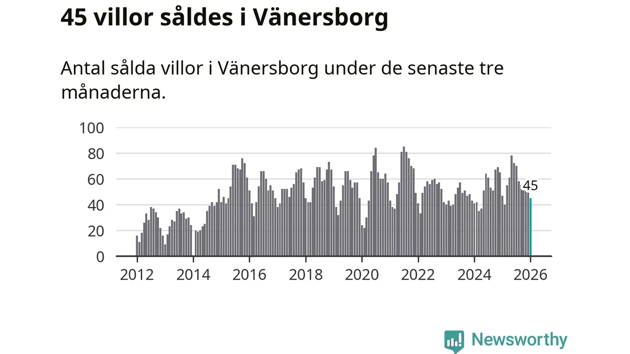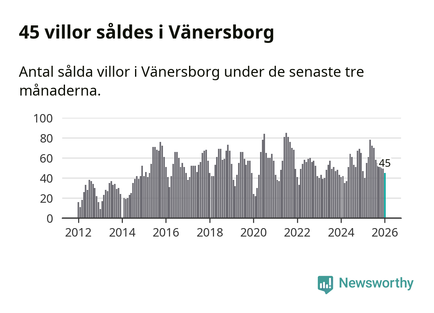 Sammanlagt såldes 45 villor i Vänersborgs kommun mellan november och januari till ett genomsnittligt pris på 2,3 miljoner kronor. I fjol gjordes 47 affärer vid den här tiden på året.