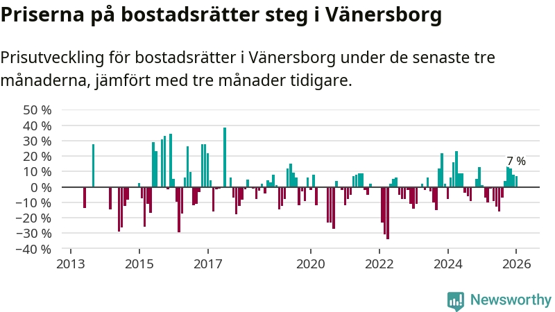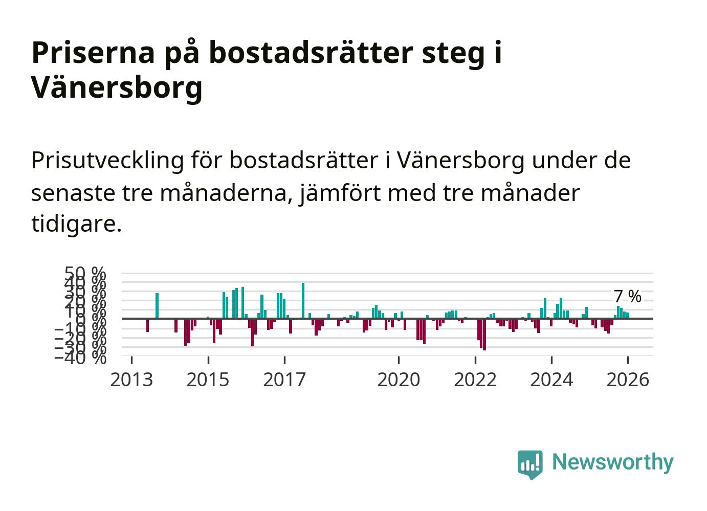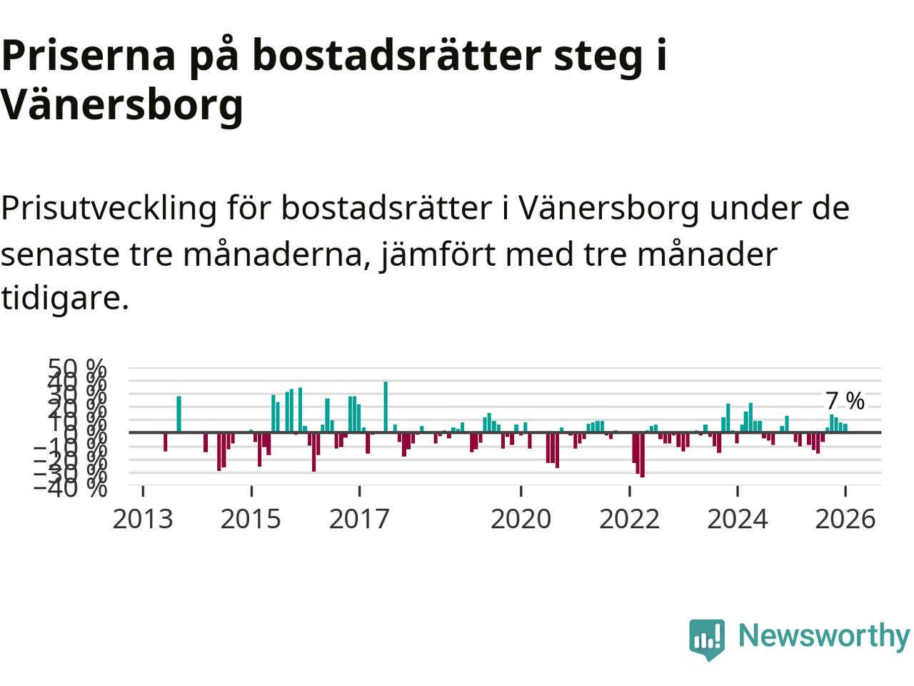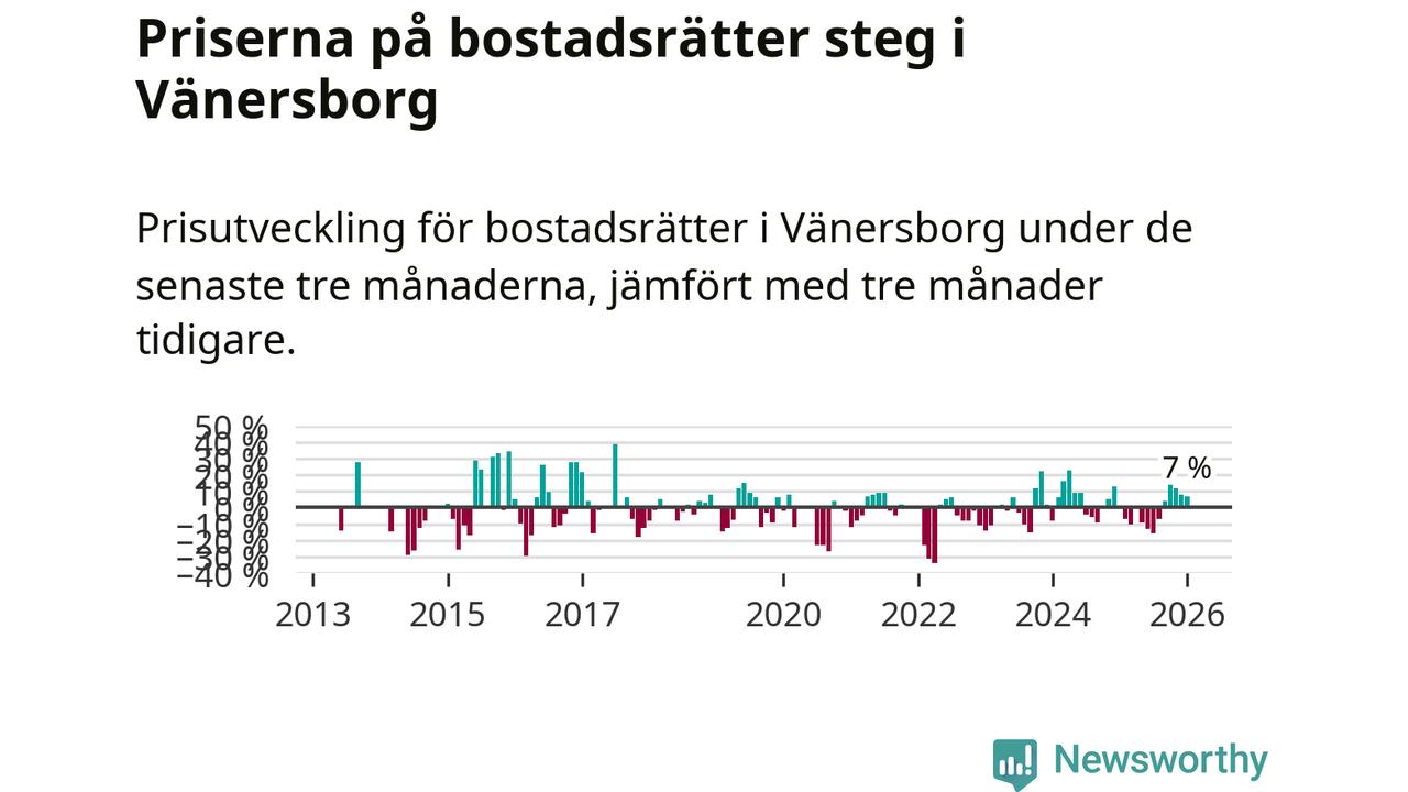 Priserna på bostadsrätter har gått upp i Vänersborgs kommun. Medelpriset på försäljningarna under de senaste tre månaderna visar på en uppgång med 7 procent.