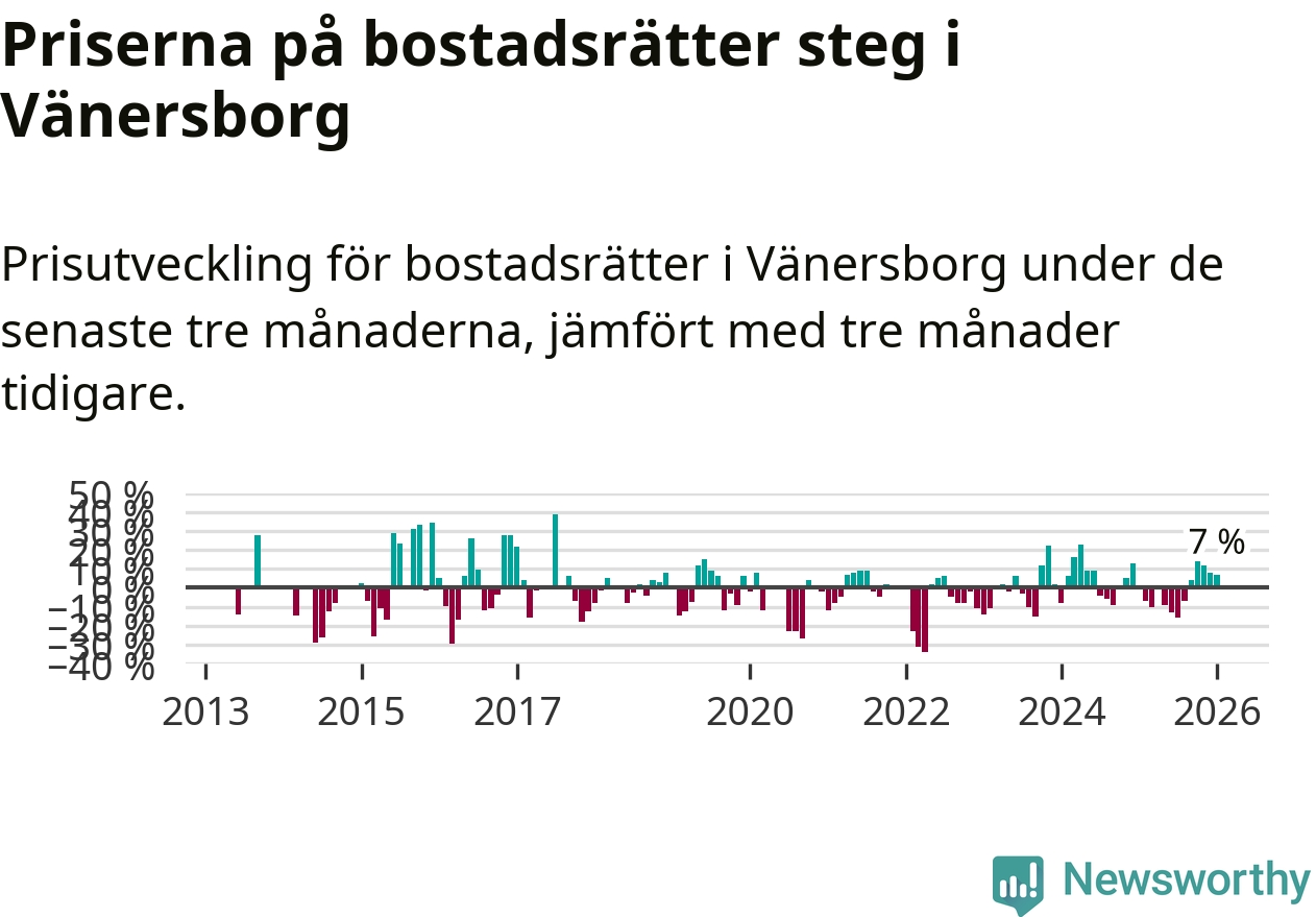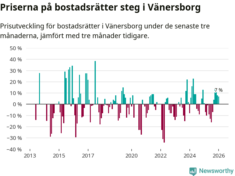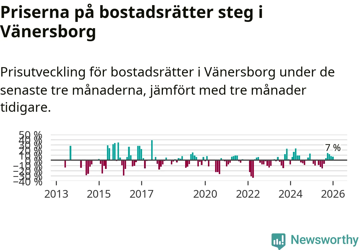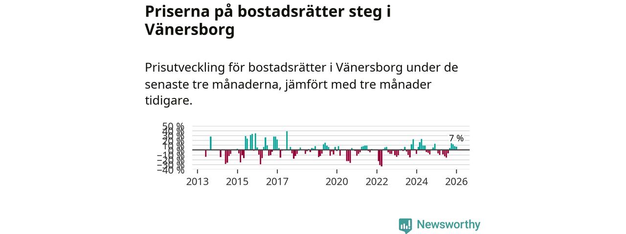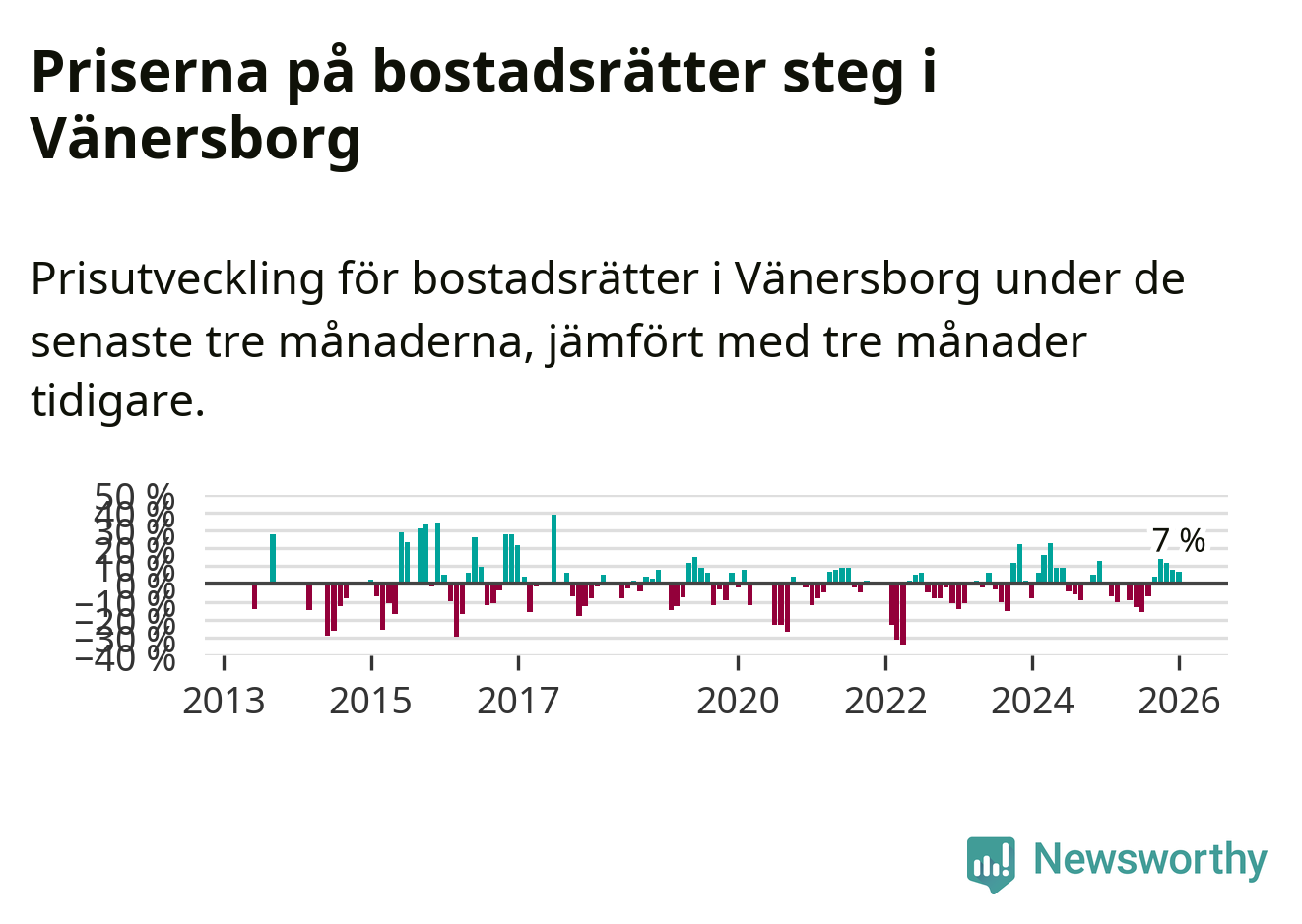 Priserna på bostadsrätter har gått upp i Vänersborgs kommun. Medelpriset på försäljningarna under de senaste tre månaderna visar på en uppgång med 7 procent.