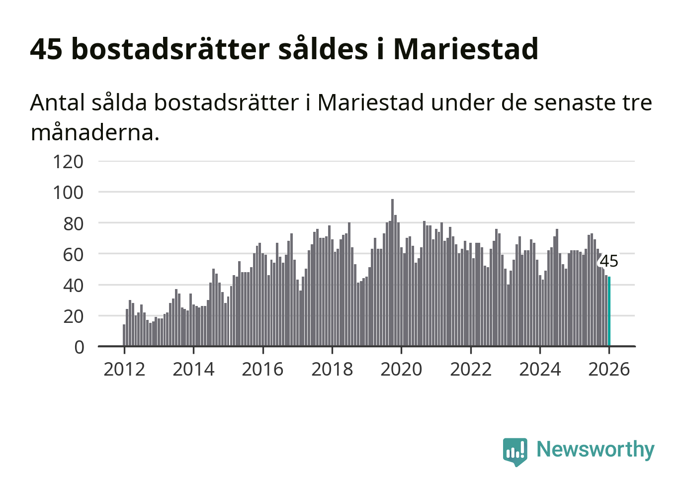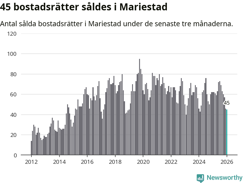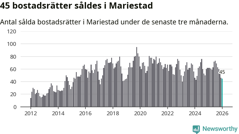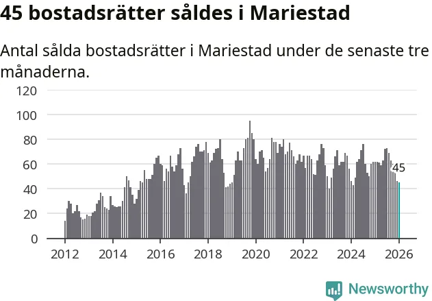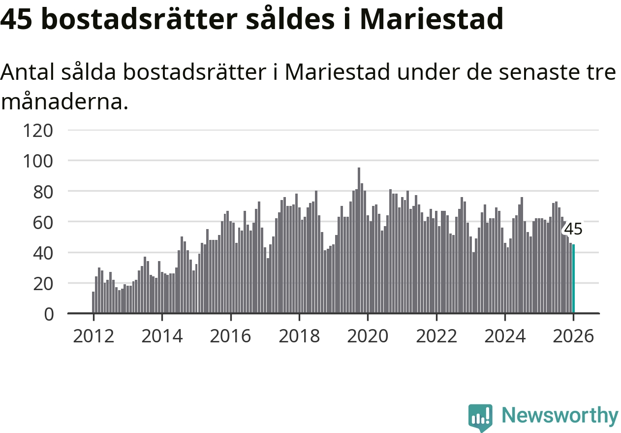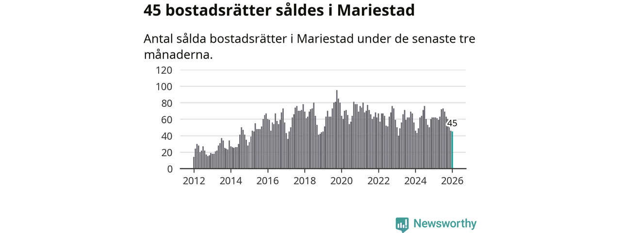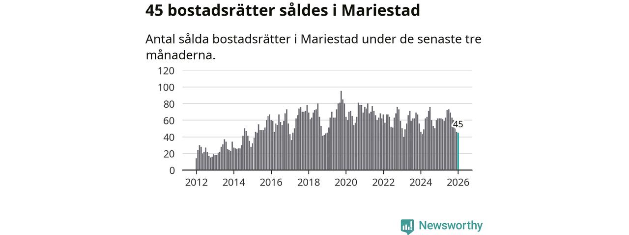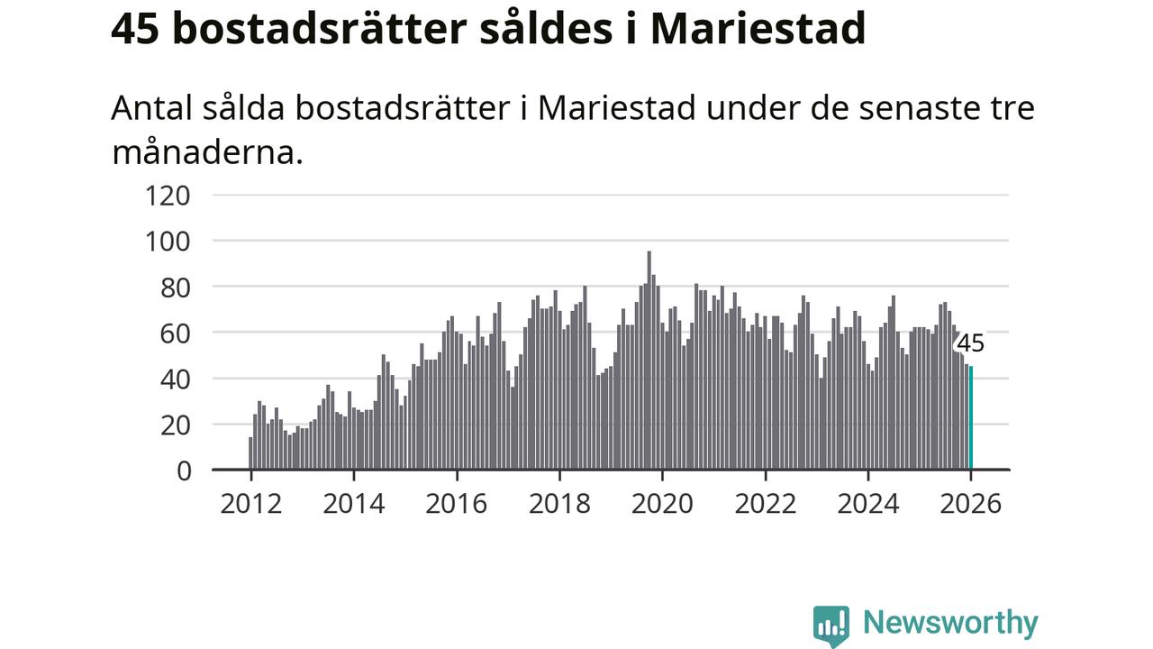 Sammanlagt såldes 45 bostadsrätter i Mariestads kommun mellan november och januari till ett genomsnittligt pris på 1,0 miljon kronor. I fjol gjordes 62 affärer vid den här tiden på året.