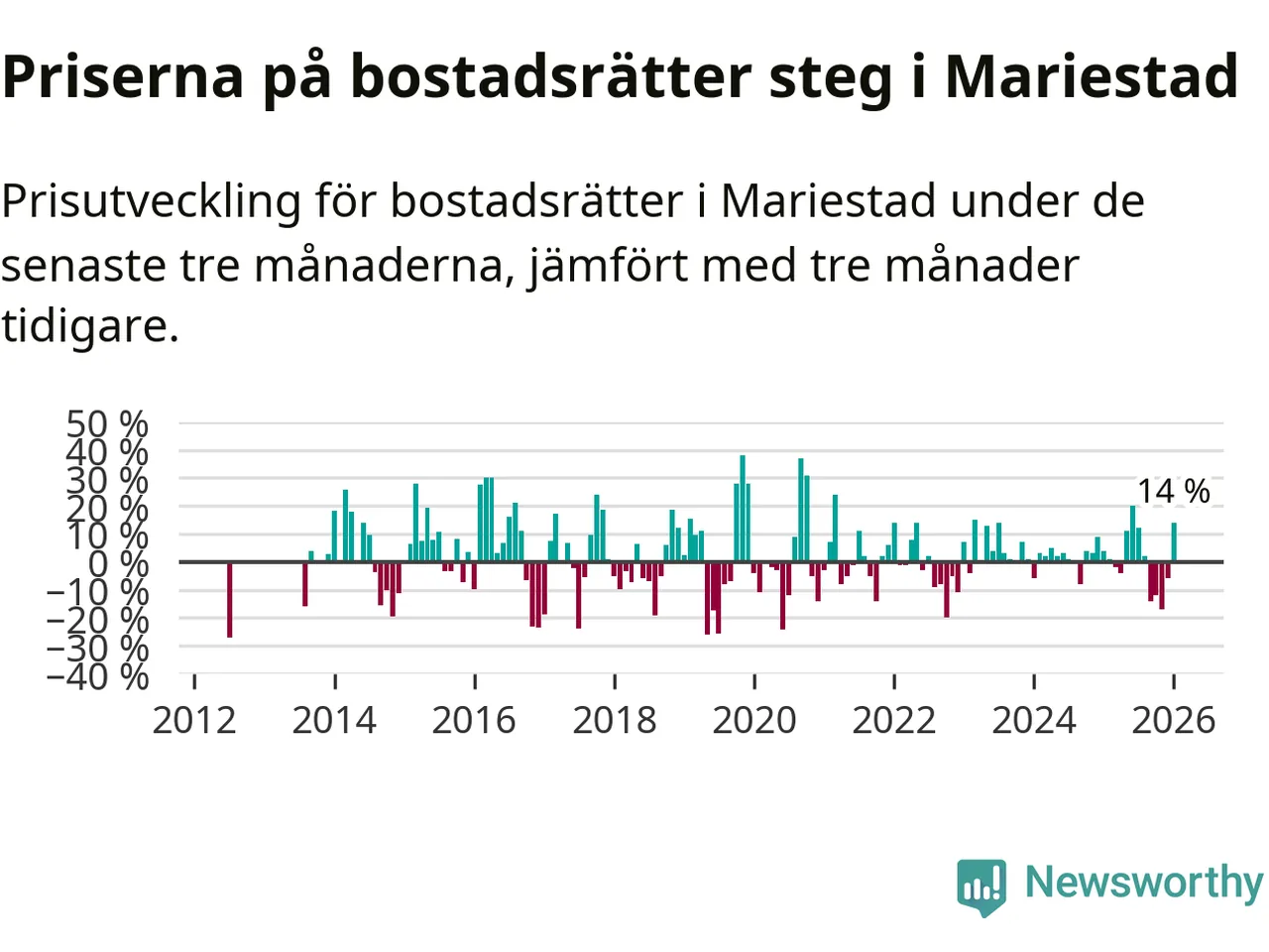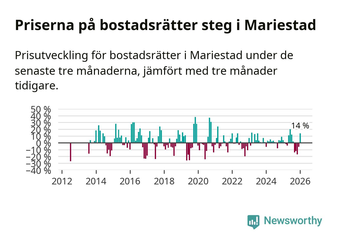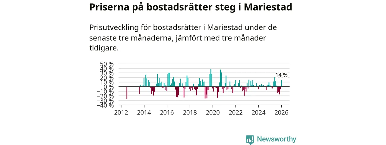 Priserna på bostadsrätter har gått upp i Mariestads kommun. Medelpriset på försäljningarna under de senaste tre månaderna visar på en uppgång med 14 procent.