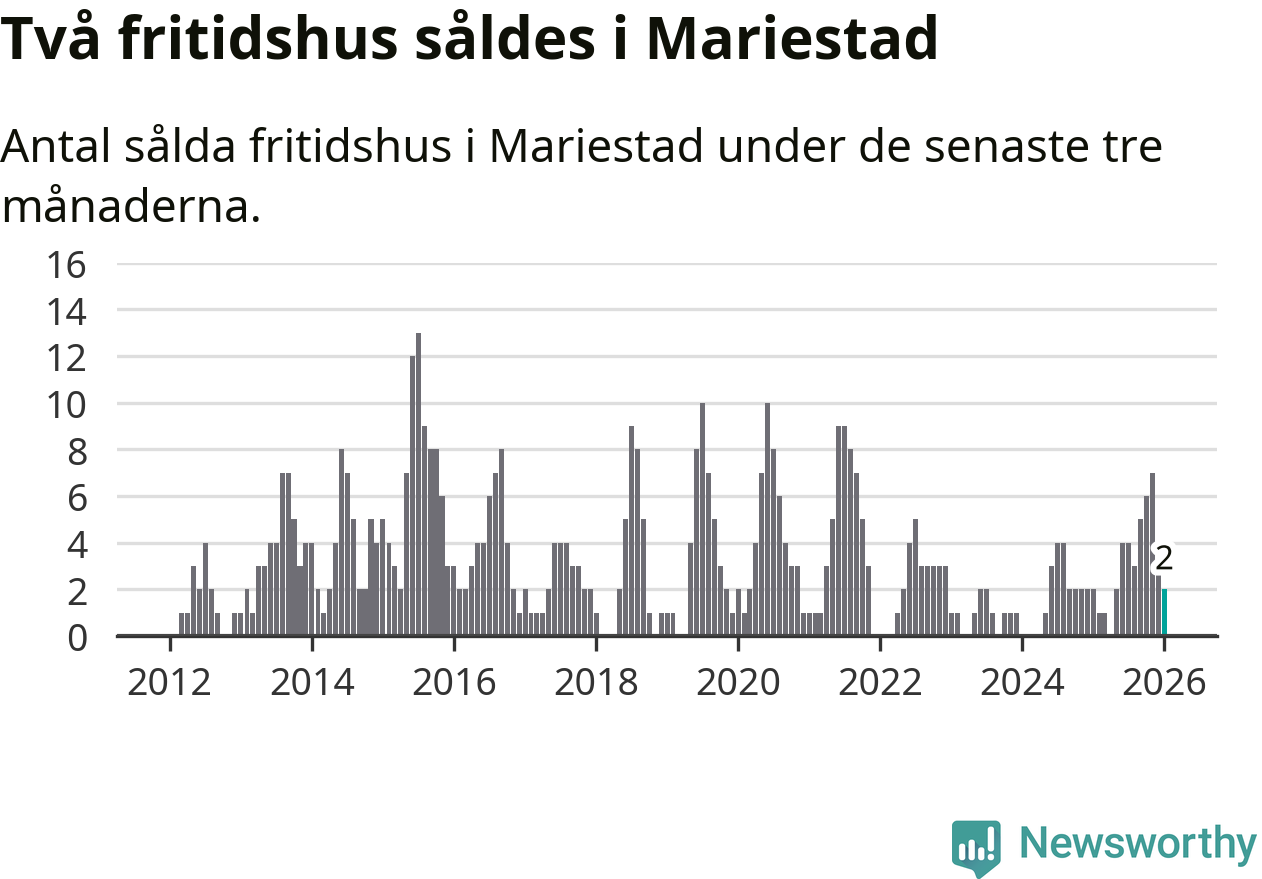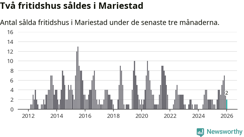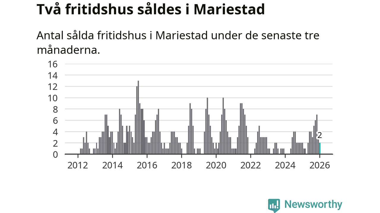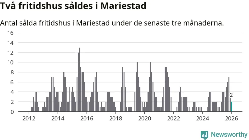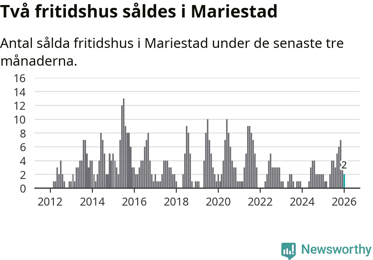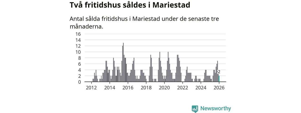 Mellan november och januari gjordes sammanlagt två affärer med fritidshus i Mariestads kommun. Det är lika många affärer som vid motsvarande tid i fjol.