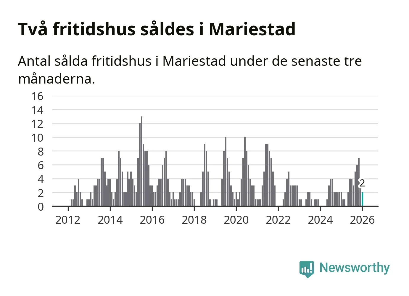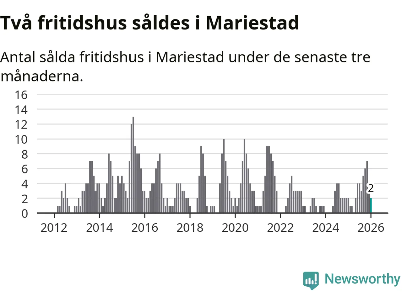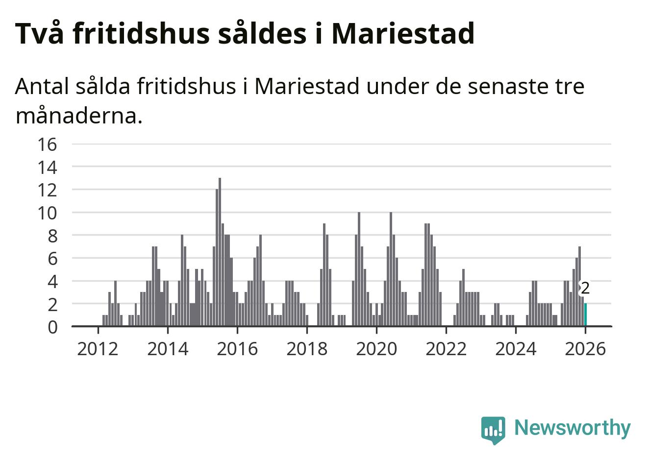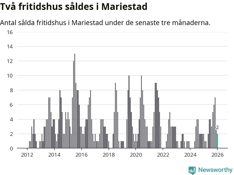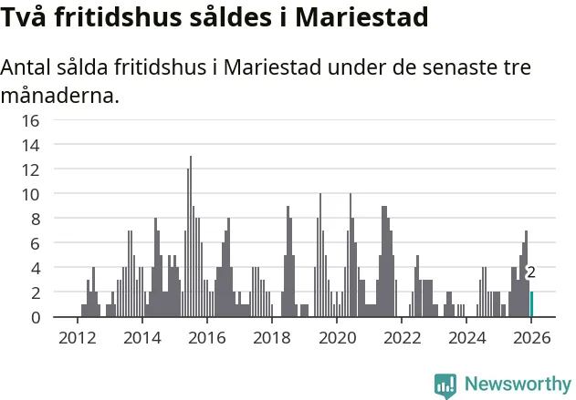 Mellan november och januari gjordes sammanlagt två affärer med fritidshus i Mariestads kommun. Det är lika många affärer som vid motsvarande tid i fjol.