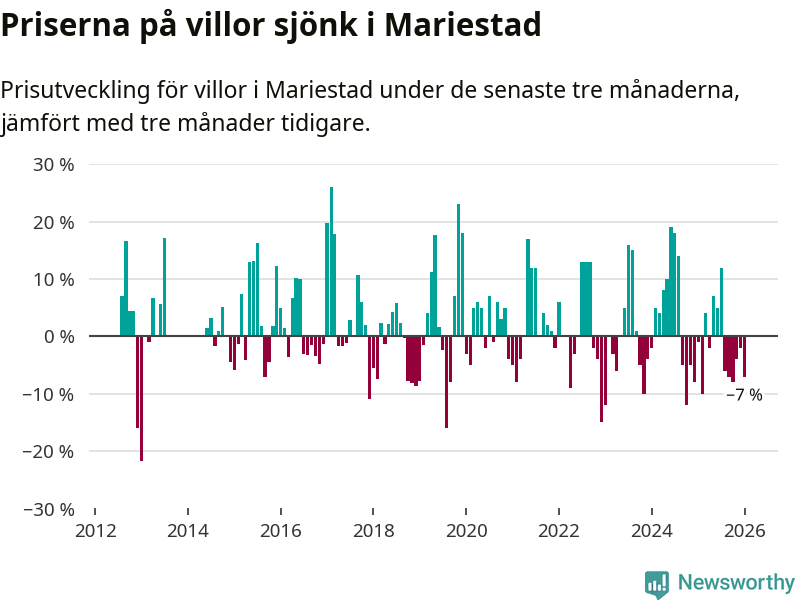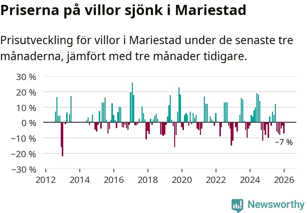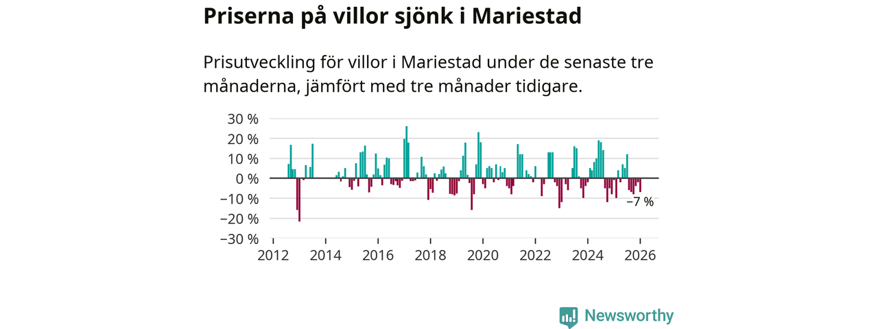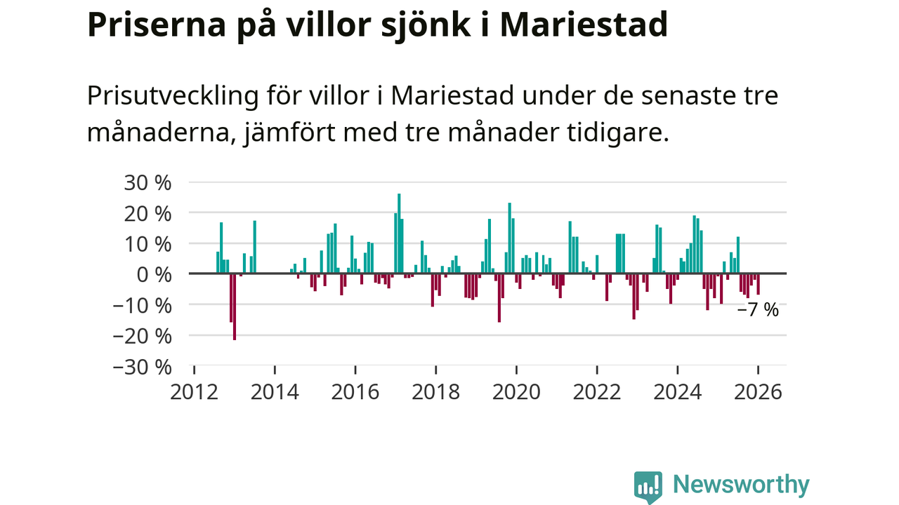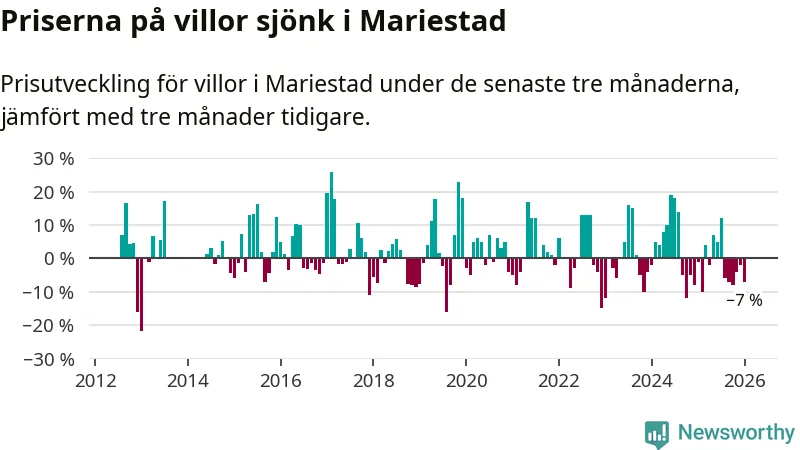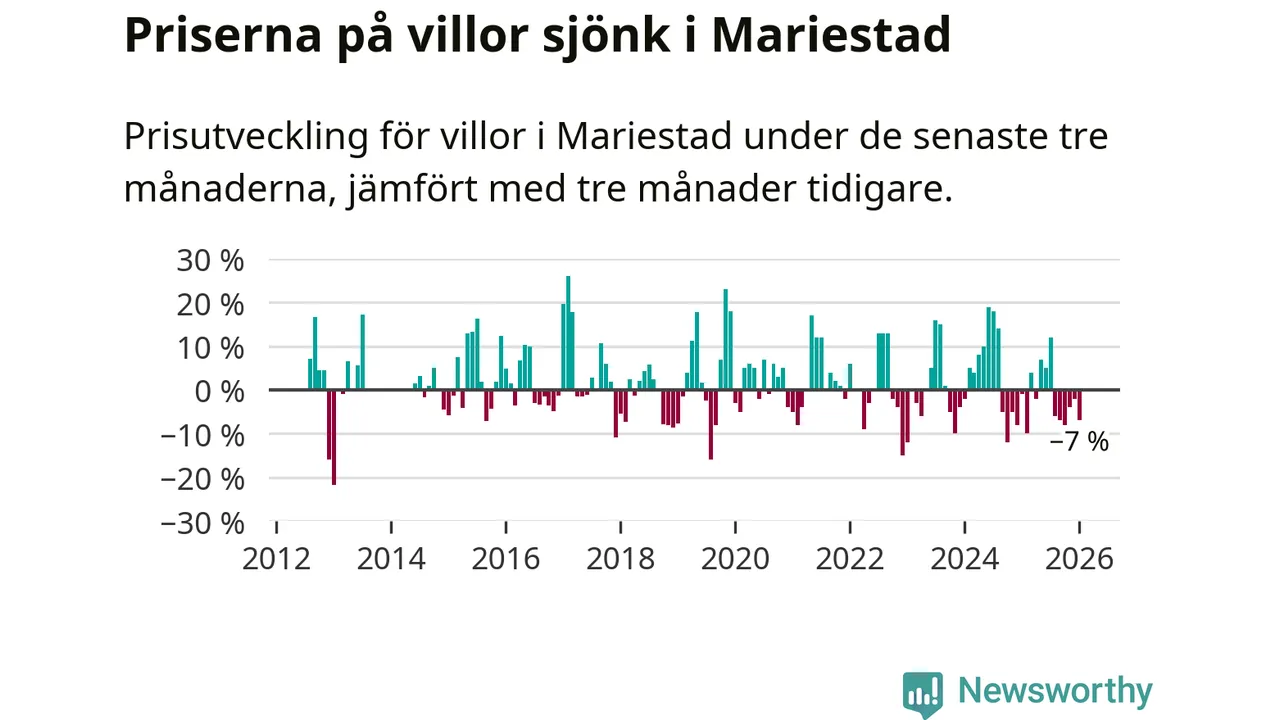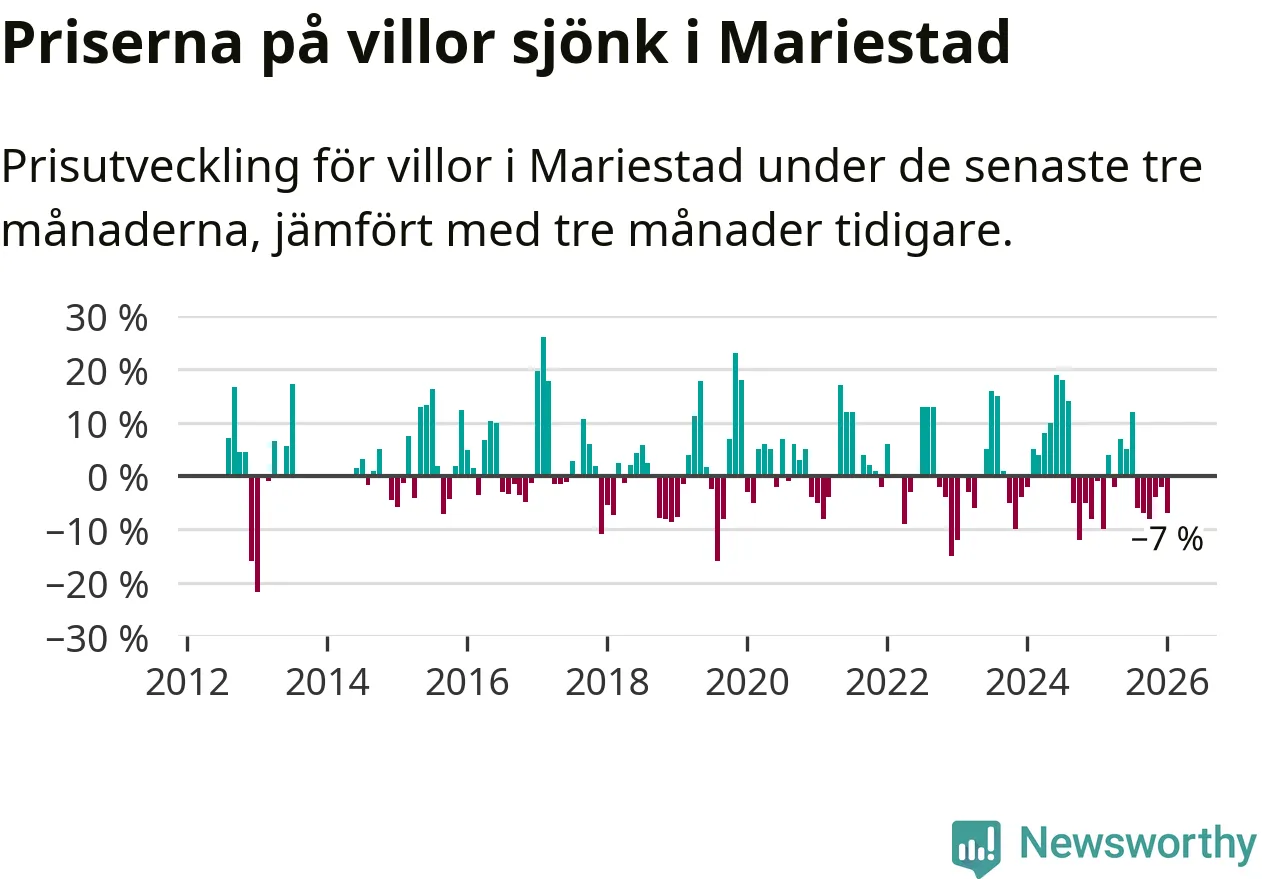 Villapriserna har gått ner i Mariestads kommun. Medelpriset på försäljningarna under de senaste tre månaderna visar på en nedgång med 7 procent.