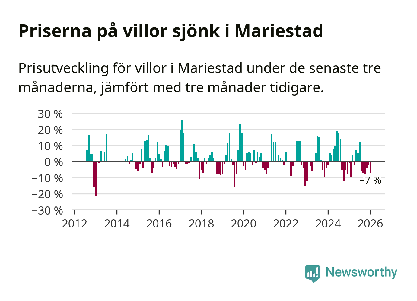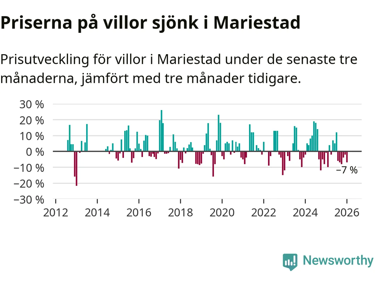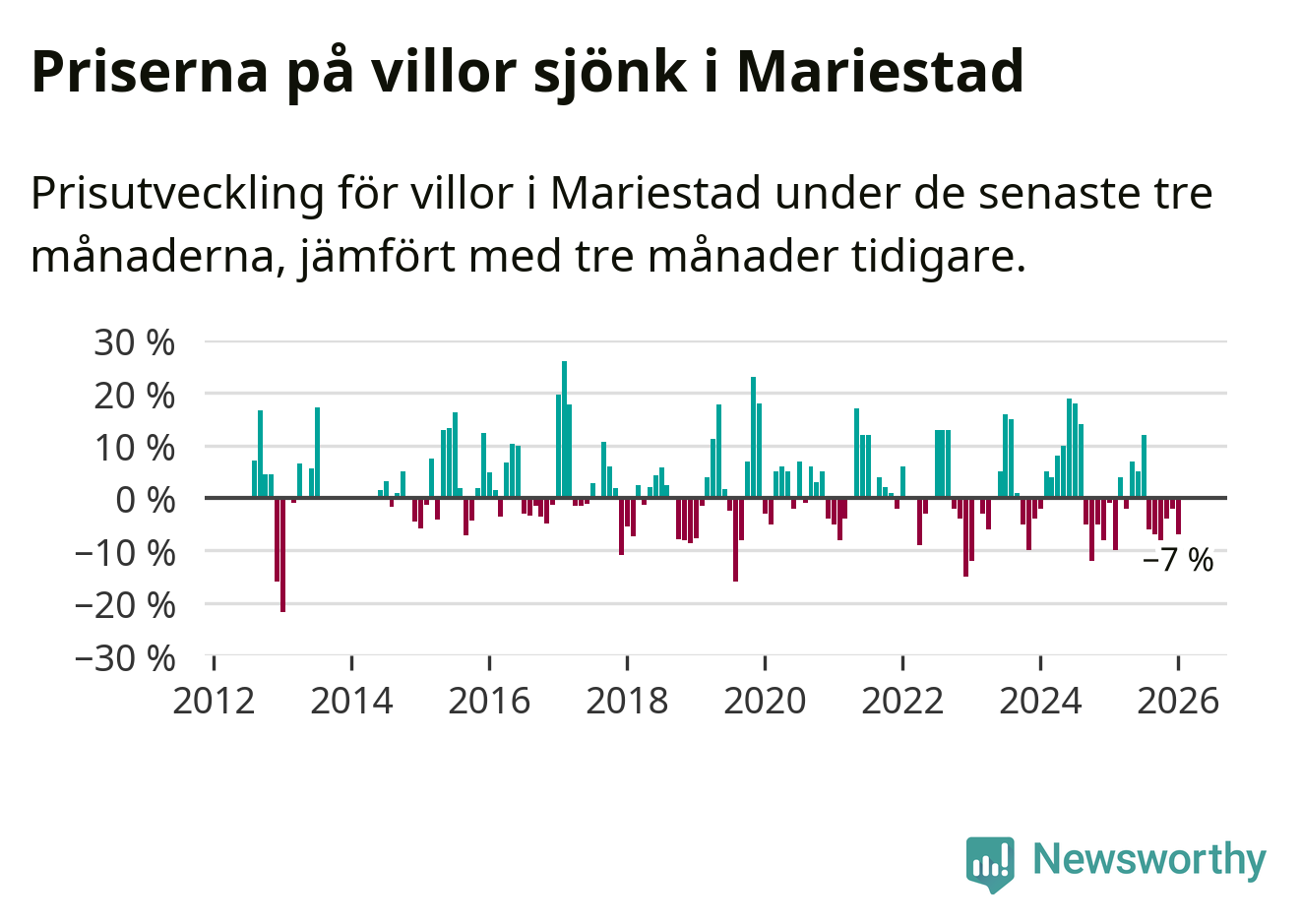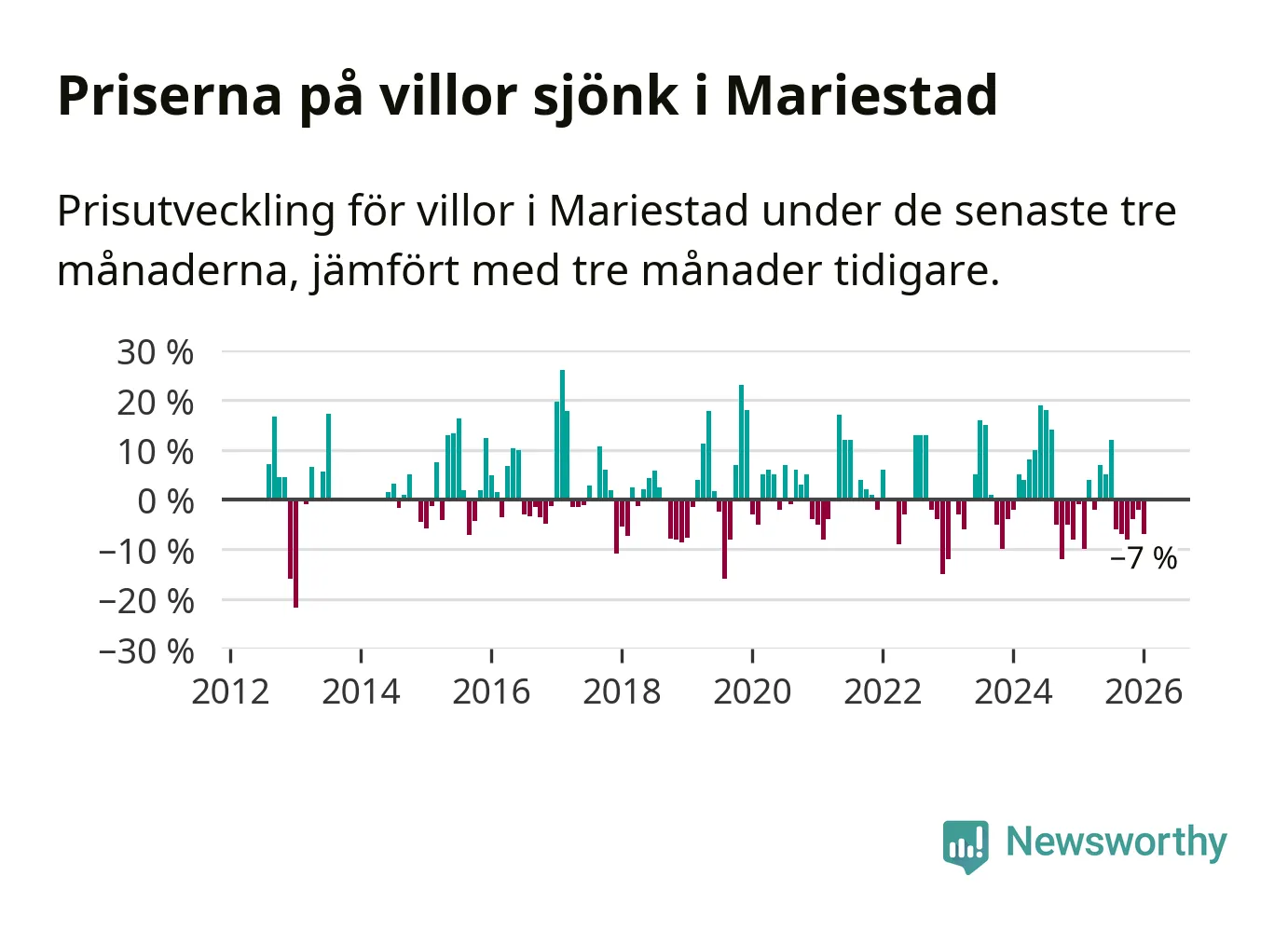 Villapriserna har gått ner i Mariestads kommun. Medelpriset på försäljningarna under de senaste tre månaderna visar på en nedgång med 7 procent.