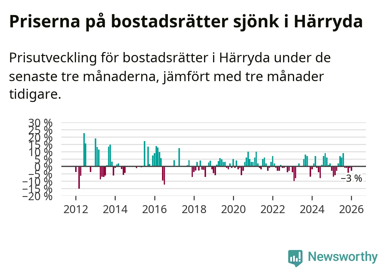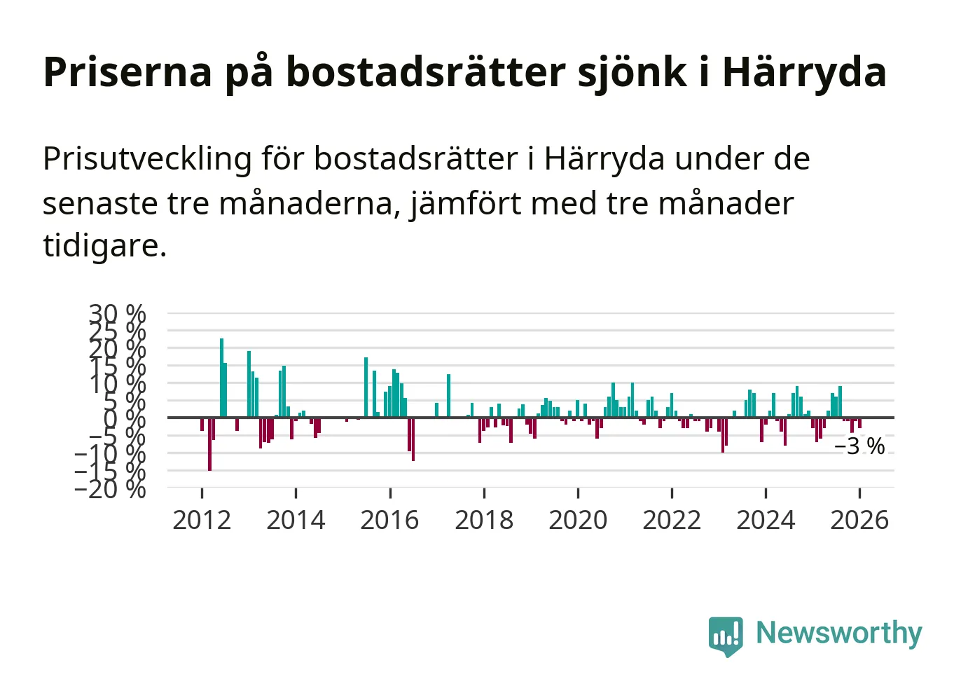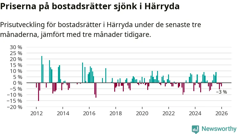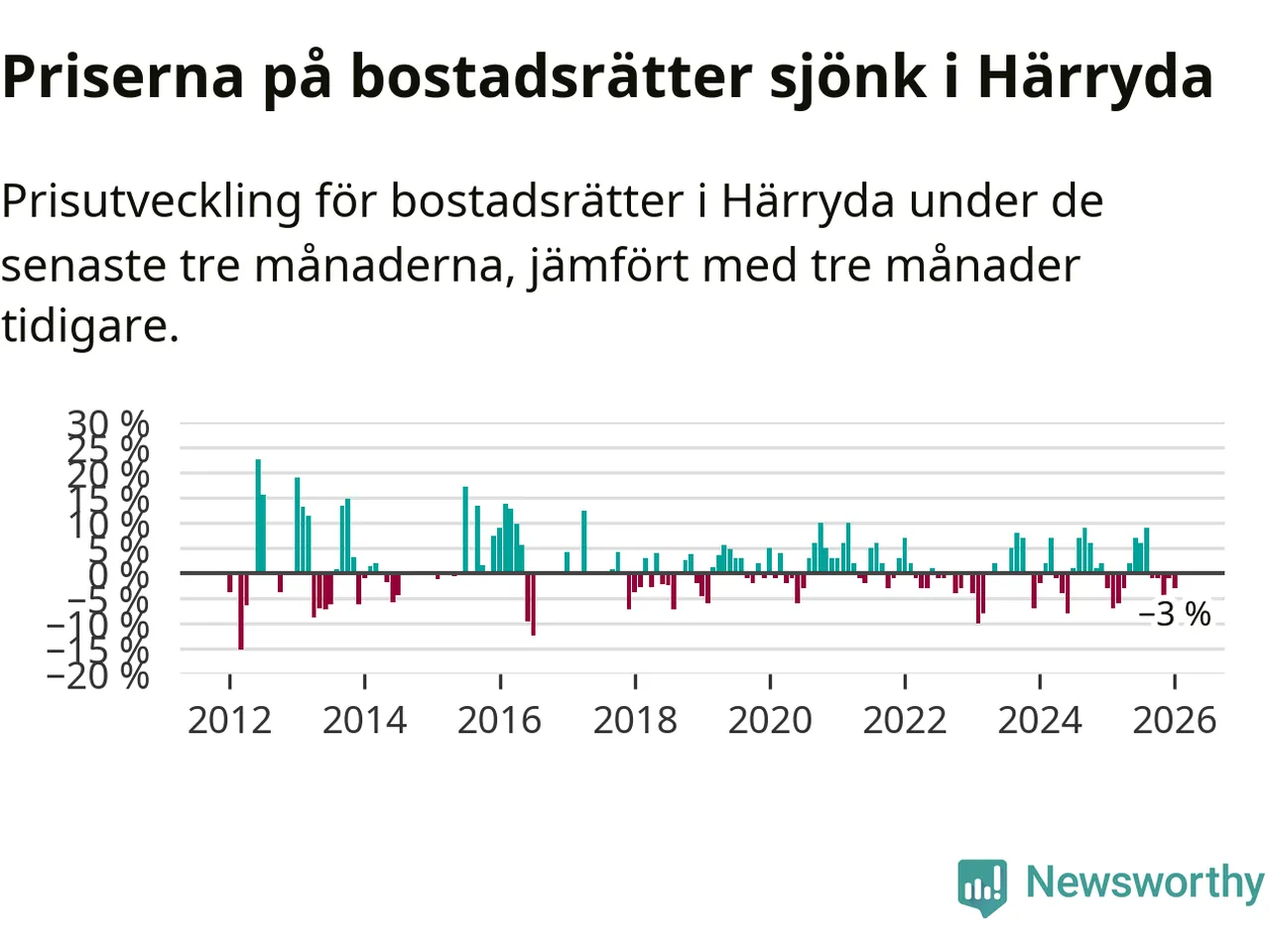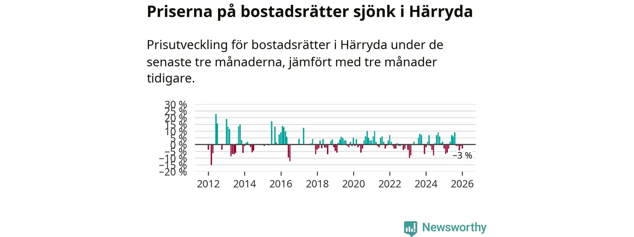 Priserna på bostadsrätter har gått ner i Härryda kommun. Medelpriset på försäljningarna under de senaste tre månaderna visar på en nedgång med 3 procent.