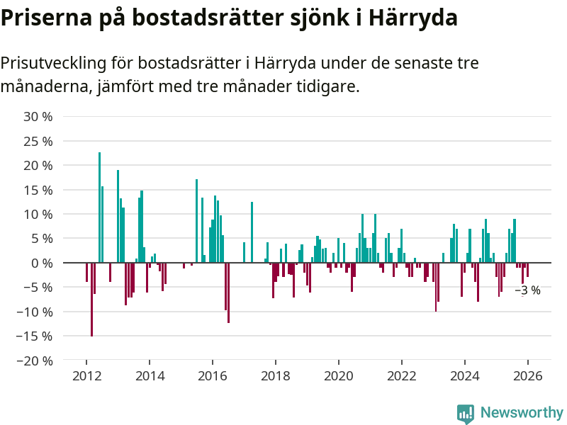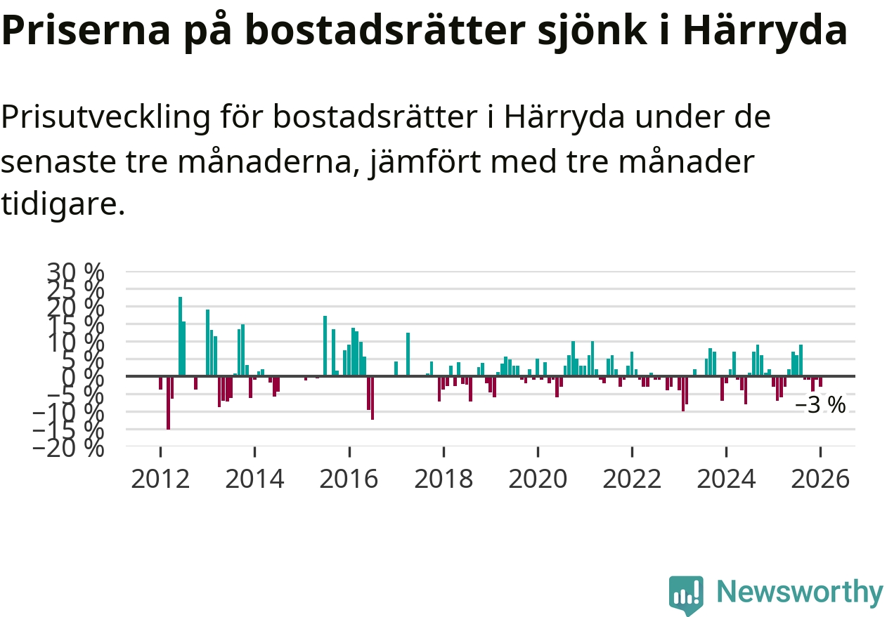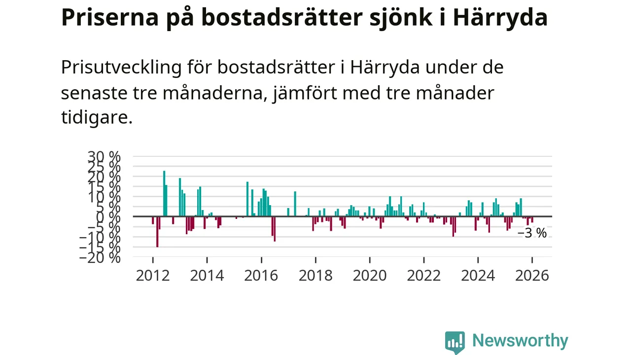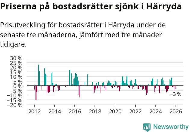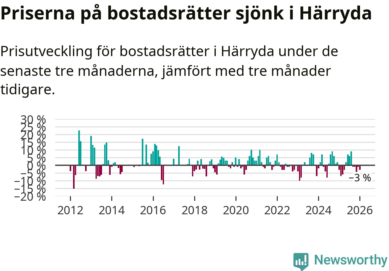 Priserna på bostadsrätter har gått ner i Härryda kommun. Medelpriset på försäljningarna under de senaste tre månaderna visar på en nedgång med 3 procent.