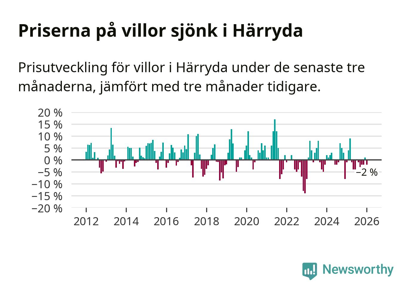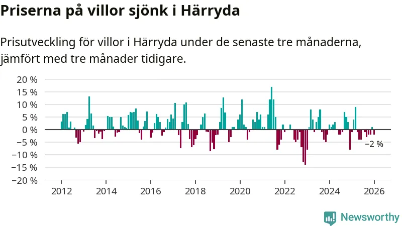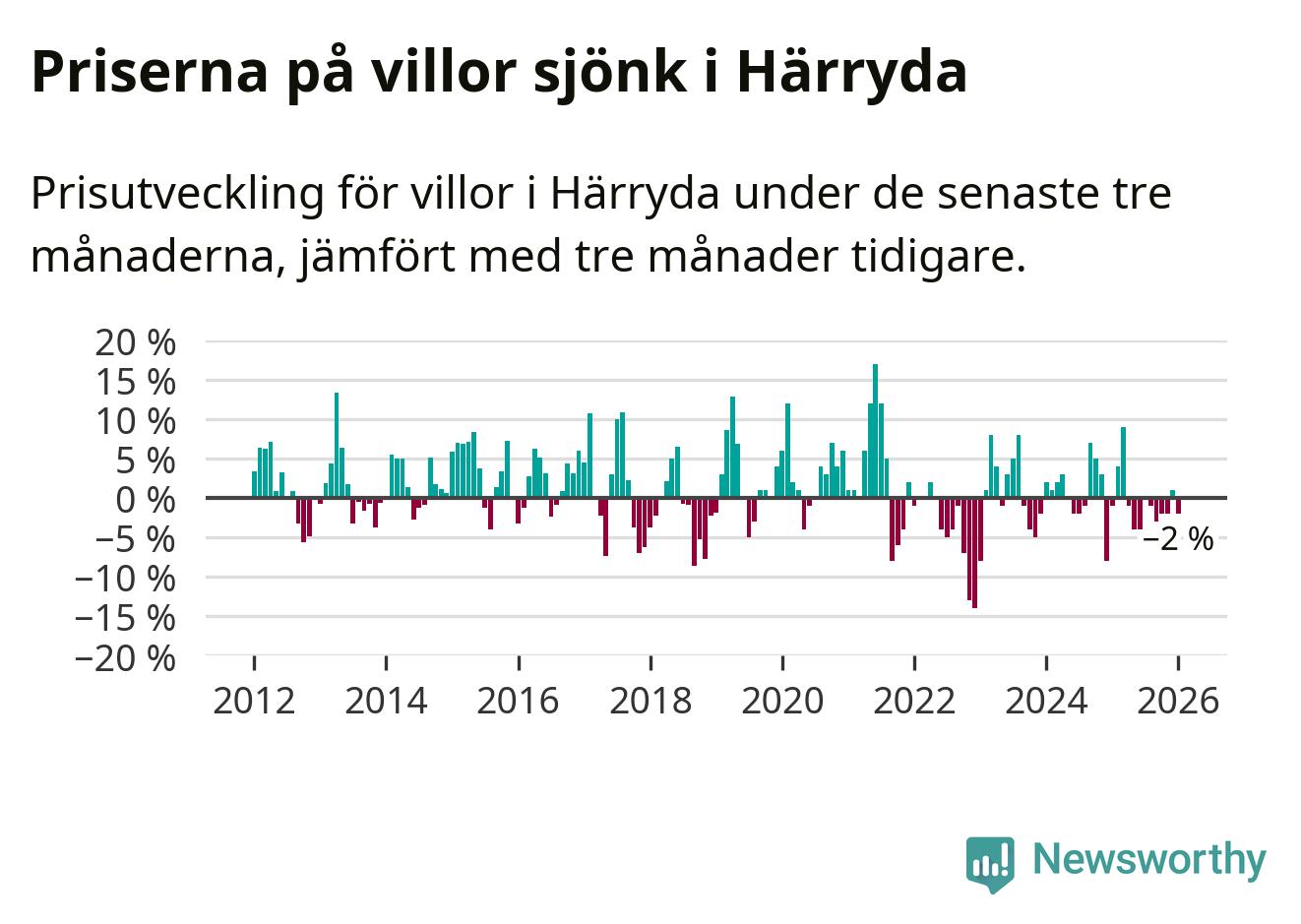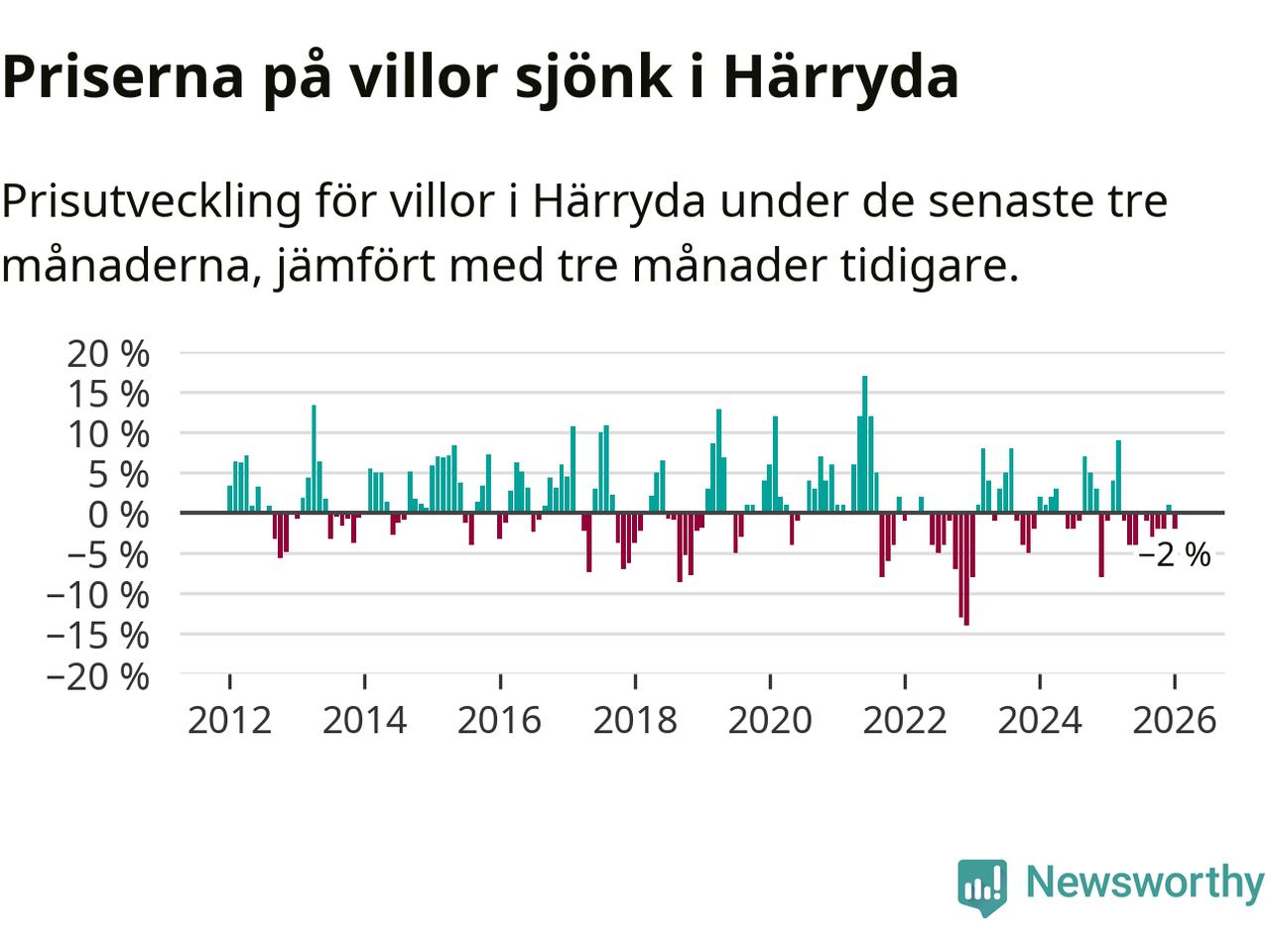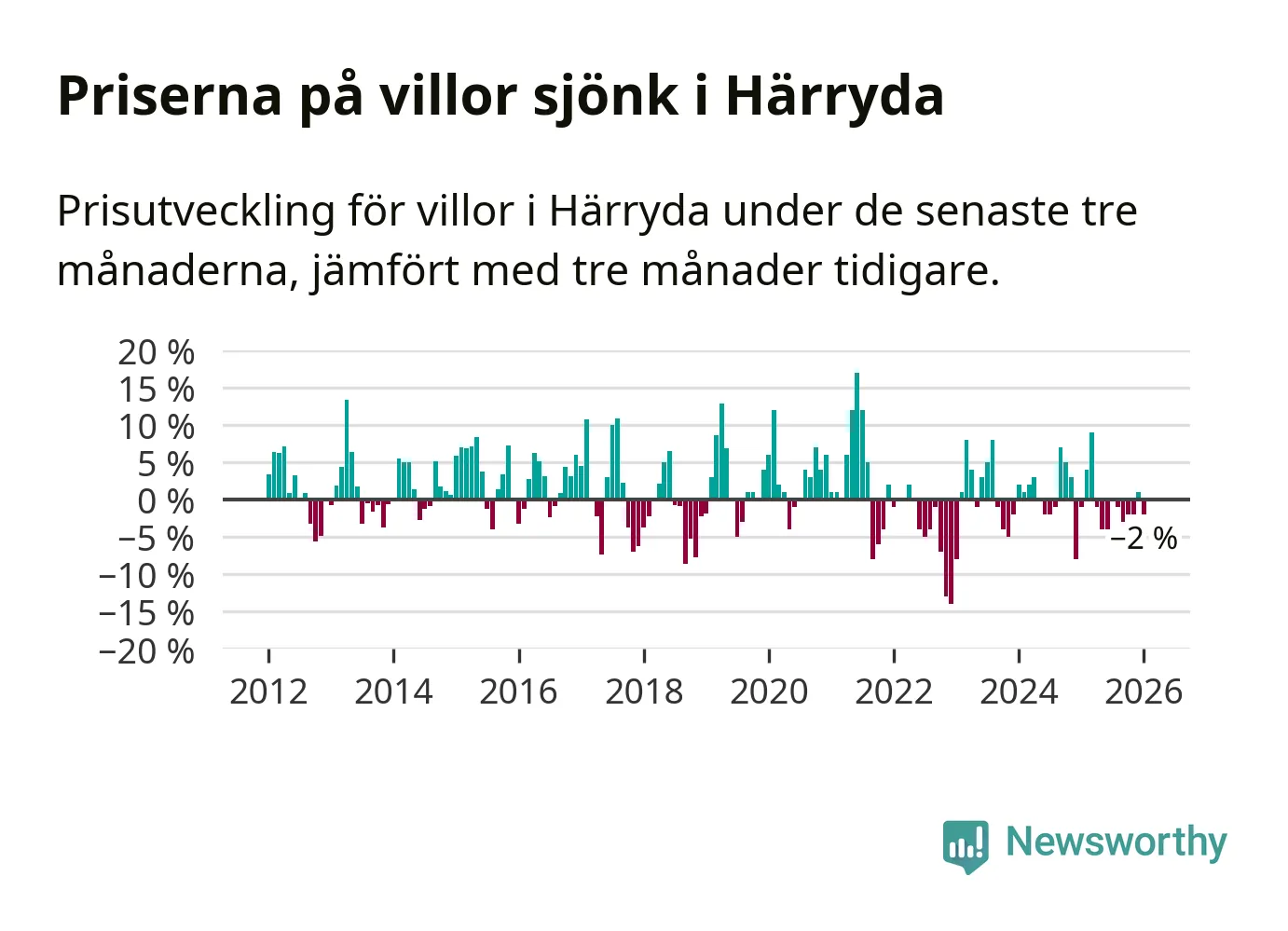 Villapriserna har gått ner i Härryda kommun. Medelpriset på försäljningarna under de senaste tre månaderna visar på en nedgång med 2 procent.