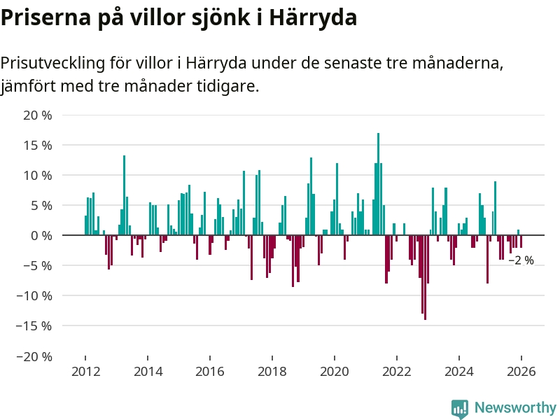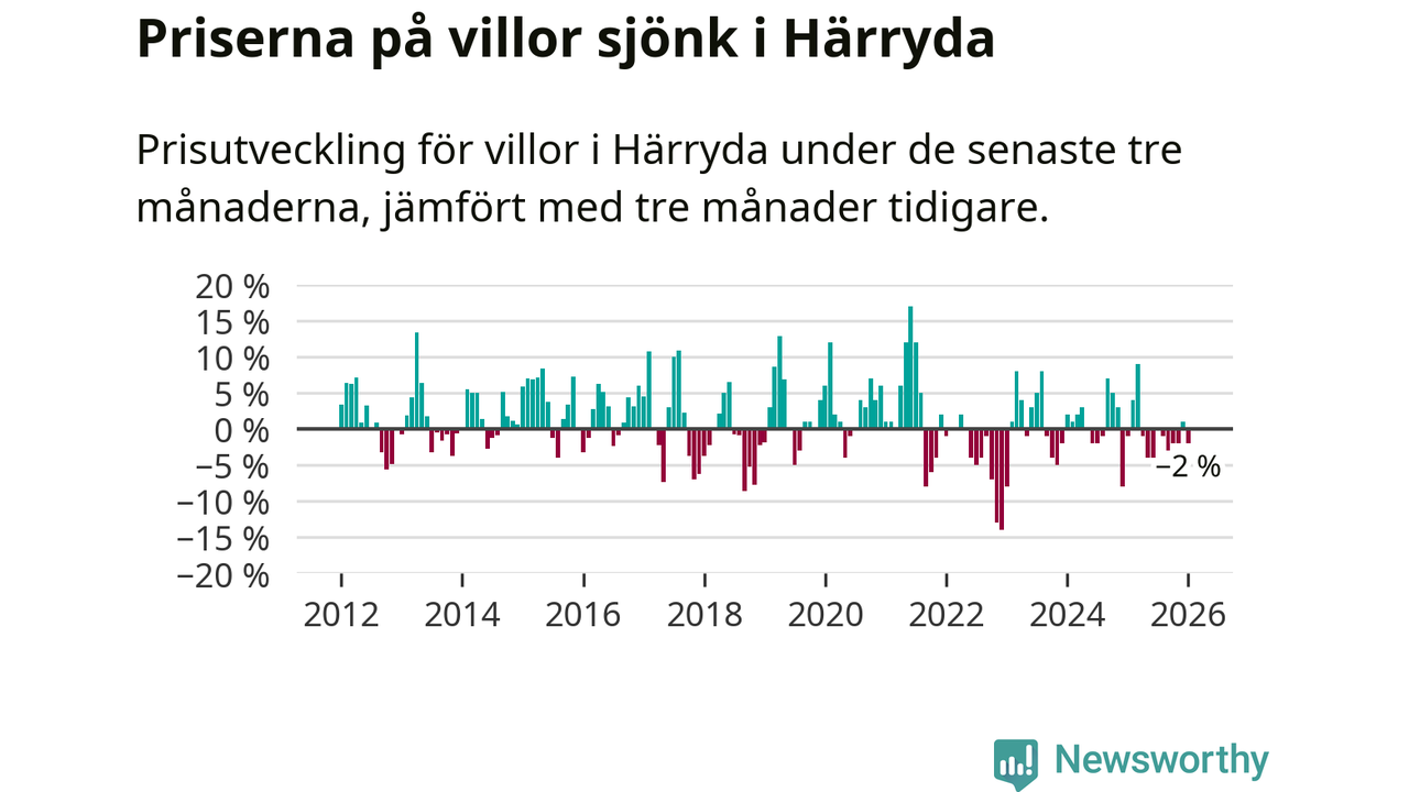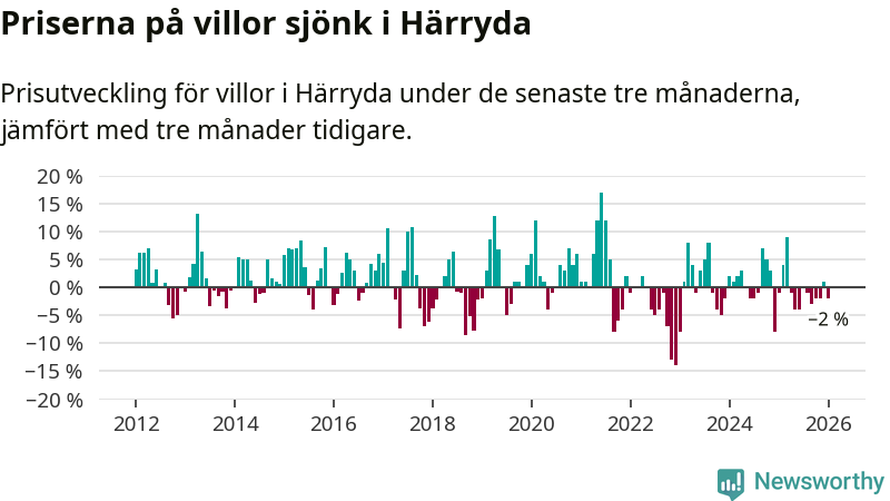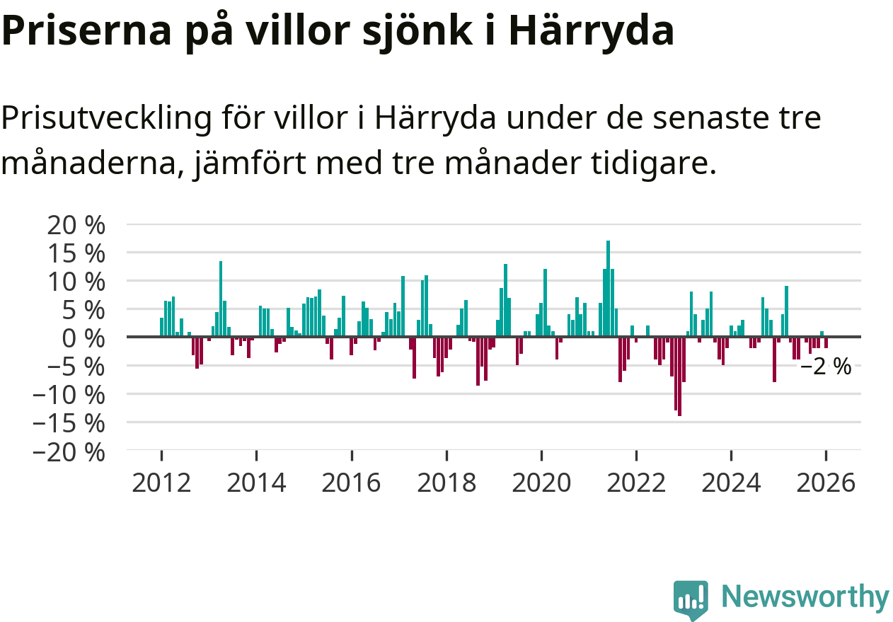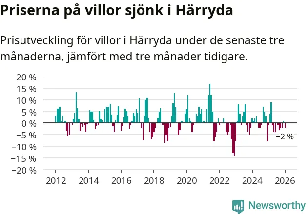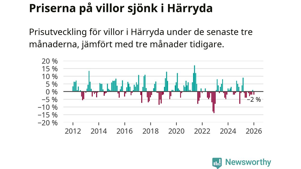 Villapriserna har gått ner i Härryda kommun. Medelpriset på försäljningarna under de senaste tre månaderna visar på en nedgång med 2 procent.