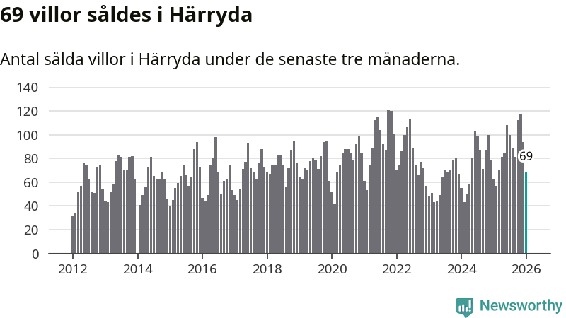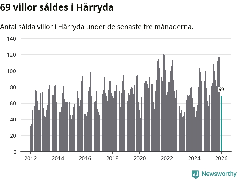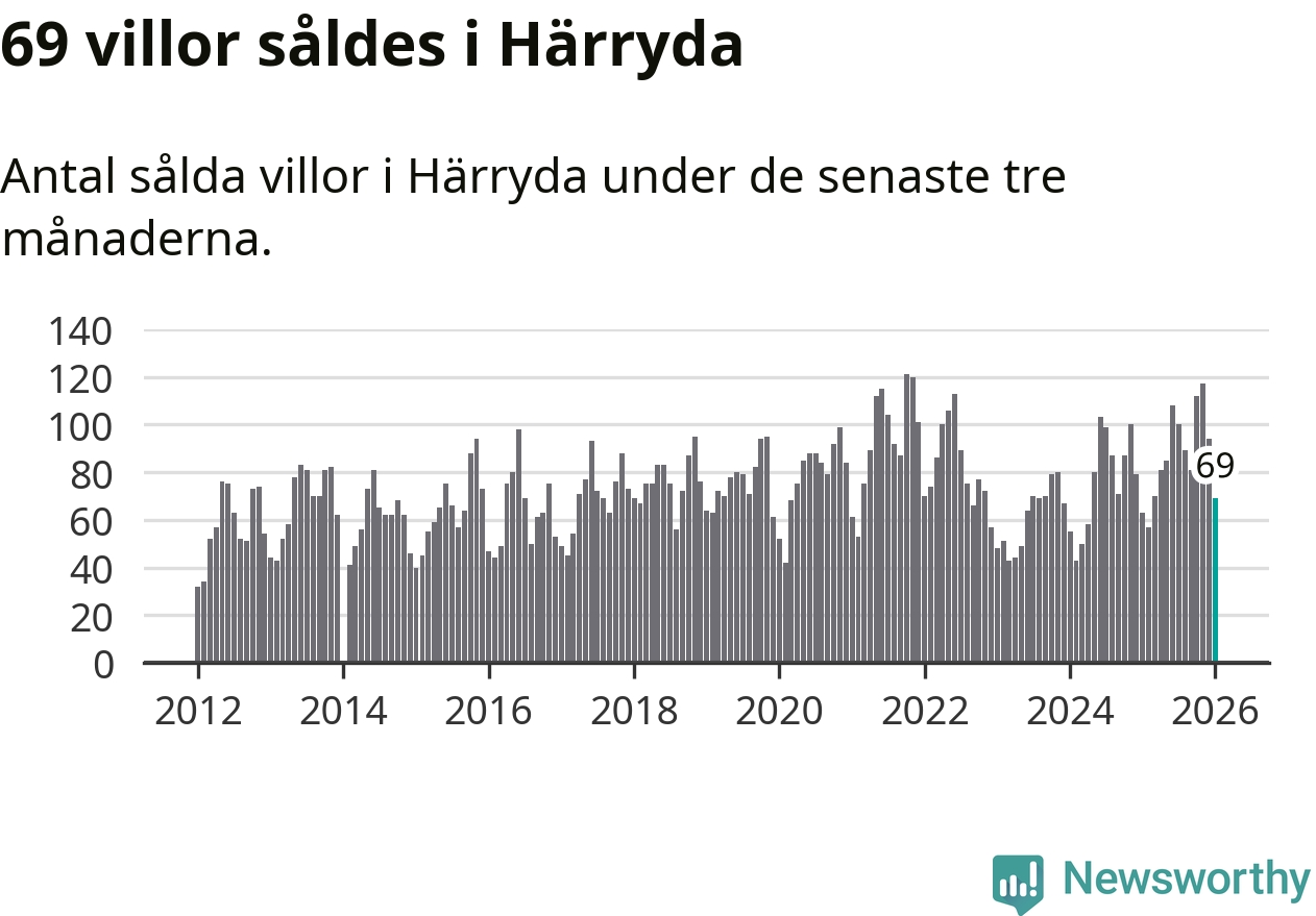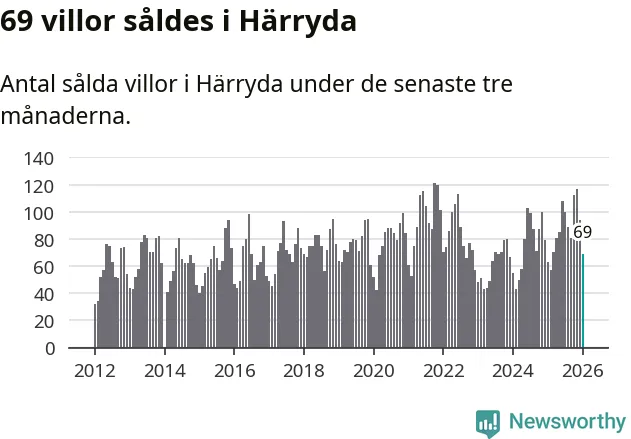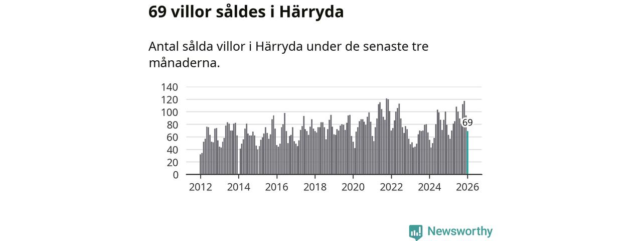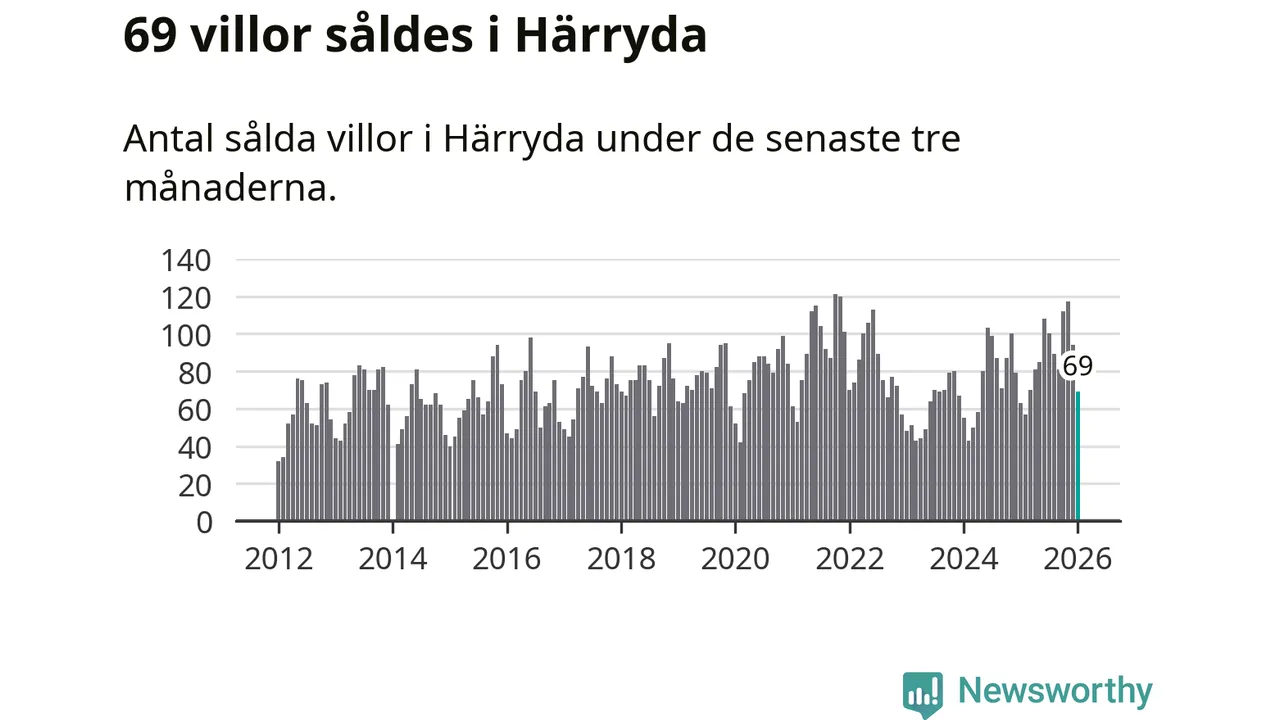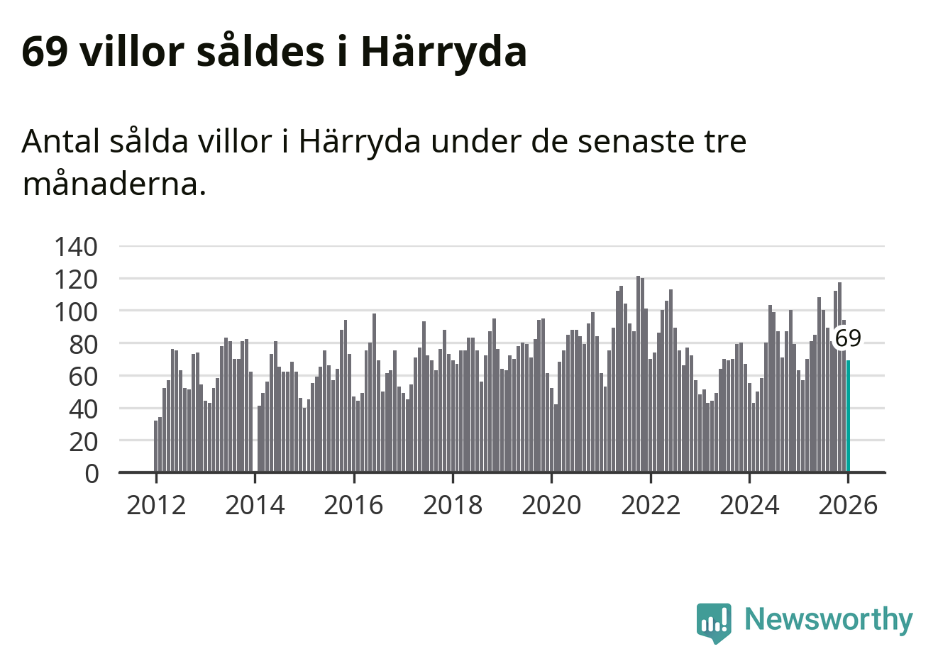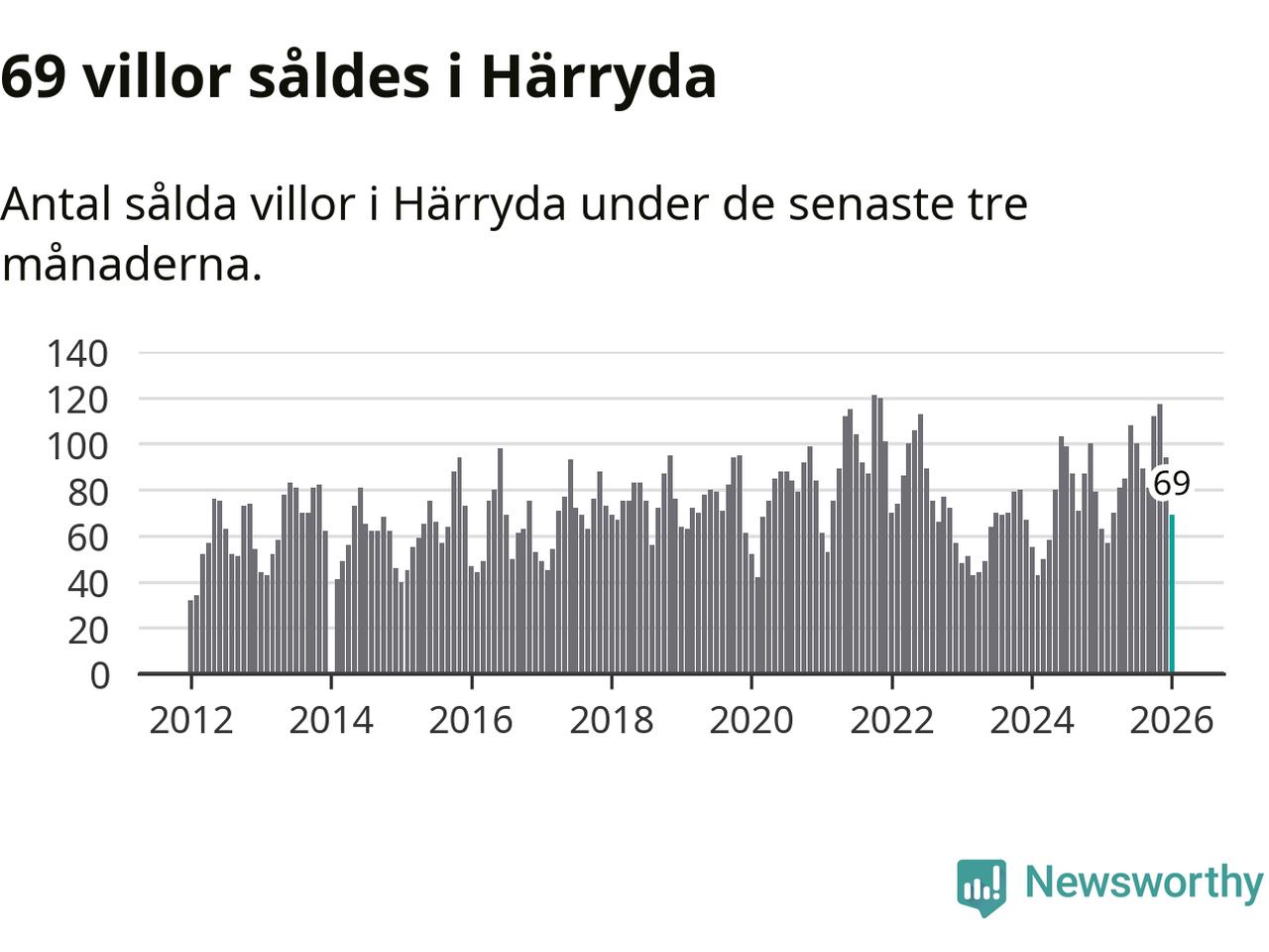 Sammanlagt såldes 69 villor i Härryda kommun mellan november och januari till ett genomsnittligt pris på 5,0 miljoner kronor. I fjol gjordes 63 affärer vid den här tiden på året.
