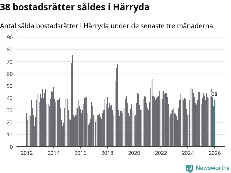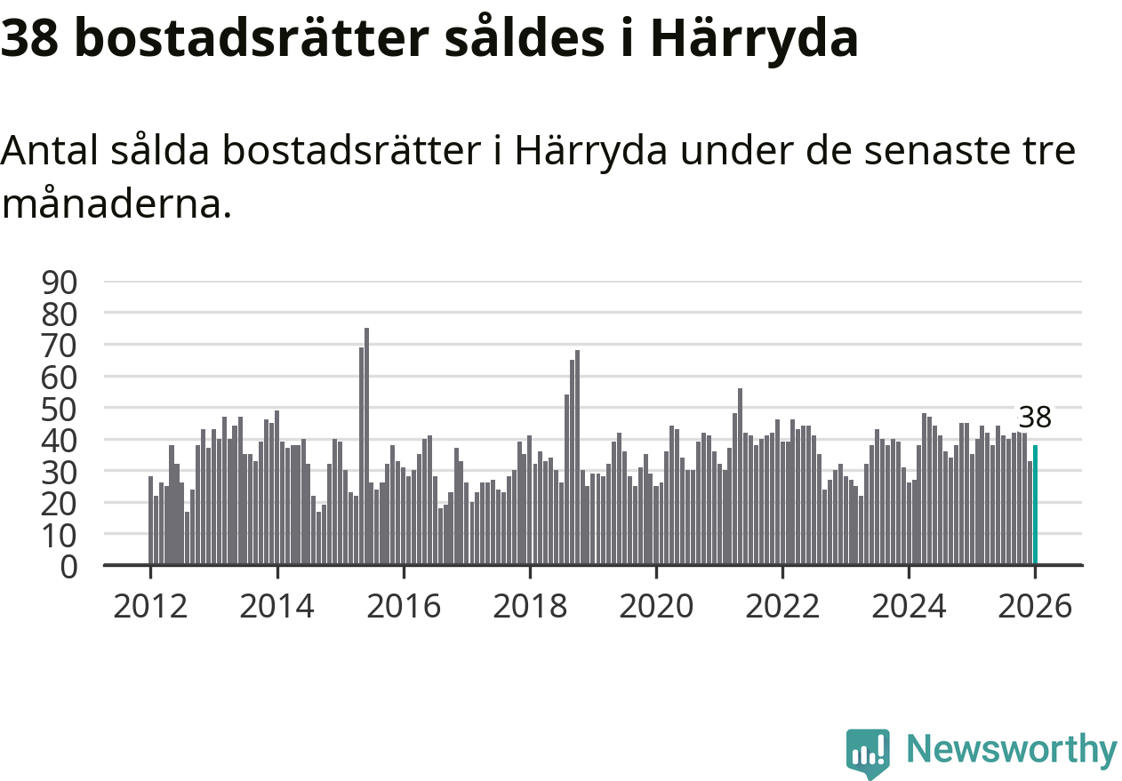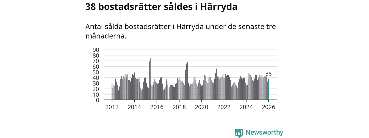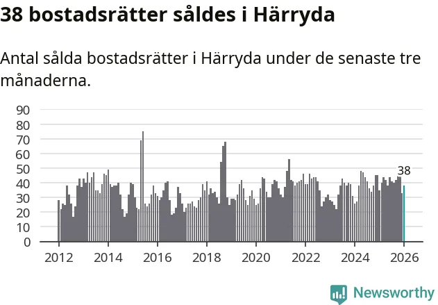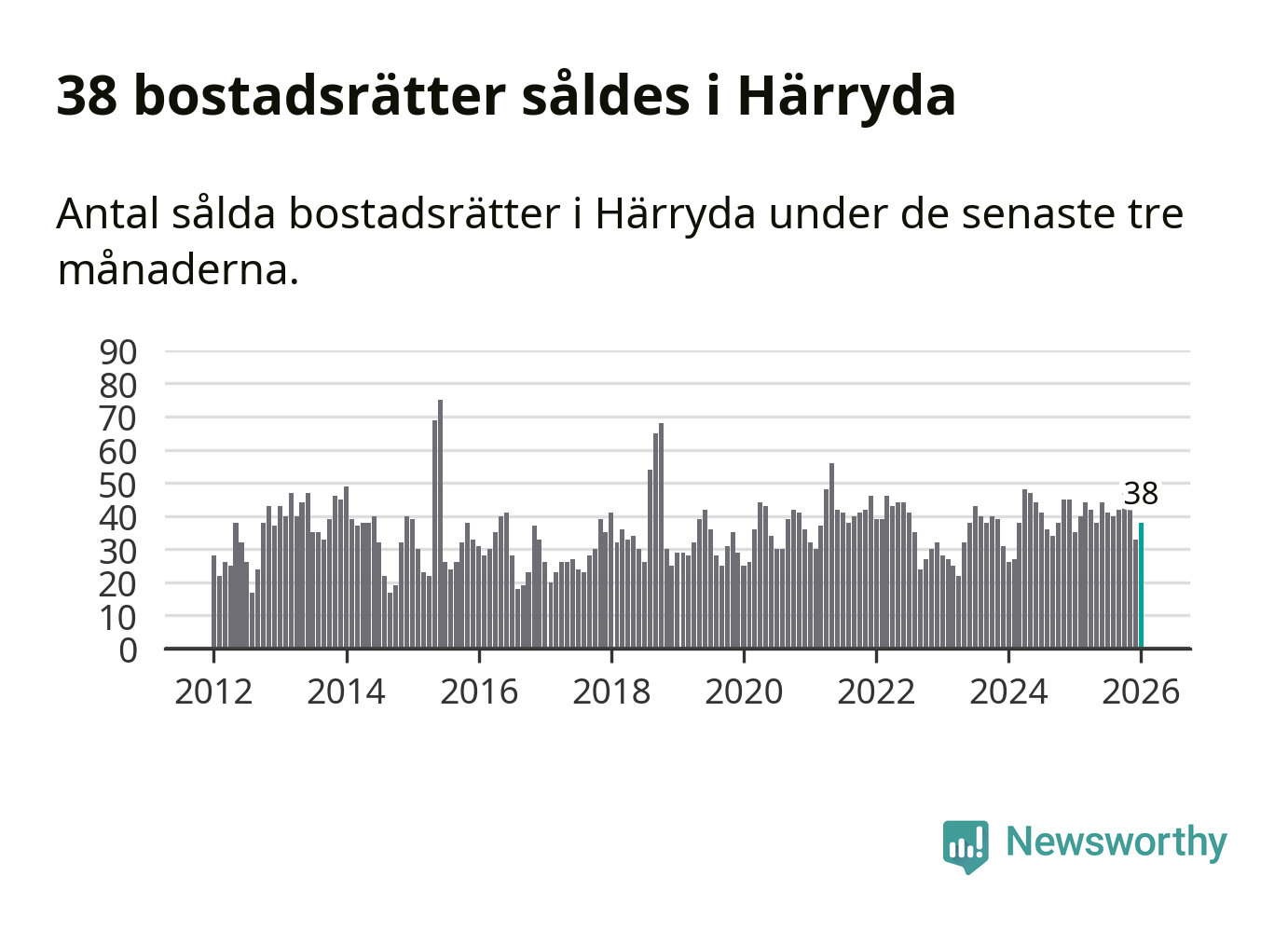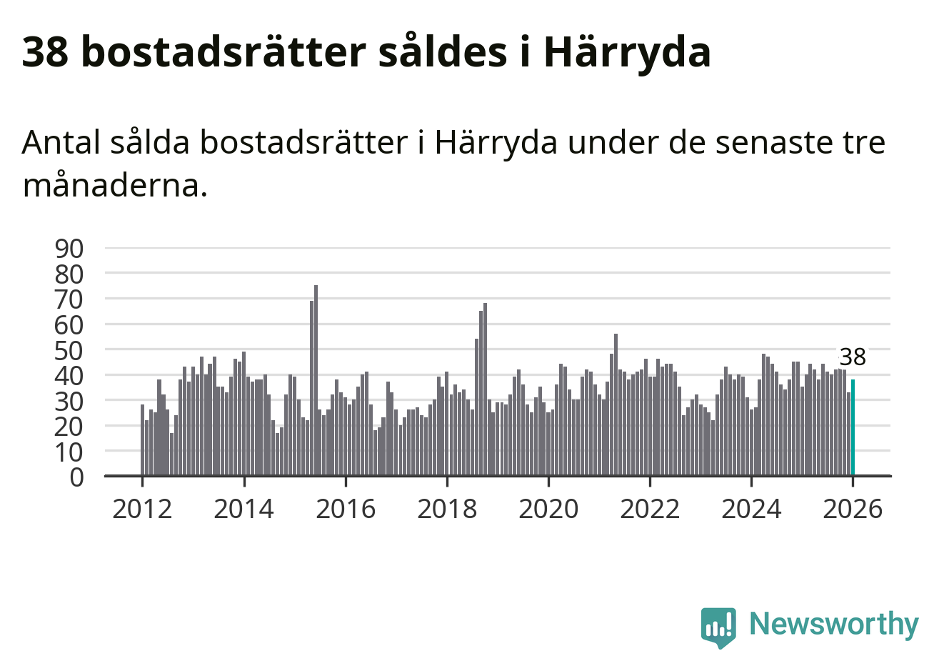 Sammanlagt såldes 38 bostadsrätter i Härryda kommun mellan november och januari till ett genomsnittligt pris på 3,4 miljoner kronor. I fjol gjordes 35 affärer vid den här tiden på året.