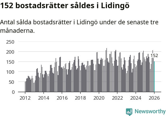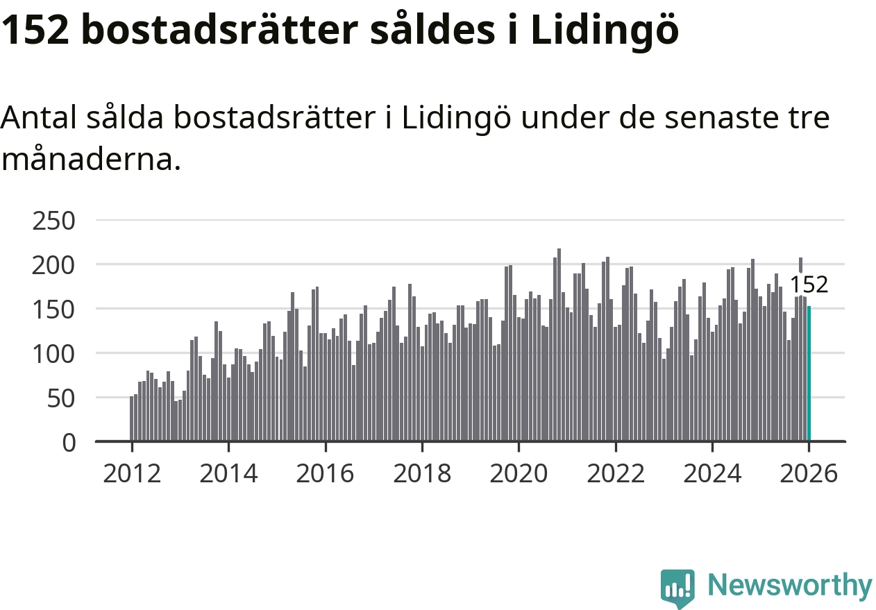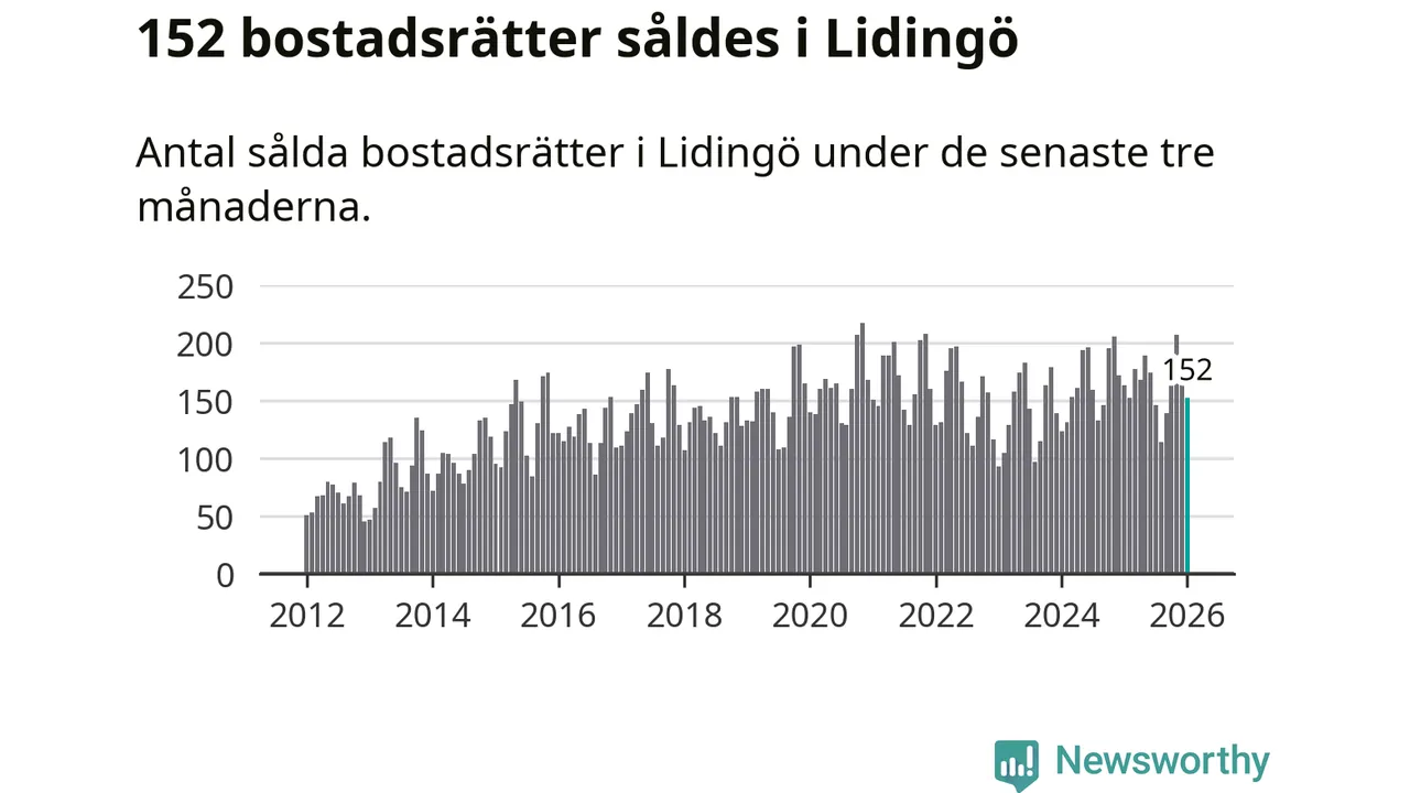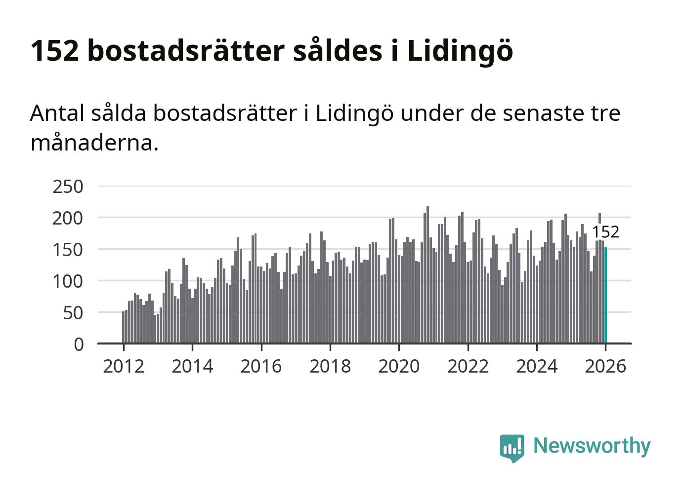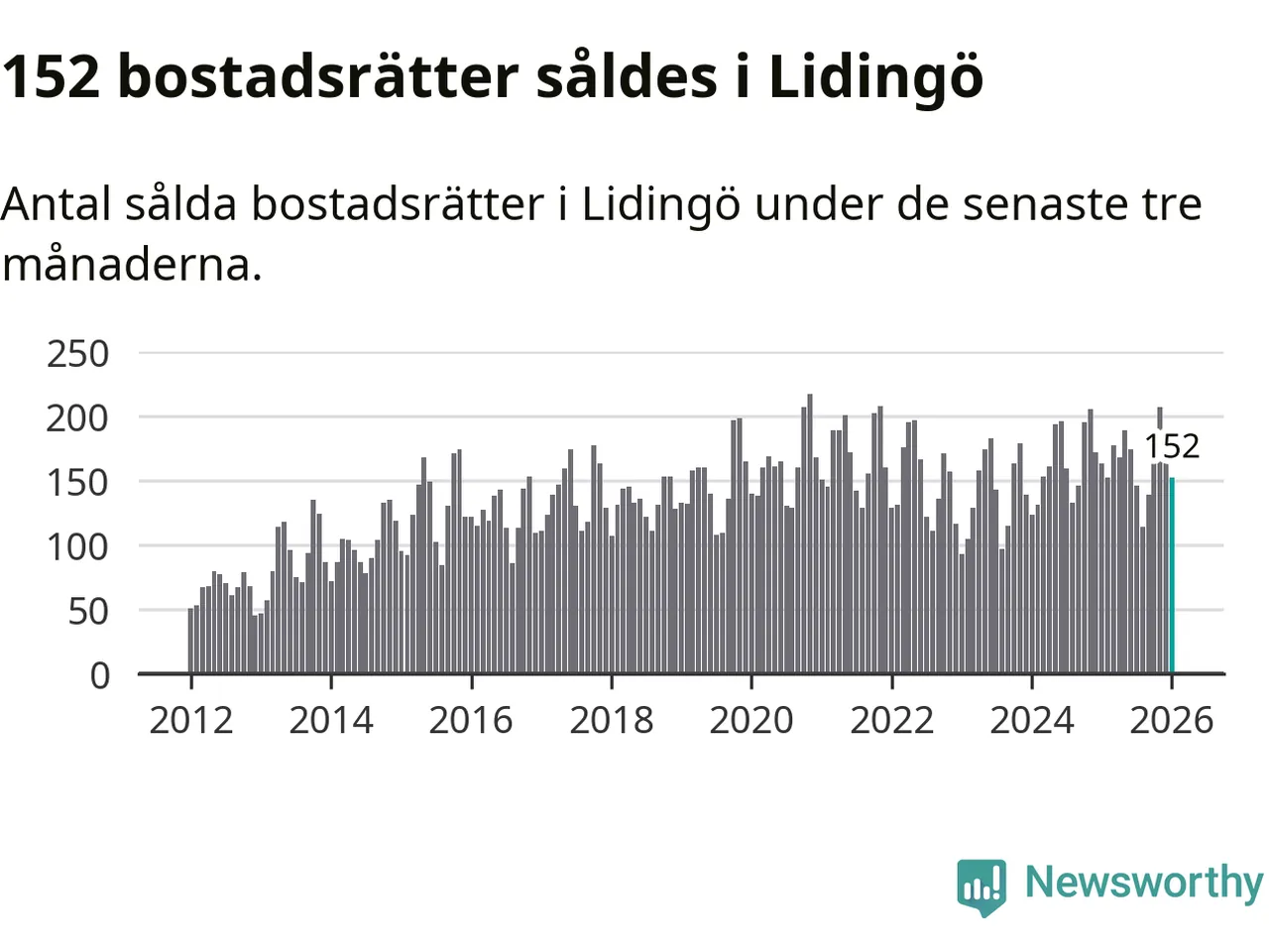 Sammanlagt såldes 152 bostadsrätter i Lidingö kommun mellan november och januari till ett genomsnittligt pris på 4,4 miljoner kronor. I fjol gjordes 163 affärer vid den här tiden på året.