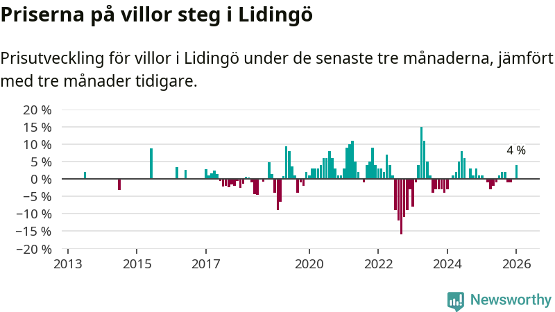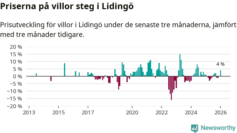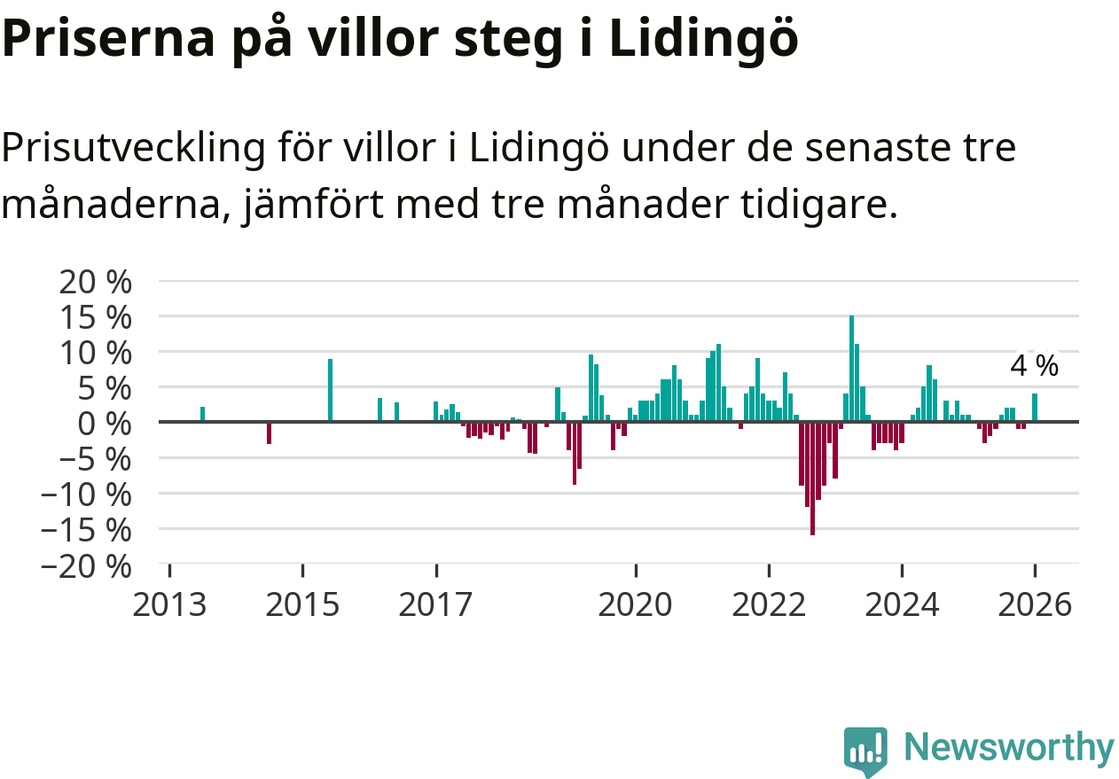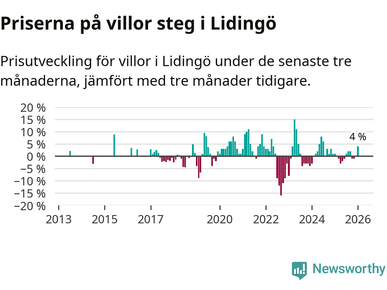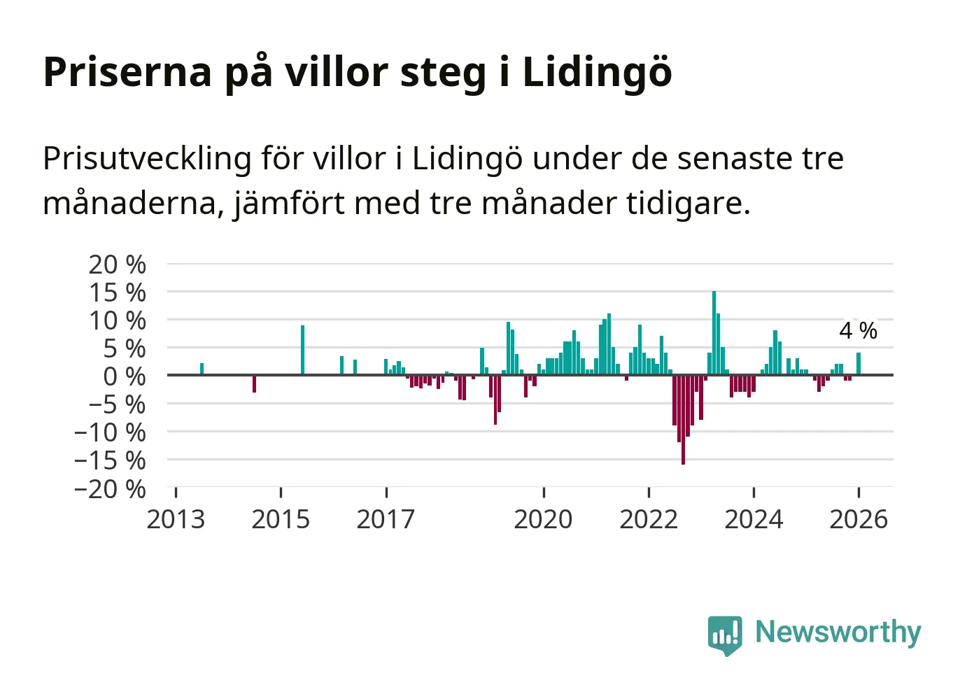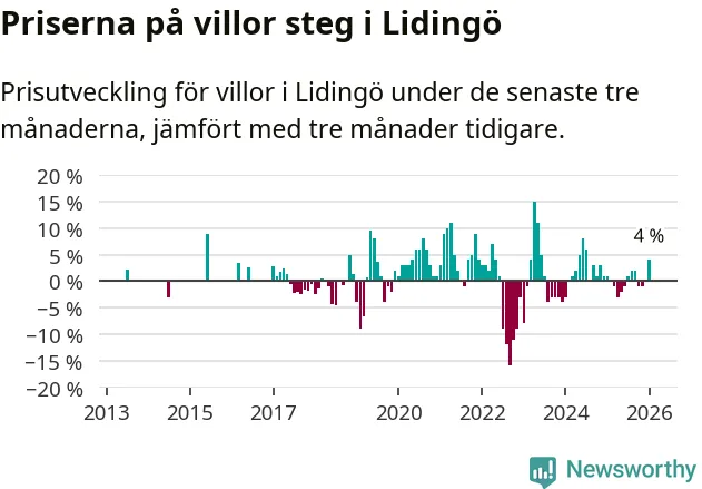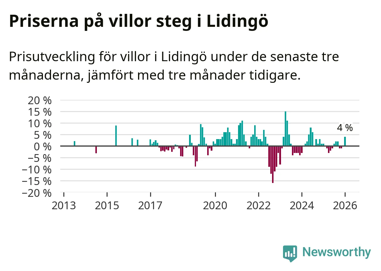 Villapriserna har gått upp i Lidingö kommun. Medelpriset på försäljningarna under de senaste tre månaderna visar på en uppgång med 4 procent.