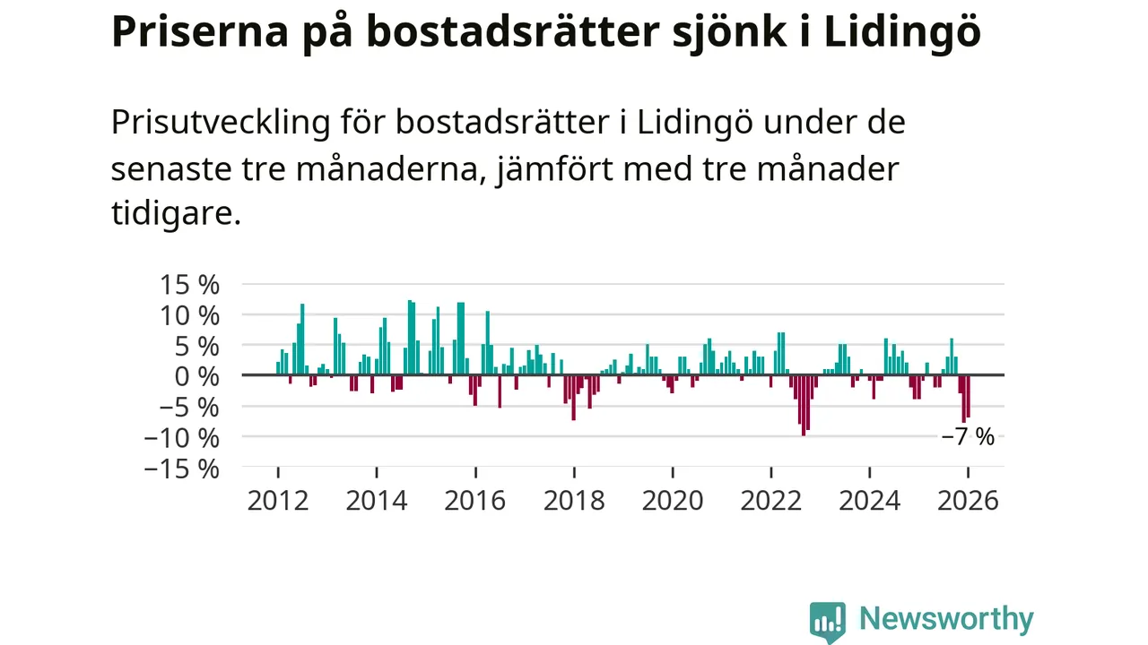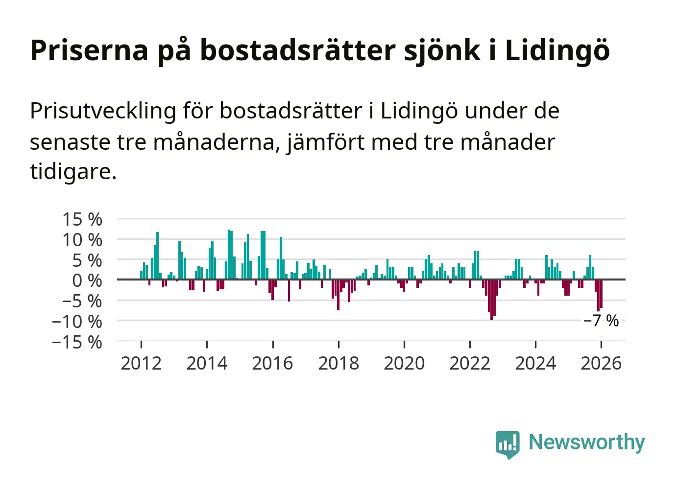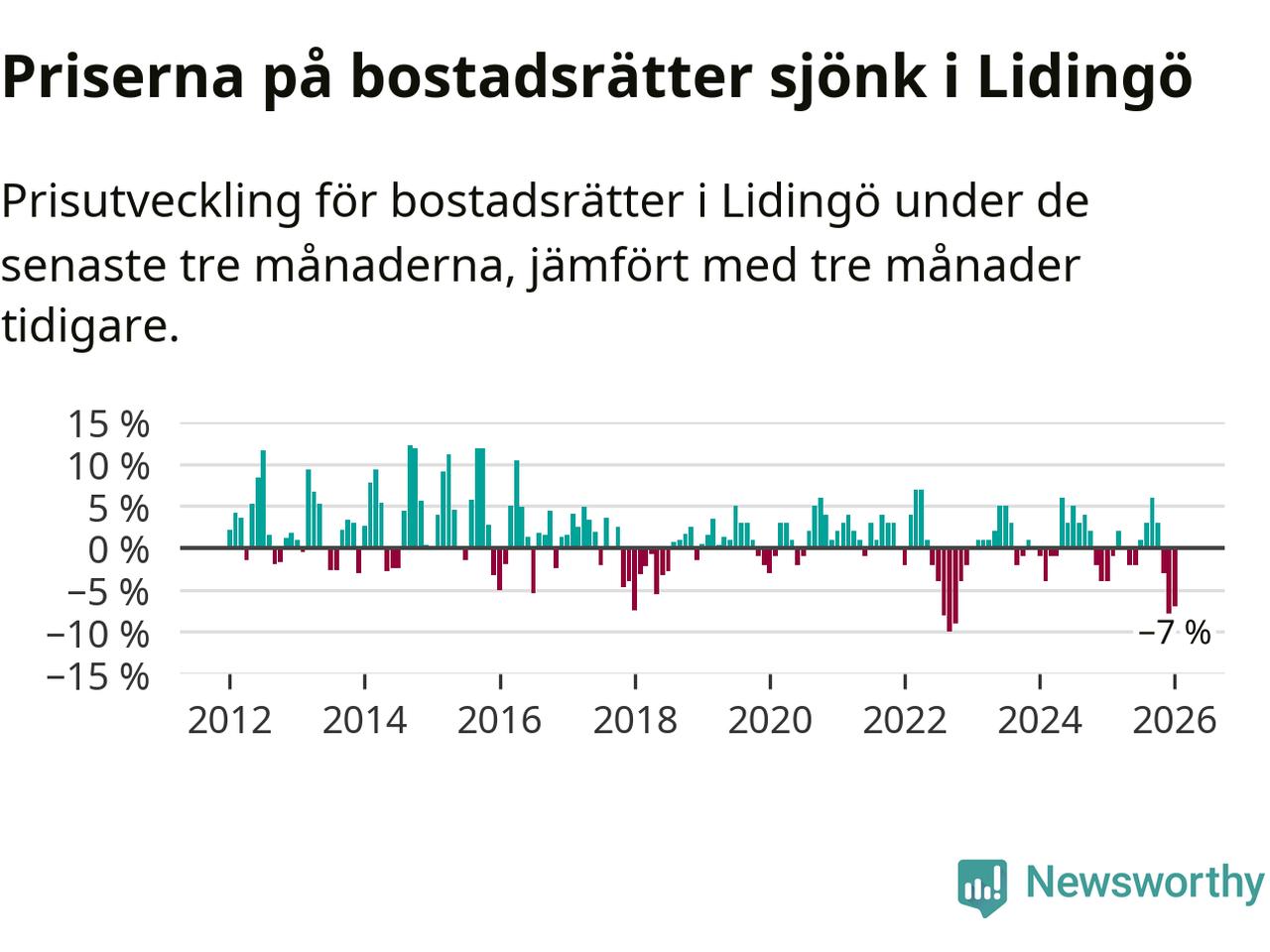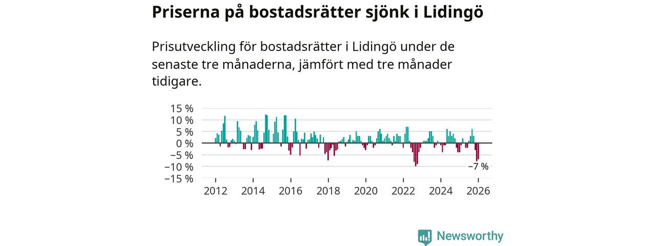 Priserna på bostadsrätter sjönk mellan november och januari med 7 procent i Lidingö kommun. Det är en betydande nedgång jämfört med det gångna året då priserna i snitt sjunkit med 1 procent.