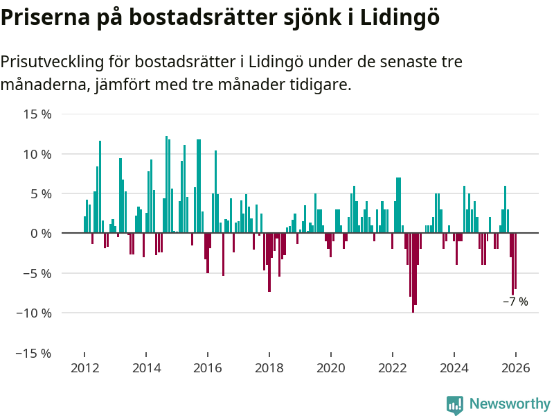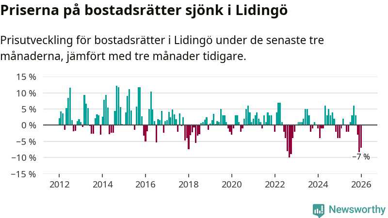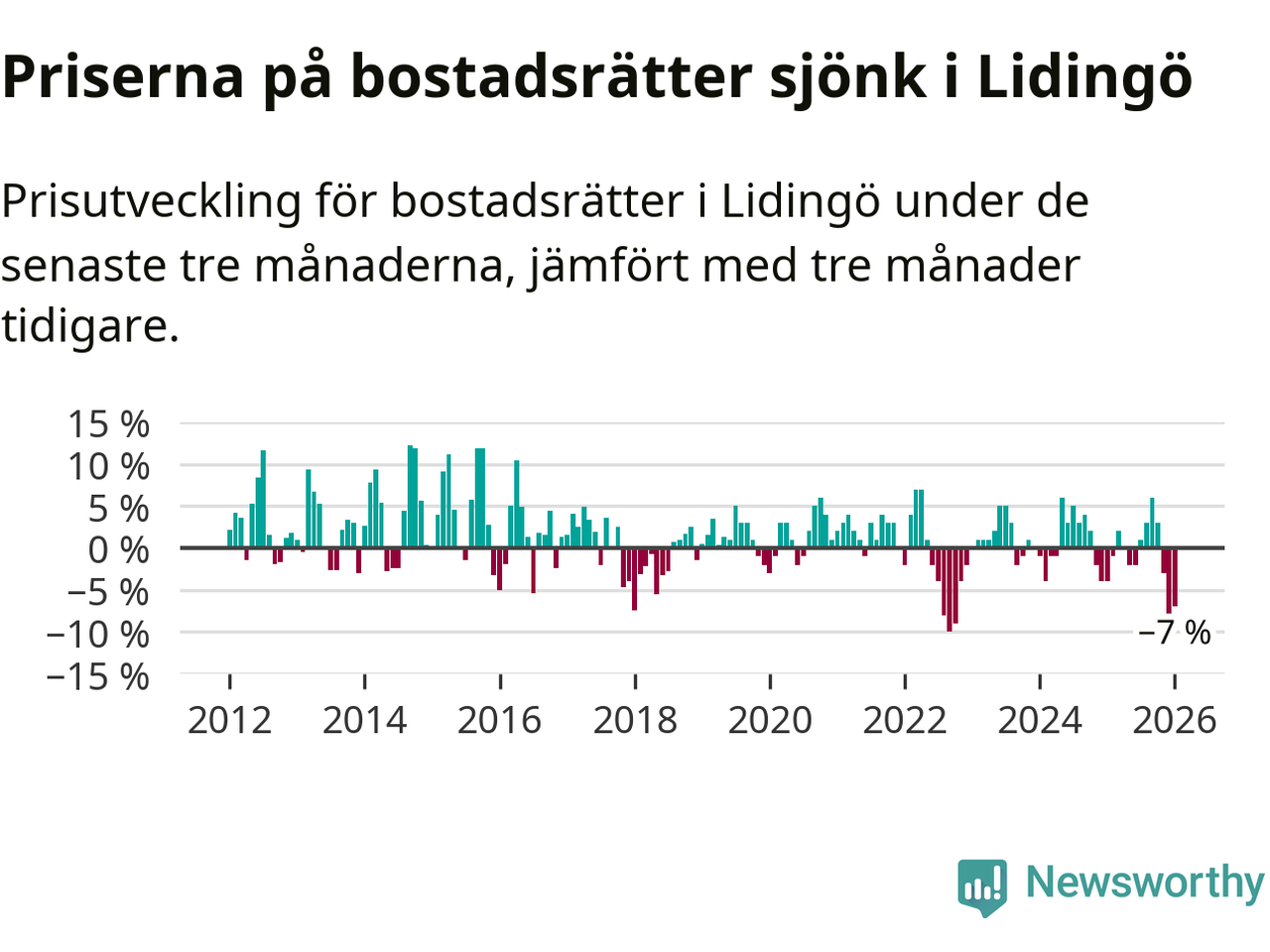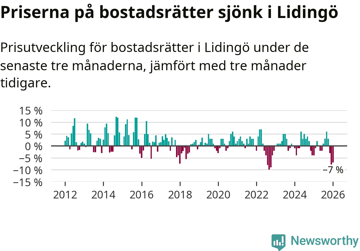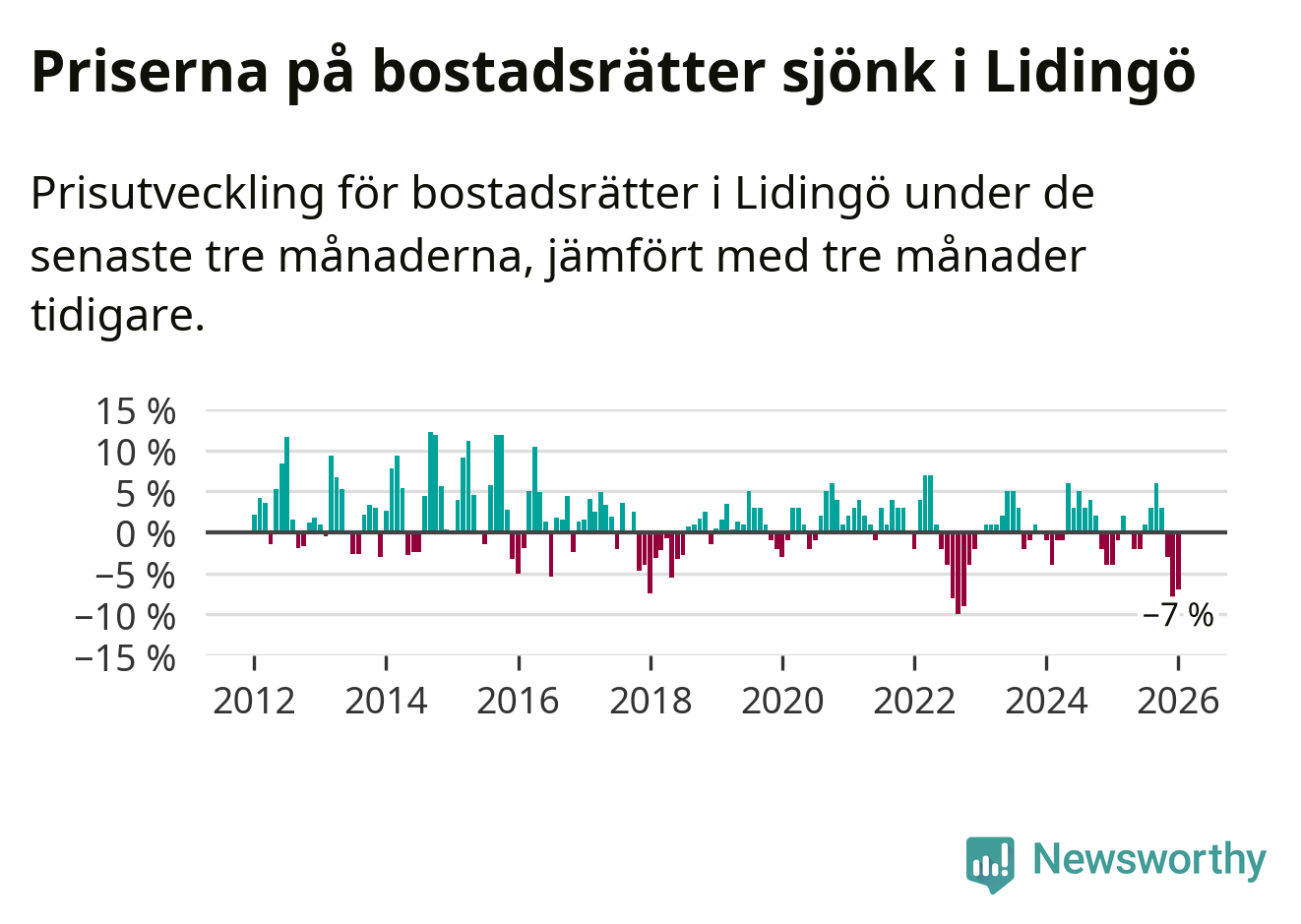 Priserna på bostadsrätter sjönk mellan november och januari med 7 procent i Lidingö kommun. Det är en betydande nedgång jämfört med det gångna året då priserna i snitt sjunkit med 1 procent.