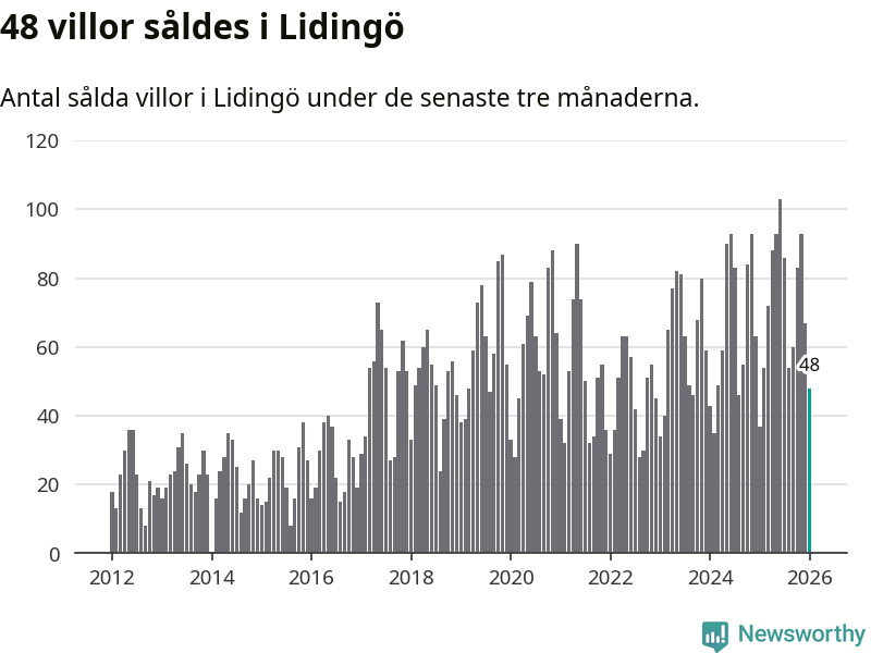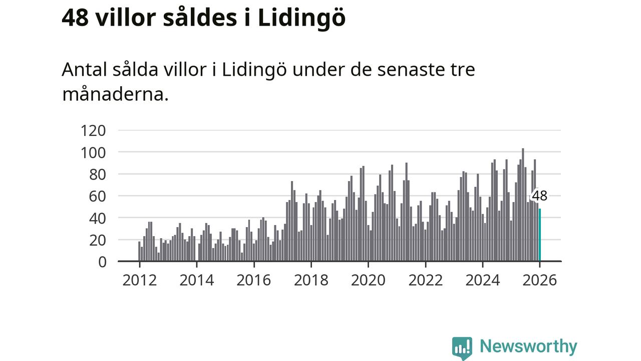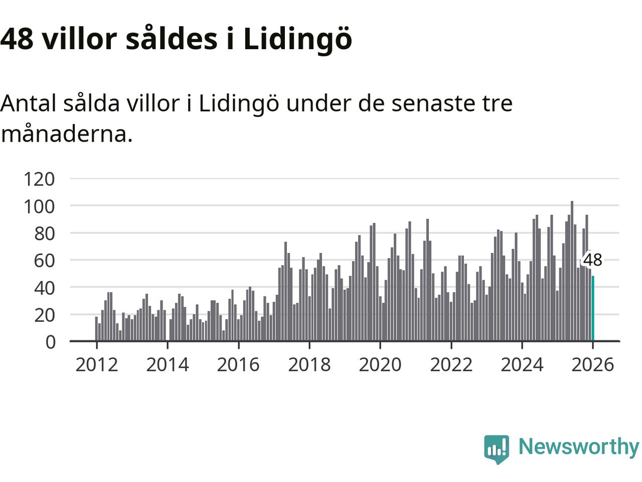Sammanlagt såldes 48 villor i Lidingö kommun mellan november och januari till ett genomsnittligt pris på 15,1 miljoner kronor. I fjol gjordes 37 affärer vid den här tiden på året.