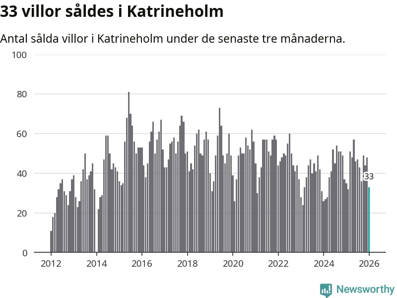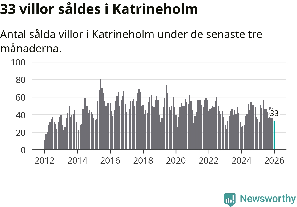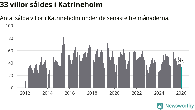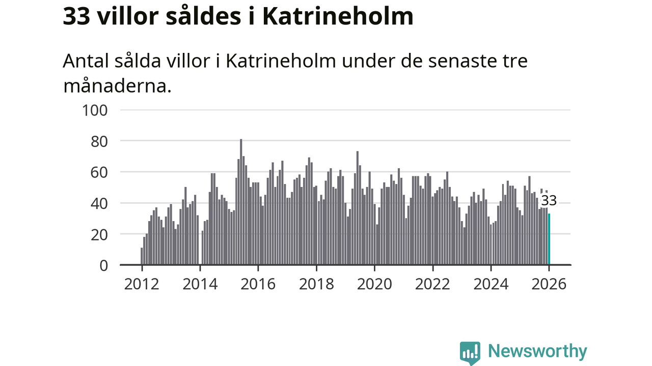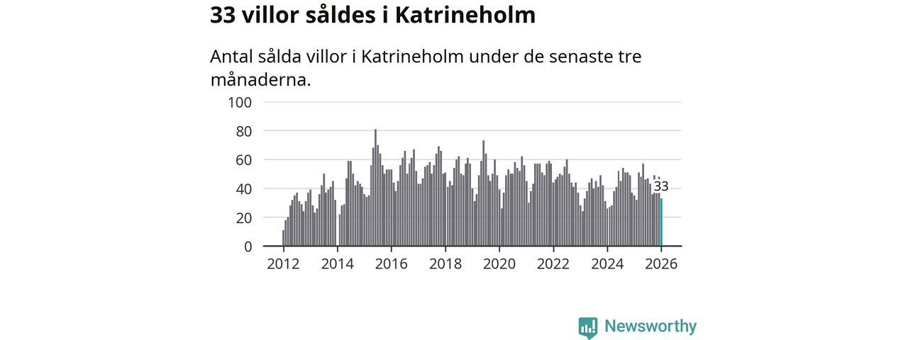 Sammanlagt såldes 33 villor i Katrineholms kommun mellan november och januari till ett genomsnittligt pris på 2,5 miljoner kronor. I fjol gjordes 35 affärer vid den här tiden på året.