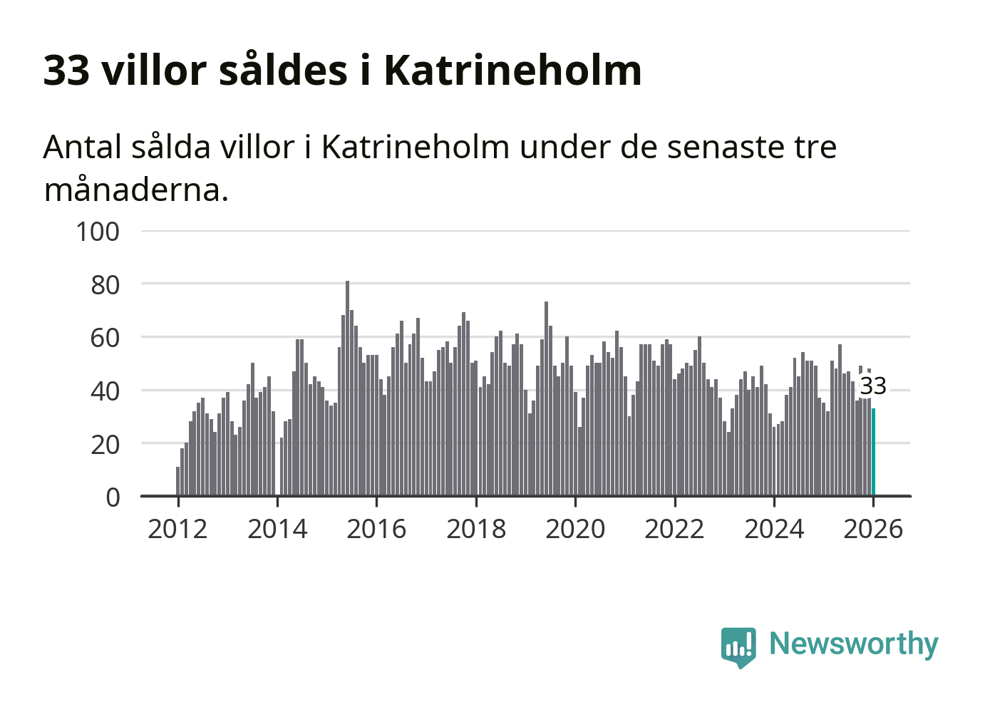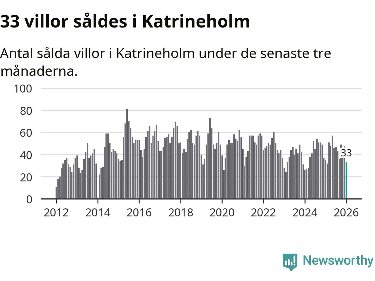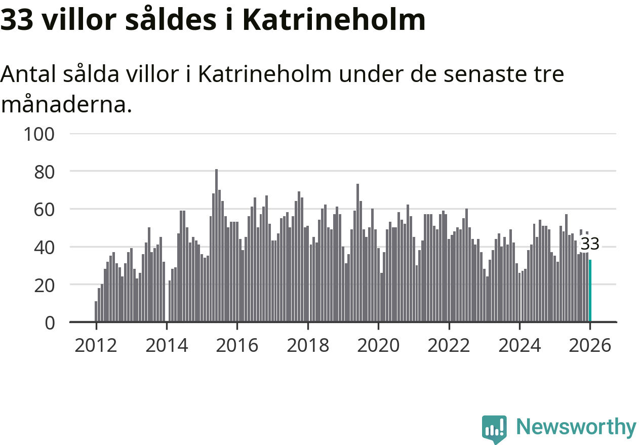 Sammanlagt såldes 33 villor i Katrineholms kommun mellan november och januari till ett genomsnittligt pris på 2,5 miljoner kronor. I fjol gjordes 35 affärer vid den här tiden på året.