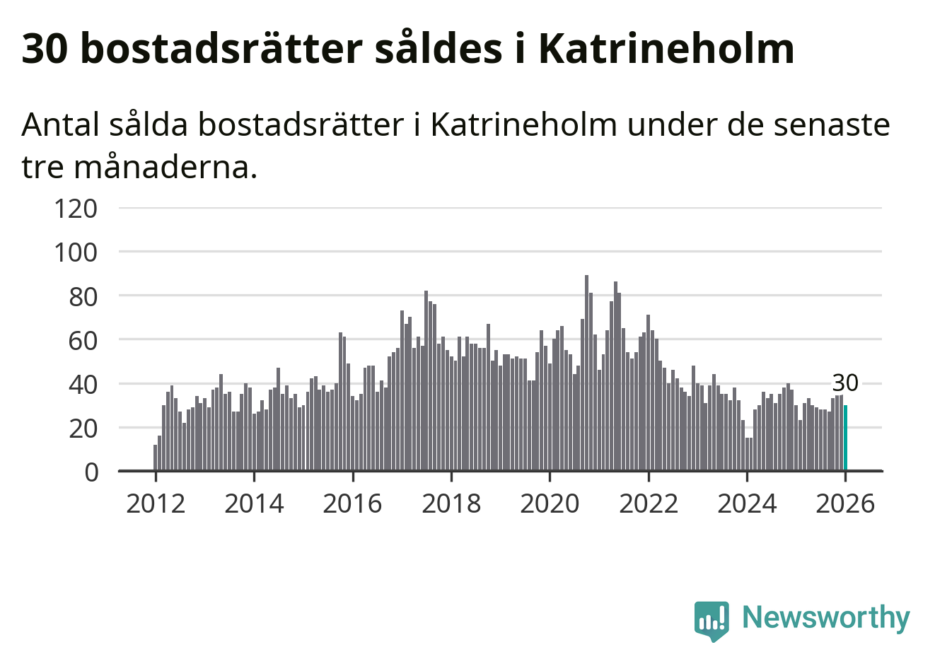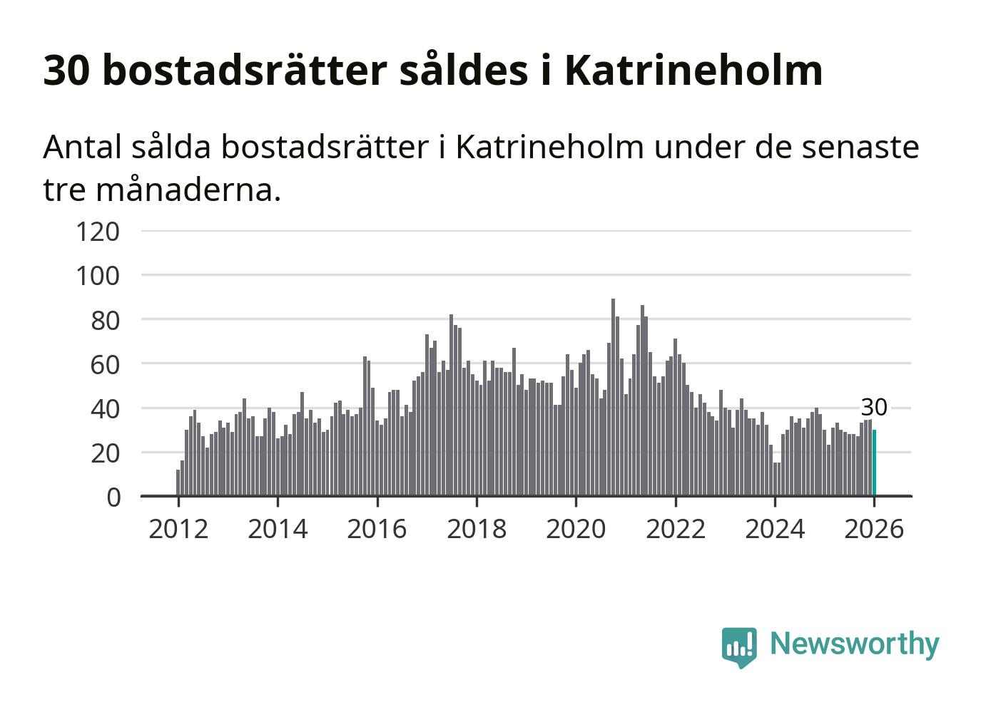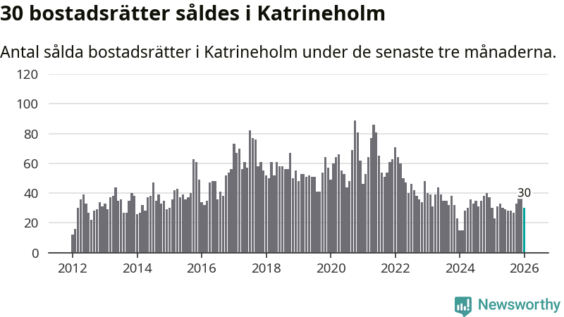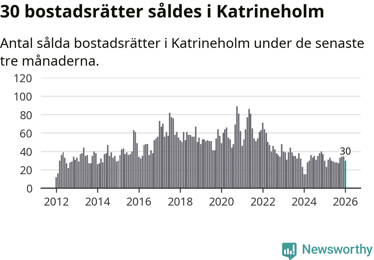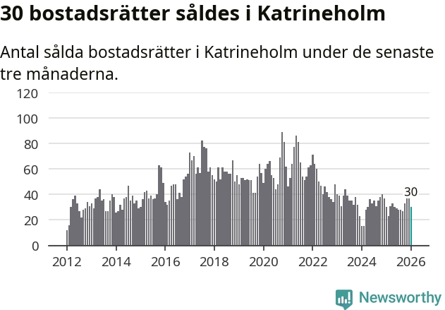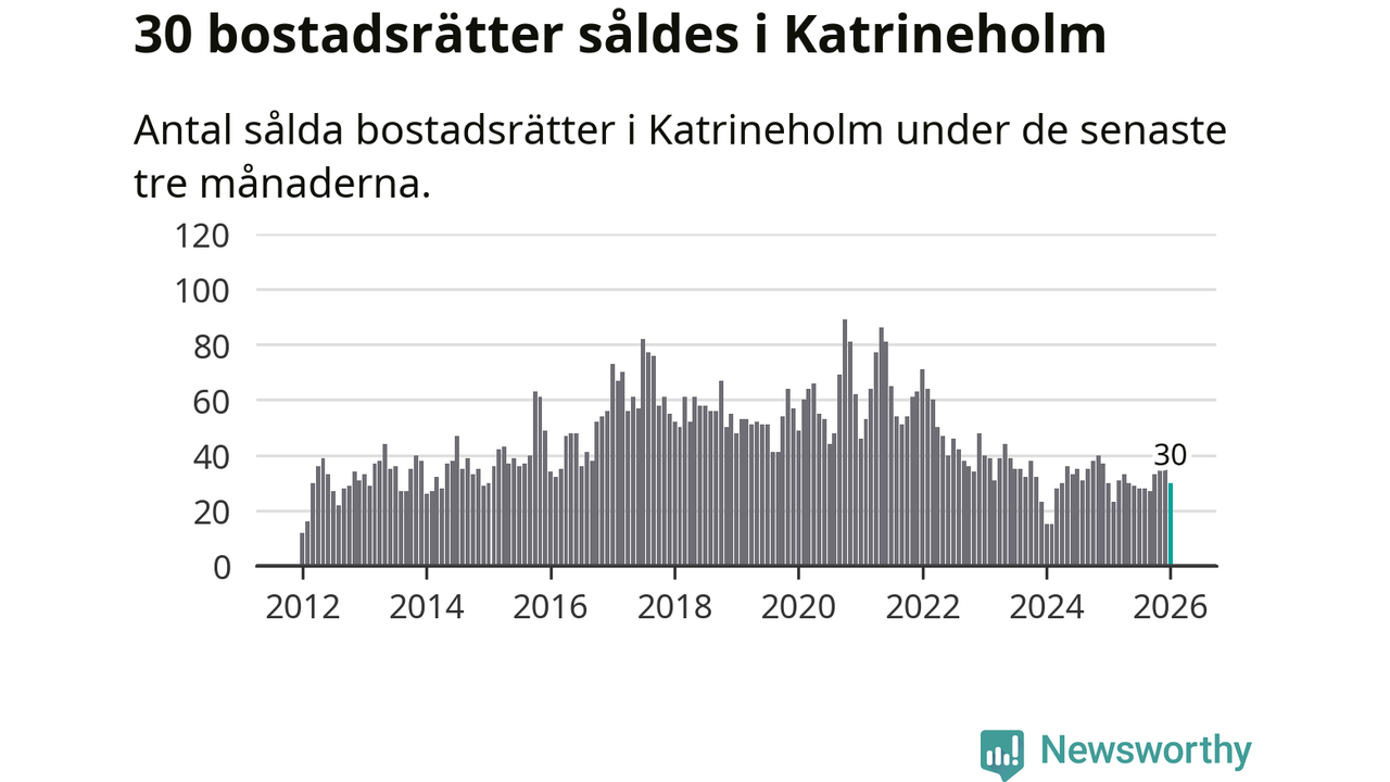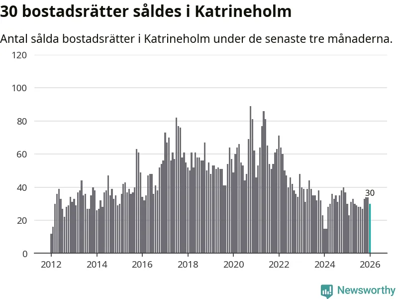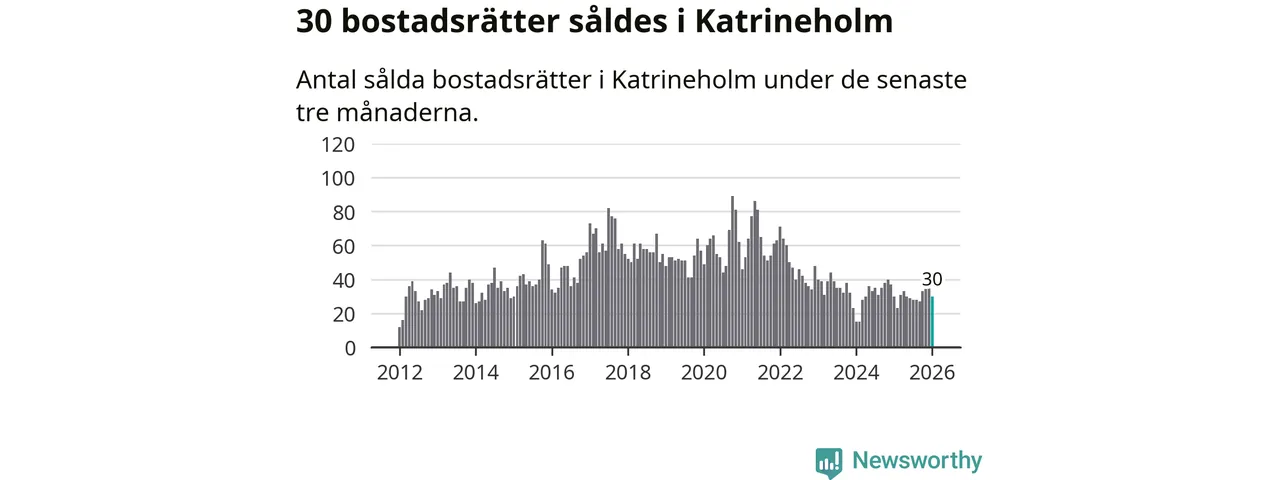 Sammanlagt såldes 30 bostadsrätter i Katrineholms kommun mellan november och januari till ett genomsnittligt pris på 1,2 miljoner kronor. I fjol gjordes 30 affärer vid den här tiden på året.