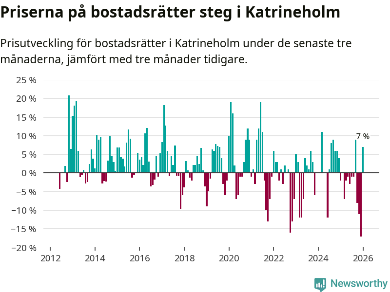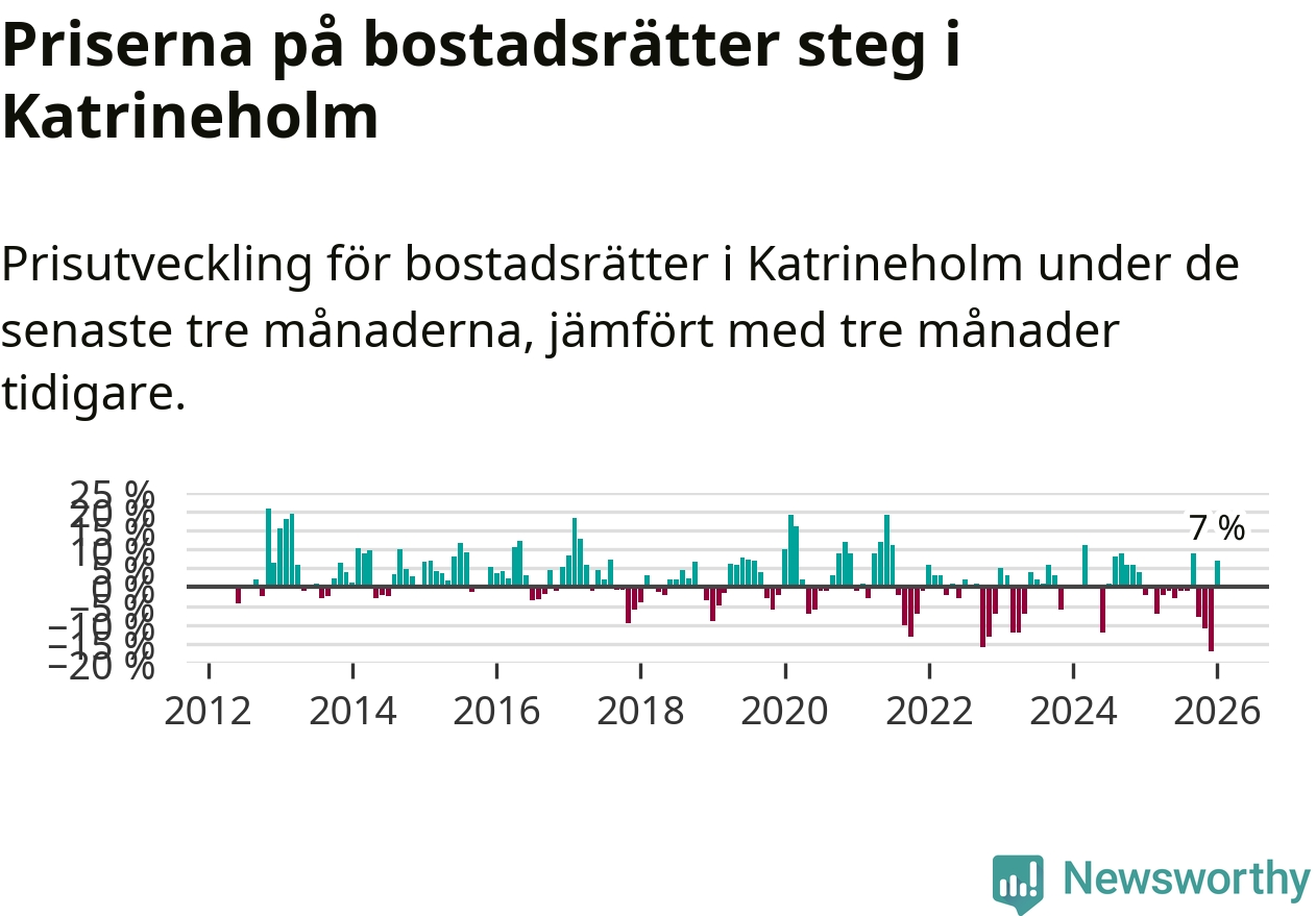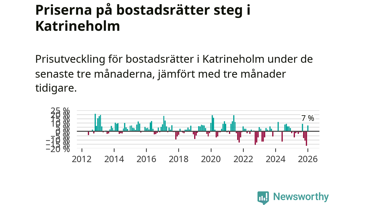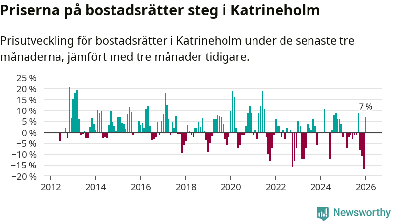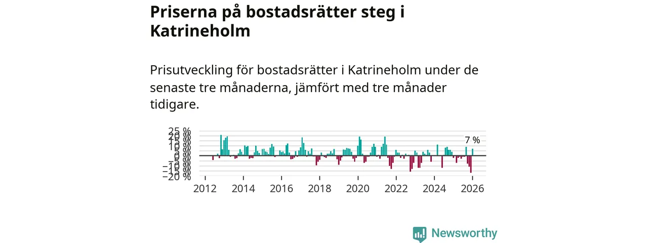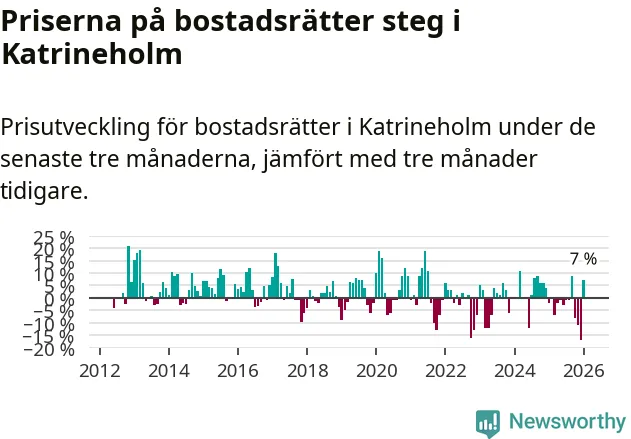 Priserna på bostadsrätter steg mellan november och januari med 7 procent i Katrineholms kommun. Det är en betydande uppgång jämfört med det gångna året då priserna i snitt sjunkit med 3 procent.