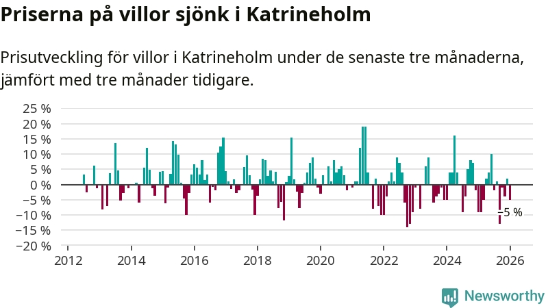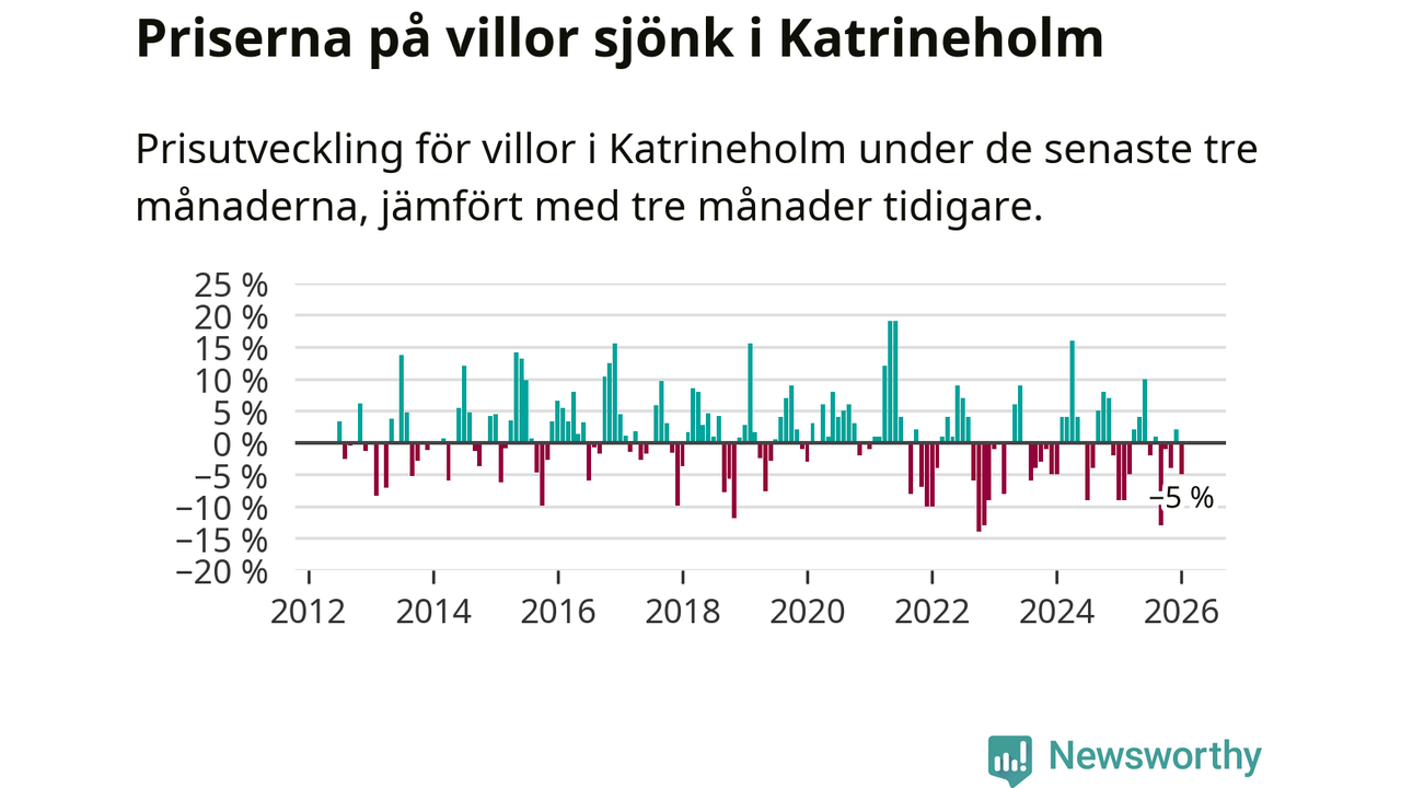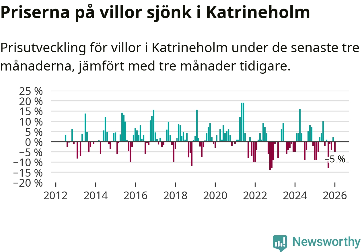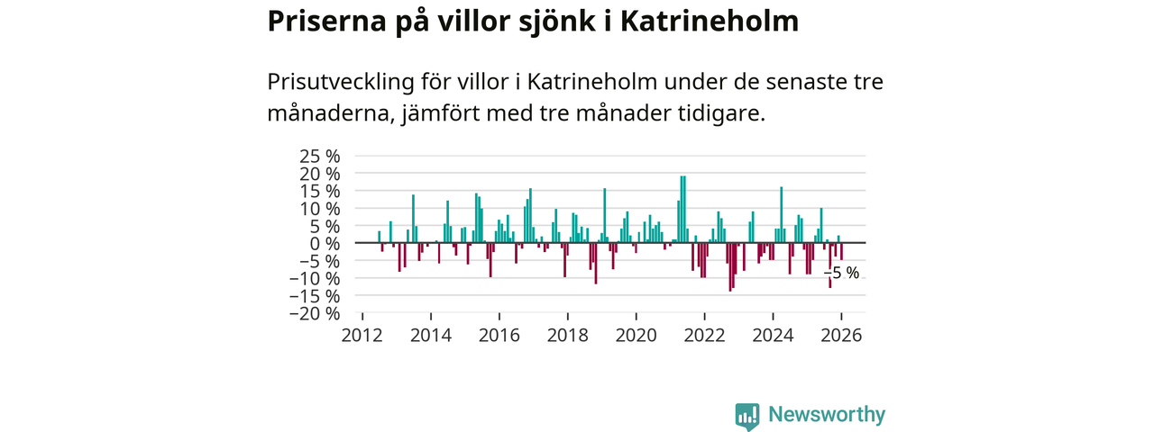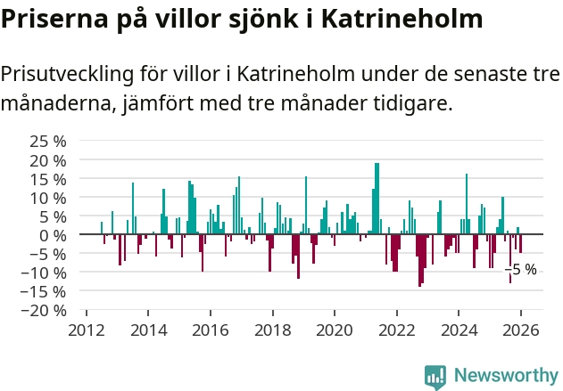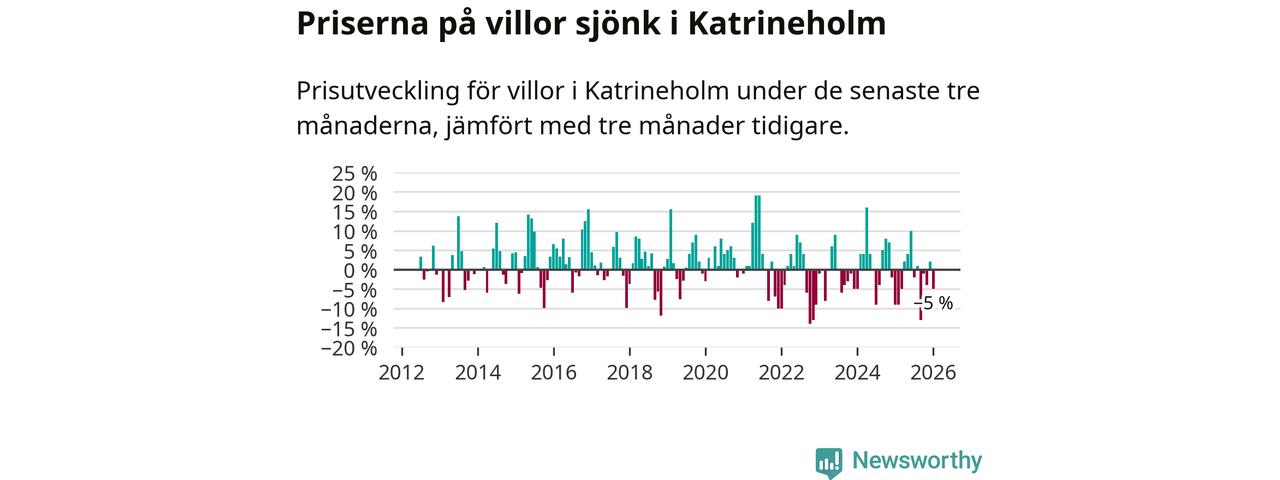 Villapriserna har gått ner i Katrineholms kommun. Medelpriset på försäljningarna under de senaste tre månaderna visar på en nedgång med 5 procent.
