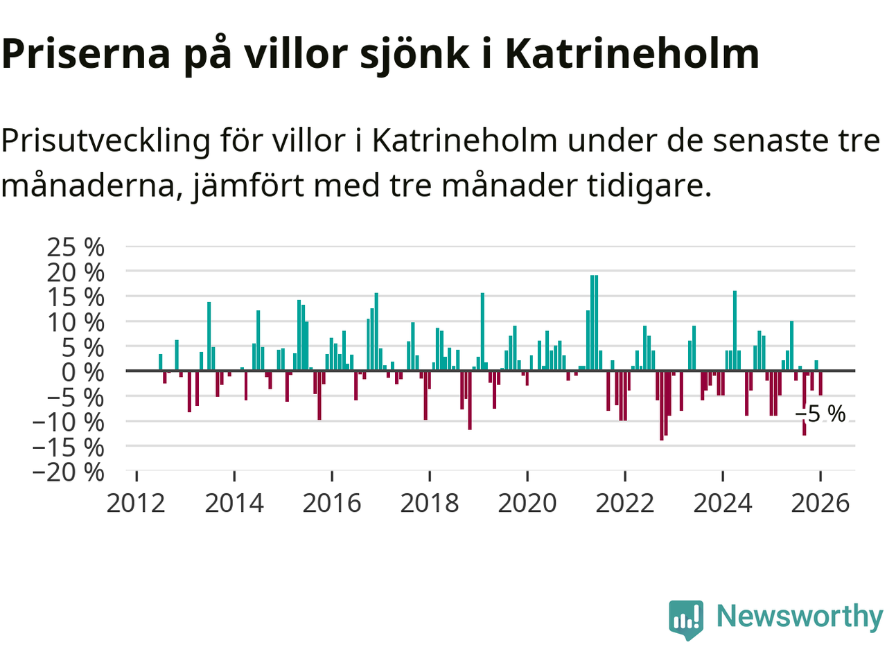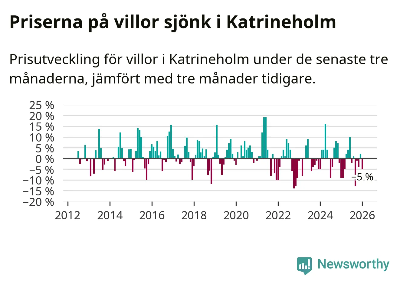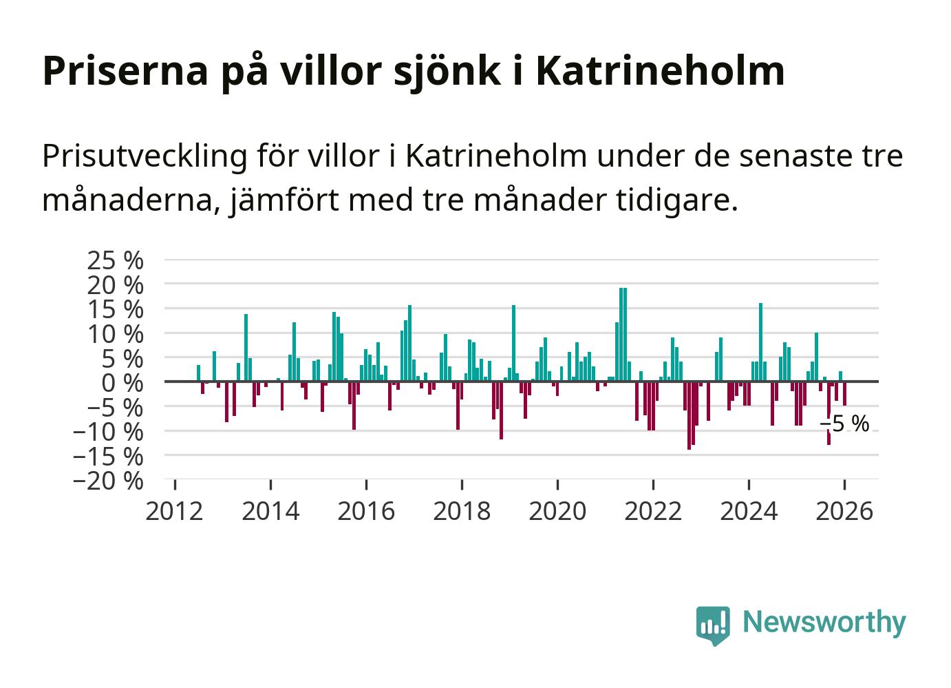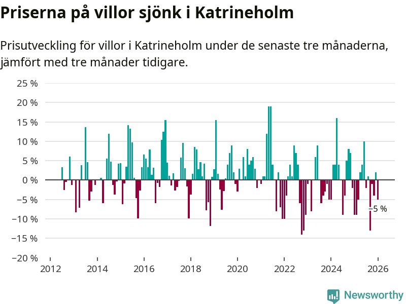 Villapriserna har gått ner i Katrineholms kommun. Medelpriset på försäljningarna under de senaste tre månaderna visar på en nedgång med 5 procent.