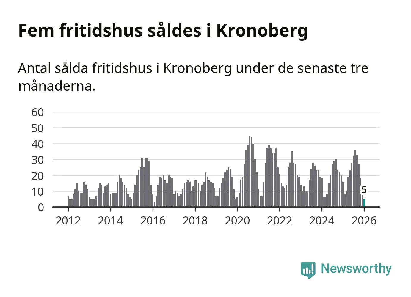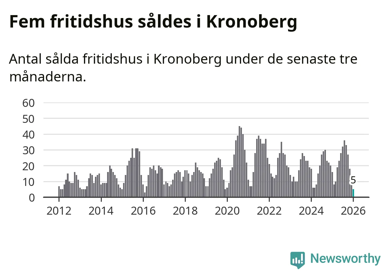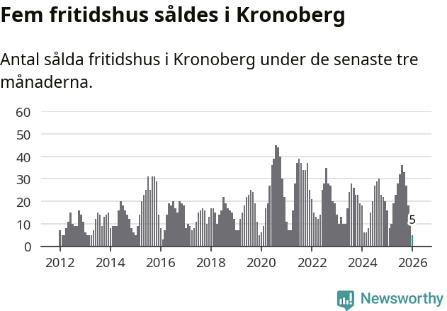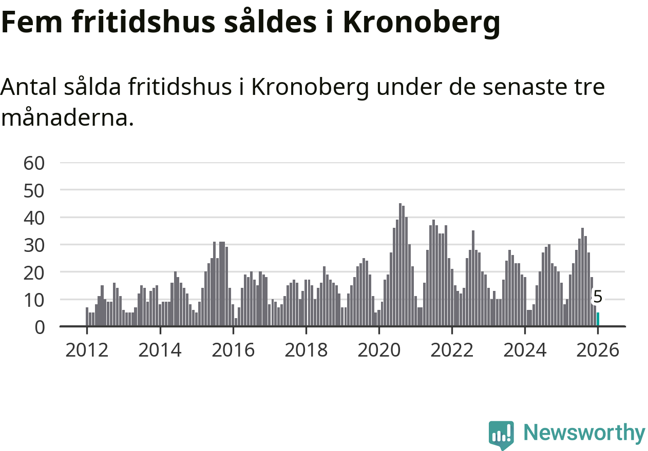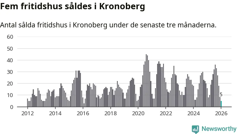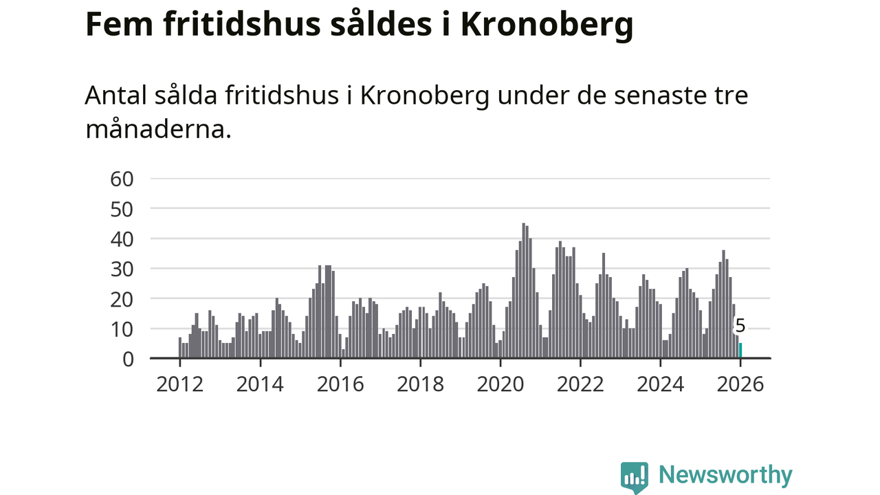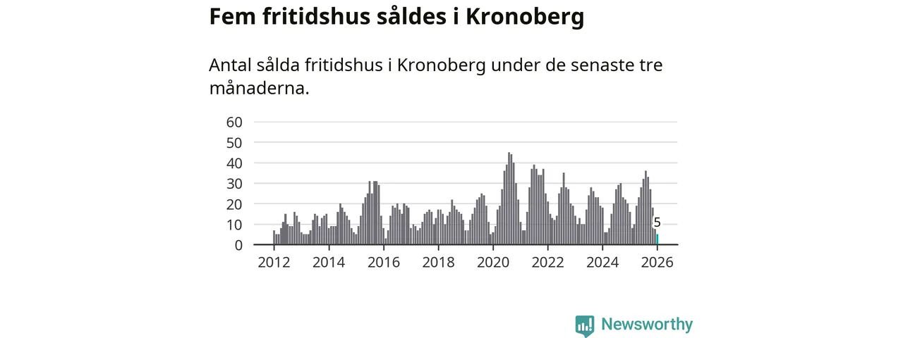 Sammanlagt såldes fem fritidshus i Kronobergs län mellan november 2025 och januari till ett genomsnittligt pris på 0,9 miljoner kronor. Det är fler försäljningar än på sex år. I fjol gjordes 16 affärer vid den här tiden på året.