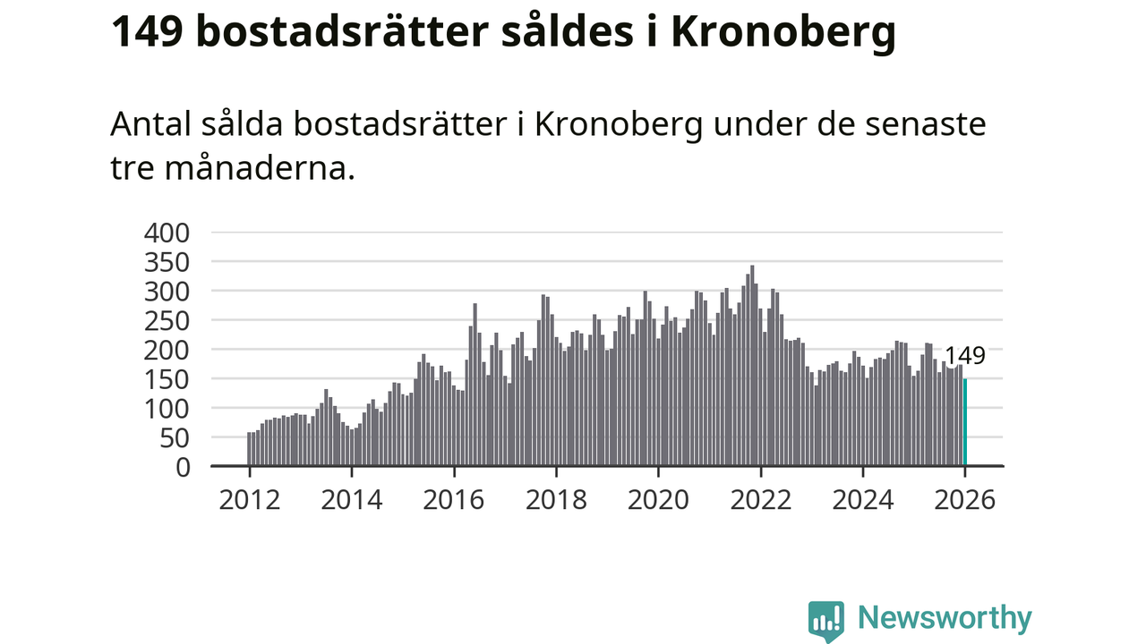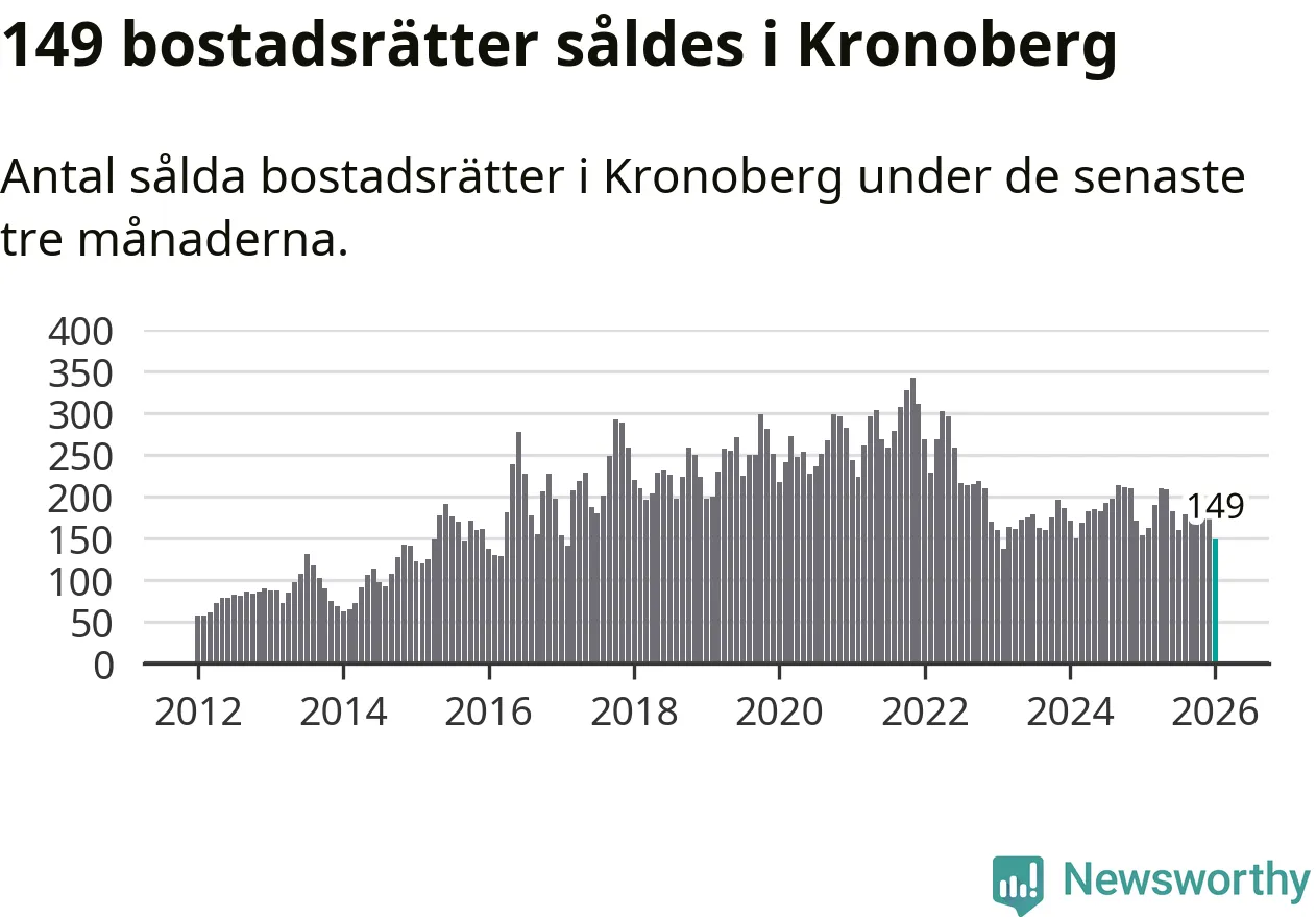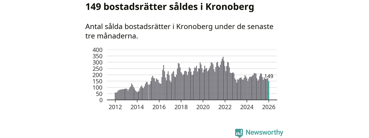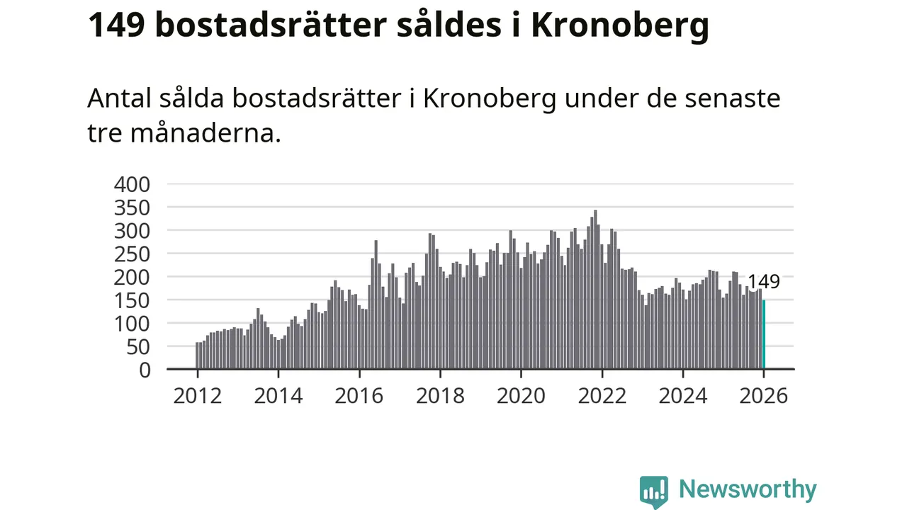 Sammanlagt såldes 149 bostadsrätter i Kronobergs län mellan november och januari till ett genomsnittligt pris på 1,7 miljoner kronor. I fjol gjordes 154 affärer vid den här tiden på året.
