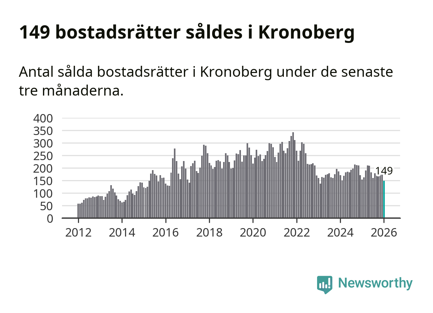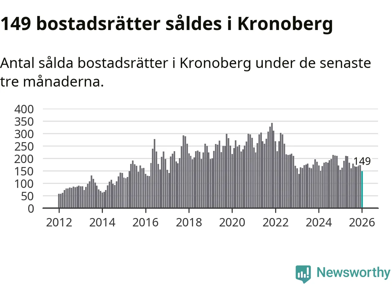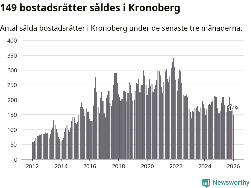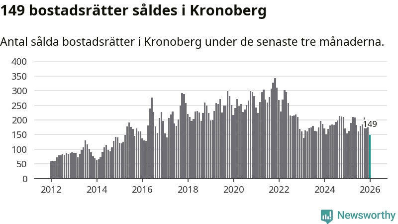 Sammanlagt såldes 149 bostadsrätter i Kronobergs län mellan november och januari till ett genomsnittligt pris på 1,7 miljoner kronor. I fjol gjordes 154 affärer vid den här tiden på året.